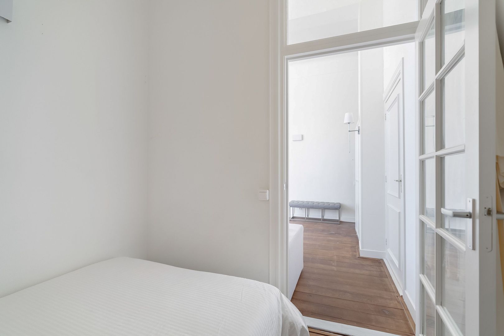 Entree appartement; woonkamer met grote hoge raampartijen en openslaande deuren met Frans balkon (Z-W). Open keuken met diverse ingebouwde apparatuur zoals elektrische kookplaat, afzuigkap, losse onderbouw koelkast en een oven; via de woonkamer deur naar de inpandige slaapkamer; badkamer met douche, wastafel en toilet.