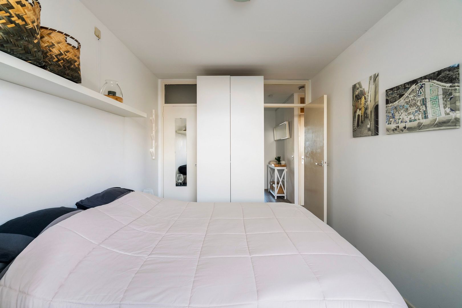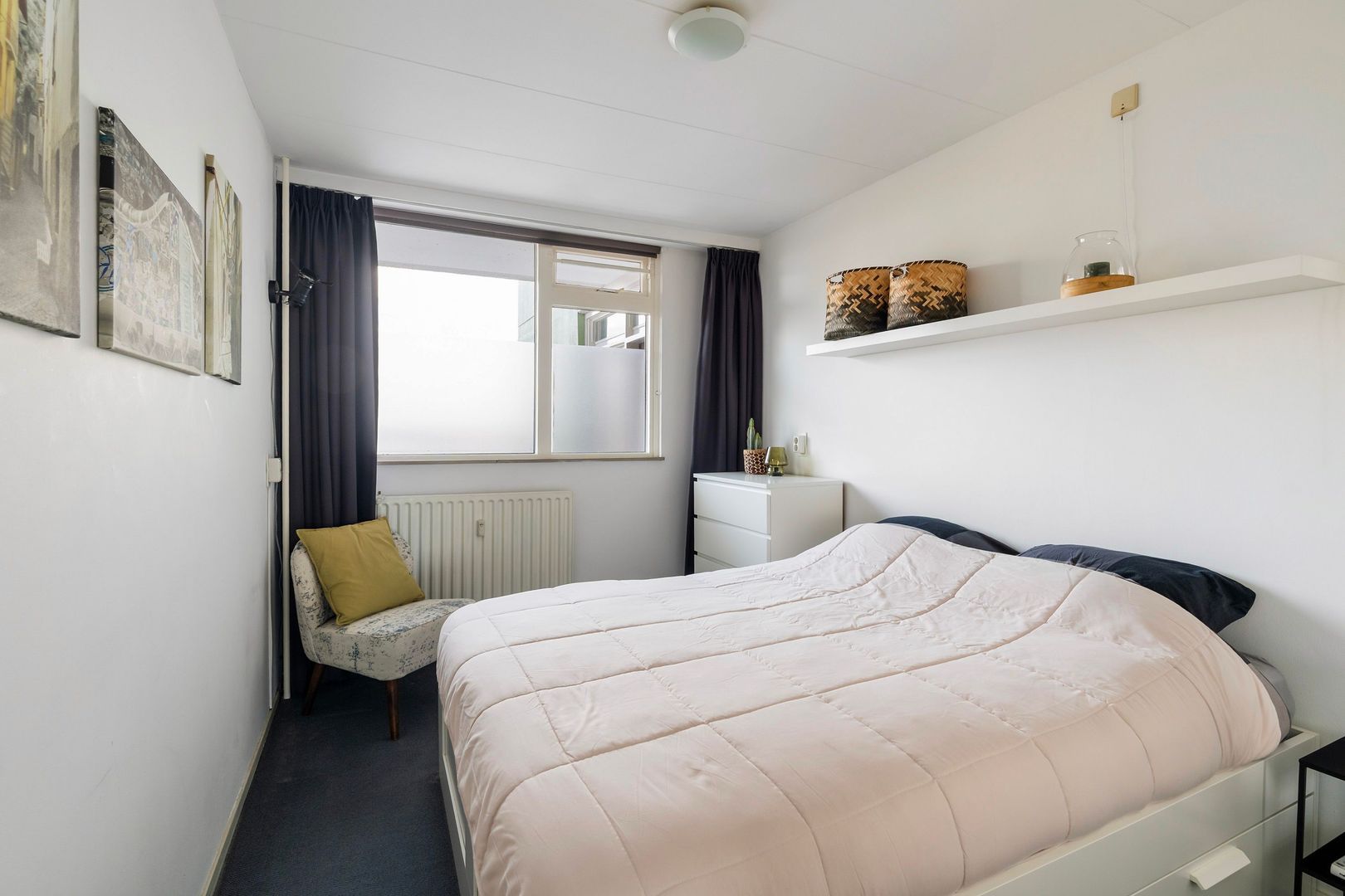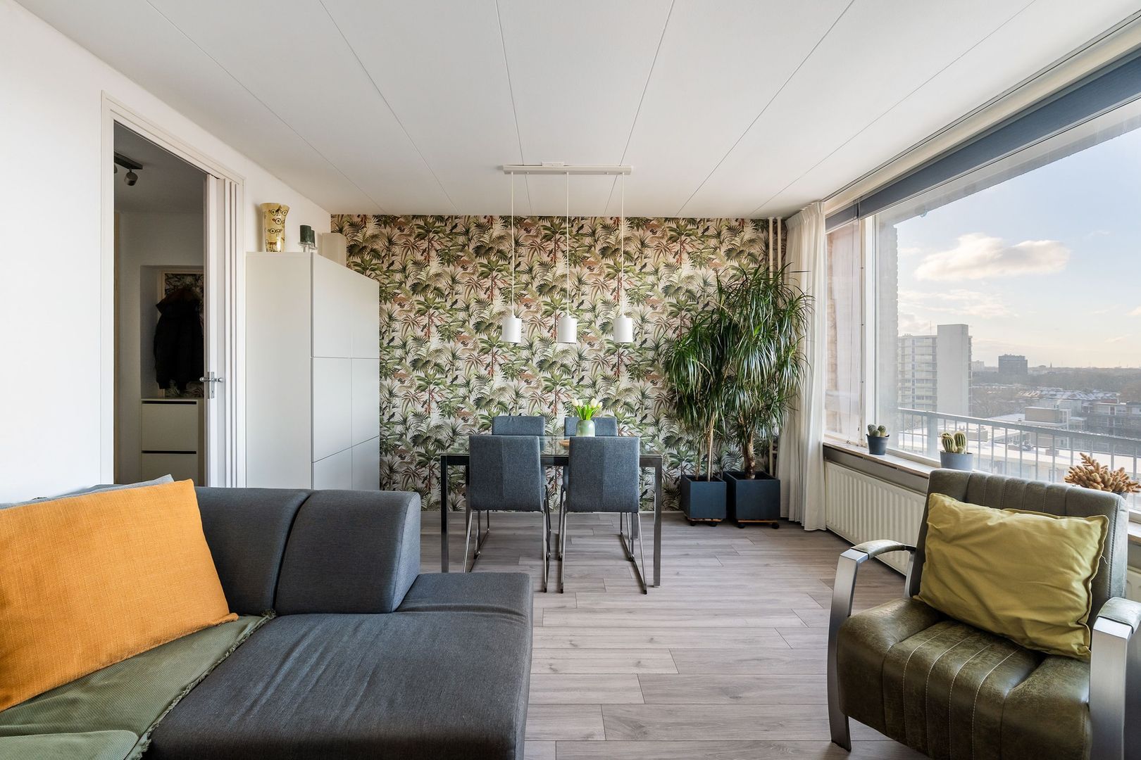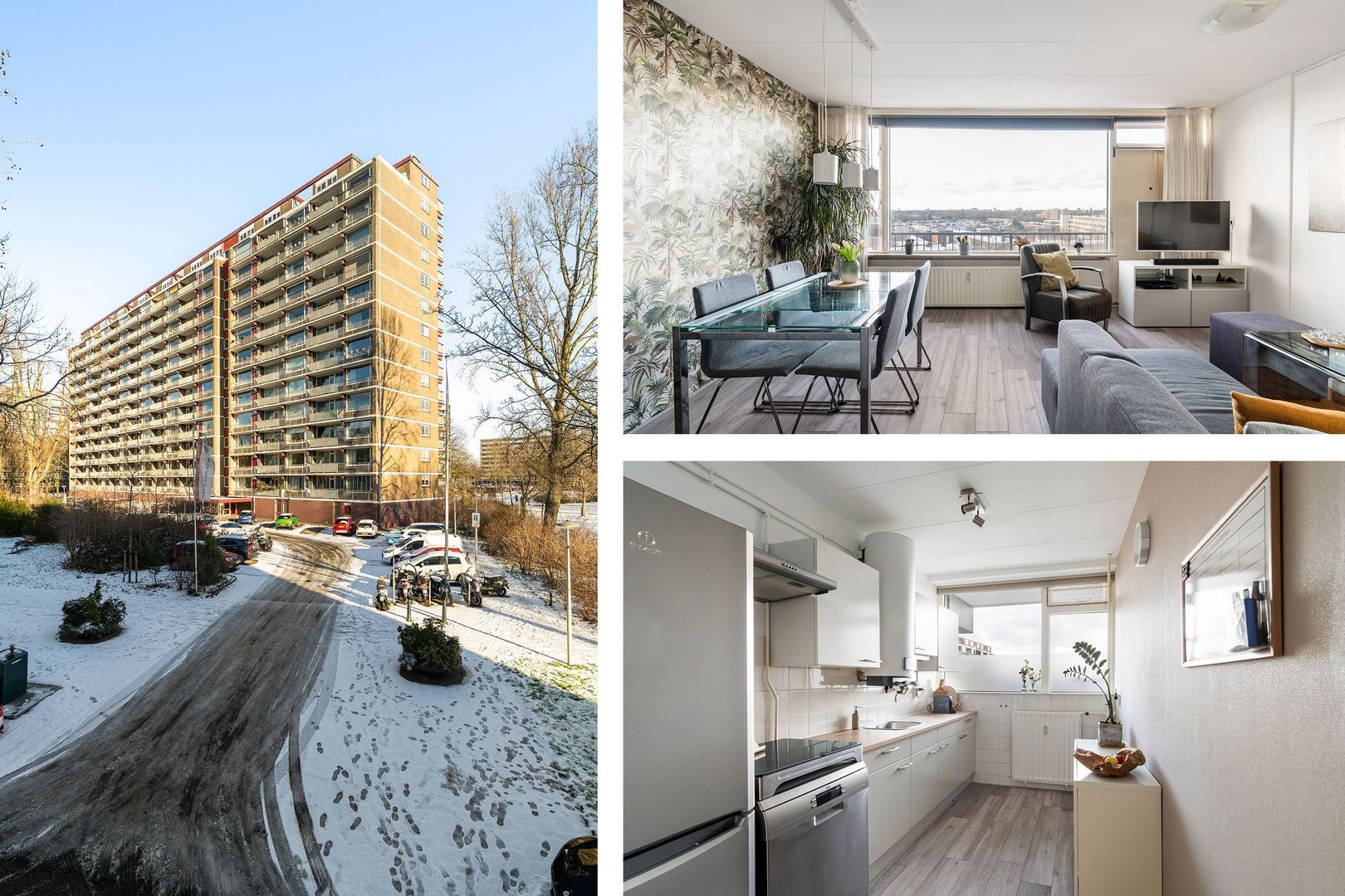 Afgesloten entree met bellentableau, trappenhuis en lift naar 9e etage; woningentree; hal met de meterkast en een grote vaste kast; woonkamer met openslaande deuren naar het balkon; nette keuken voorzien van een inductiekookplaat, afzuigkap, koel-vriescombinatie en vaatwasser; ruime slaapkamer met een vaste kast; nette badkamer met een douchecabine, wastafel en de wasmachine aansluiting; net separaat toilet met fonteintje;