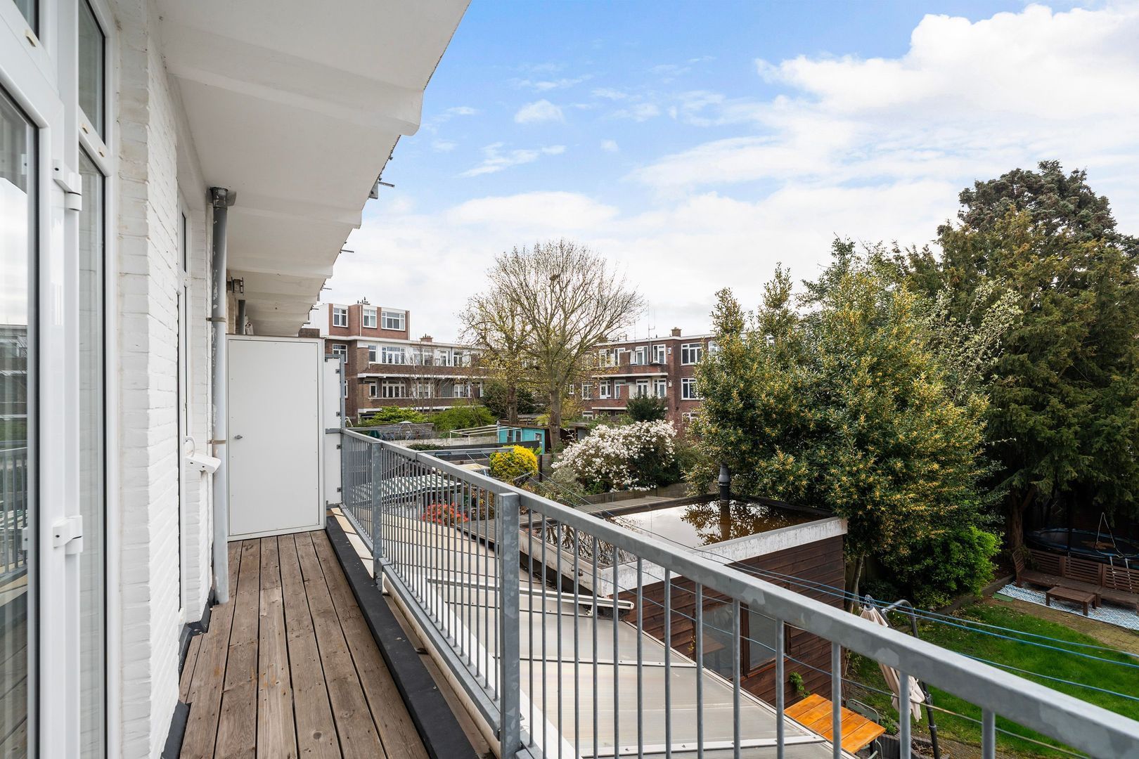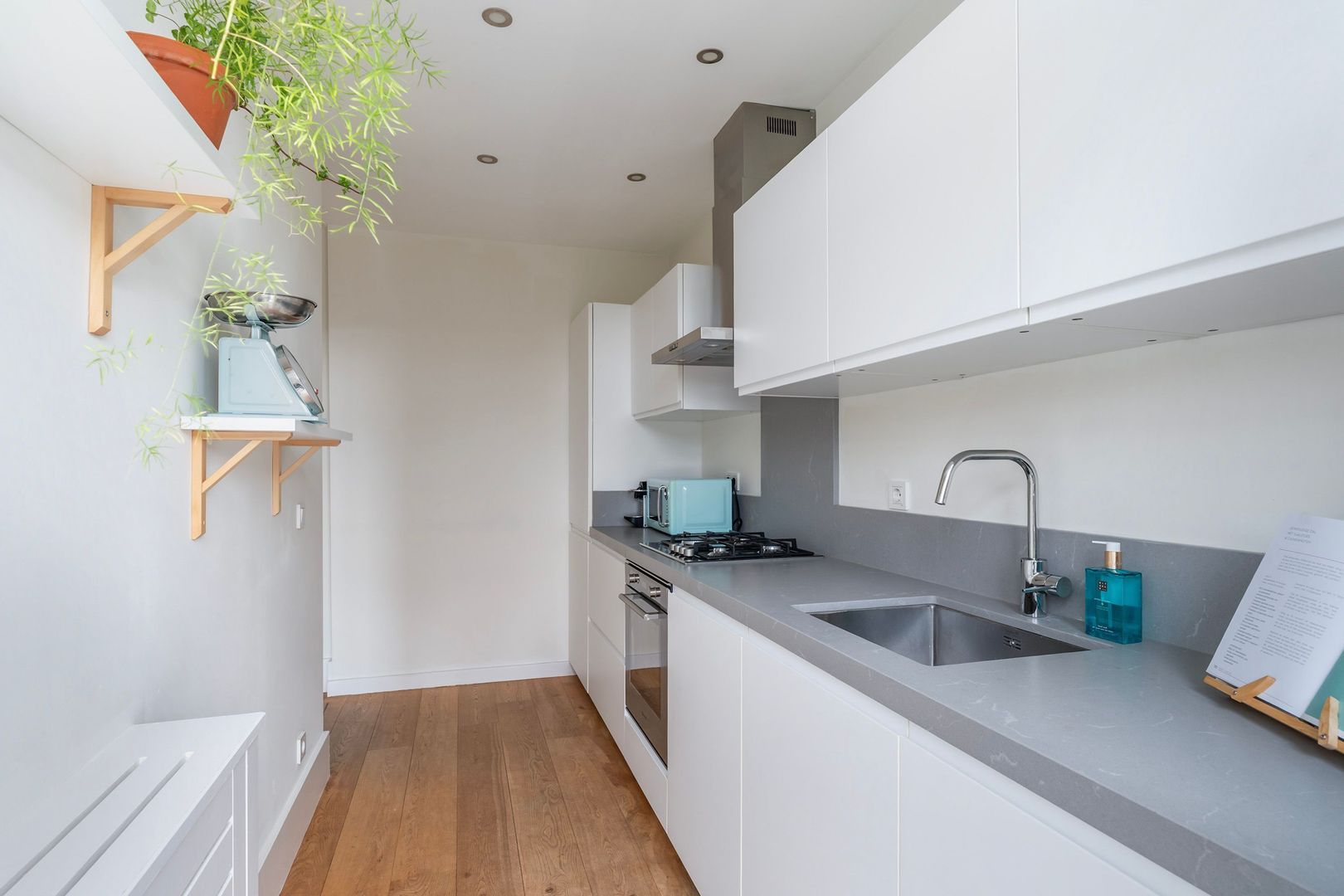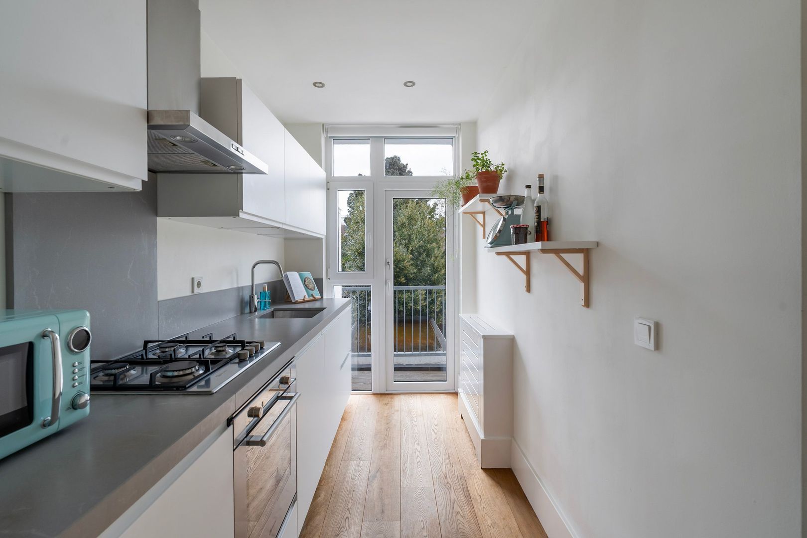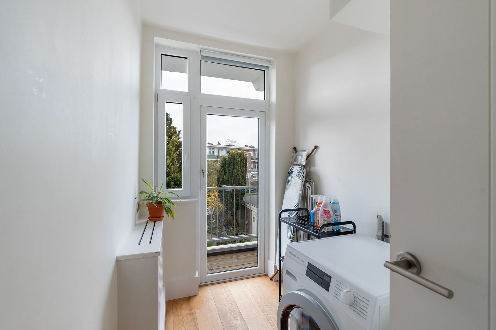 Woningentree; hal met meterkast; woonkamer gelegen aan de voorzijde; 1e slaapkamer aan de voorzijde; 2e slaapkamer aan de achterzijde met openslaande deuren naar het balkon met vaste kast; moderne keuken voorzien van inbouwapparatuur waaronder een gaskookplaat, afzuigkap, oven, koelkast, vriezer, vaatwasser en toegang tot het balkon; moderne badkamer met dubbele wastafelmeubel, inloopdouche en handdoekradiator; separaat toilet (wandcloset) met fonteintje; bergkamer met wasmachineaansluiting en opstelplaats cv-ketel en toegang tot het balkon.
