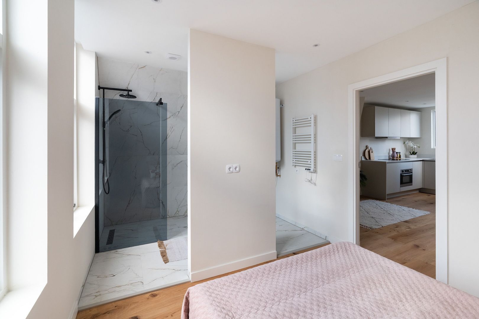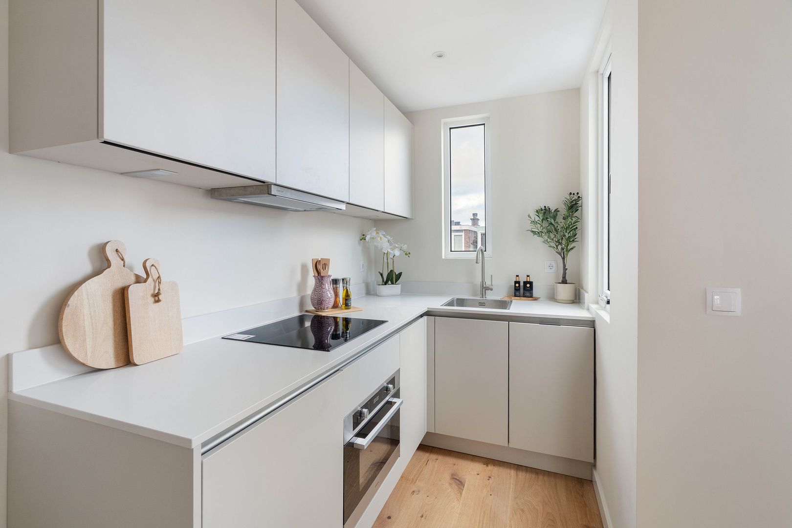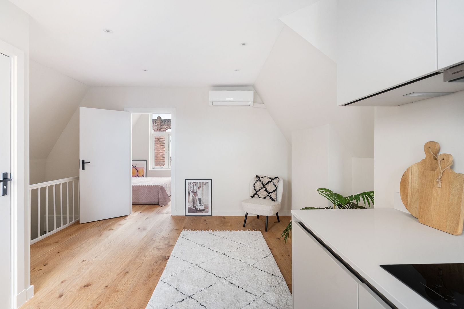 Afgesloten centrale entree met binnentrap naar de woningentree op de 2e verdieping; woonkamer met moderne open keuken in hoekopstelling welke o.a. is voorzien van een inductiekookplaat, afzuigkap en oven; slaapkamer aan de voorzijde met moderne badkamer met een inloopdouche, wastafelmeubel, handdoekradiator en wasmachineaansluiting; modern separaat toilet (wandcloset) met fonteintje; balkon aan de achterzijde