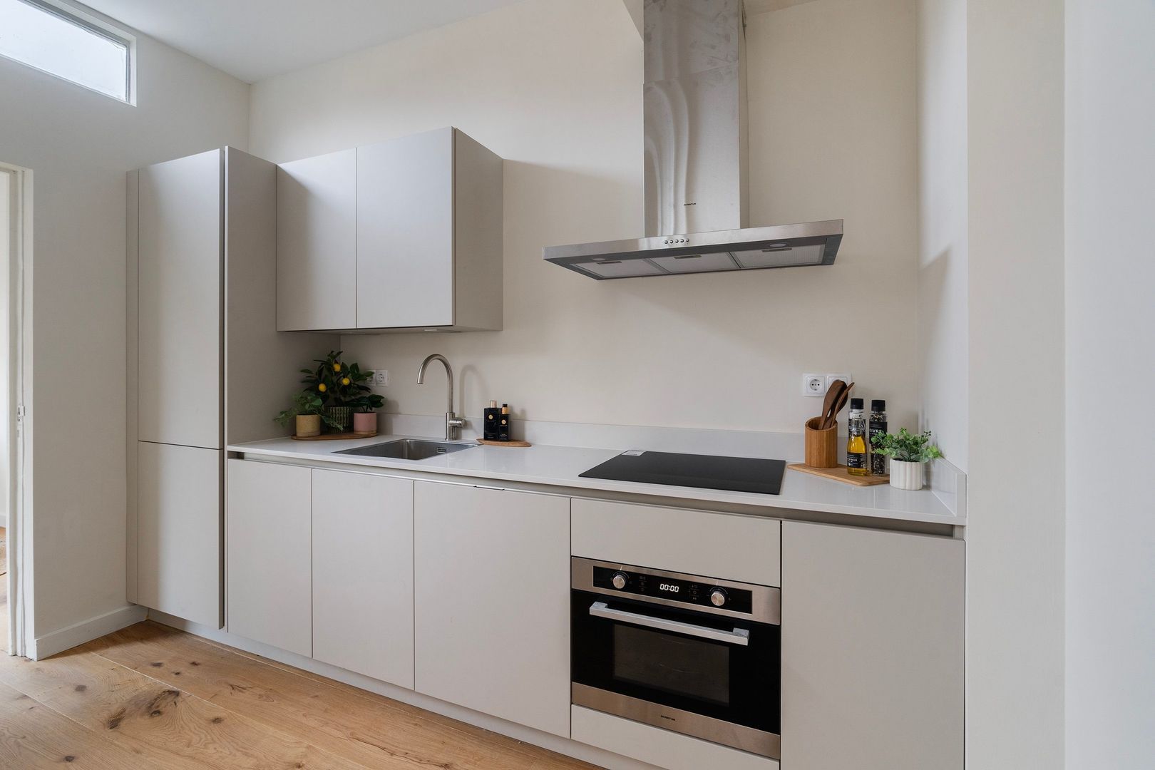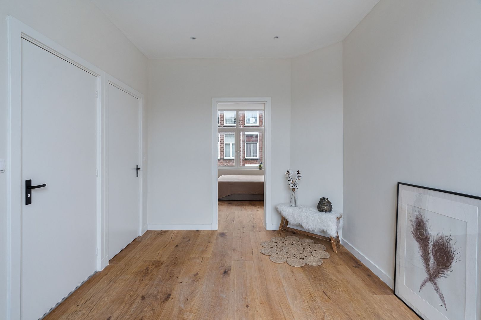 Afgesloten centrale entree met binnentrap naar de woningentree op de 1e verdieping; woonkamer met half open keuken voorzien van een inductiekookplaat, afzuigkap, koel-vriescombinatie, vaatwasser, combimagnetron/-oven en de wasmachine aansluiting; 1e slaapkamer aan de voorzijde; 2e slaapkamer aan de achterzijde met toegang tot het ruime terras; moderne badkamer met een inloopdouche, wastafelmeubel, handdoekradiator en wasmachineaansluiting; modern separaat toilet (wandcloset) met fonteintje;