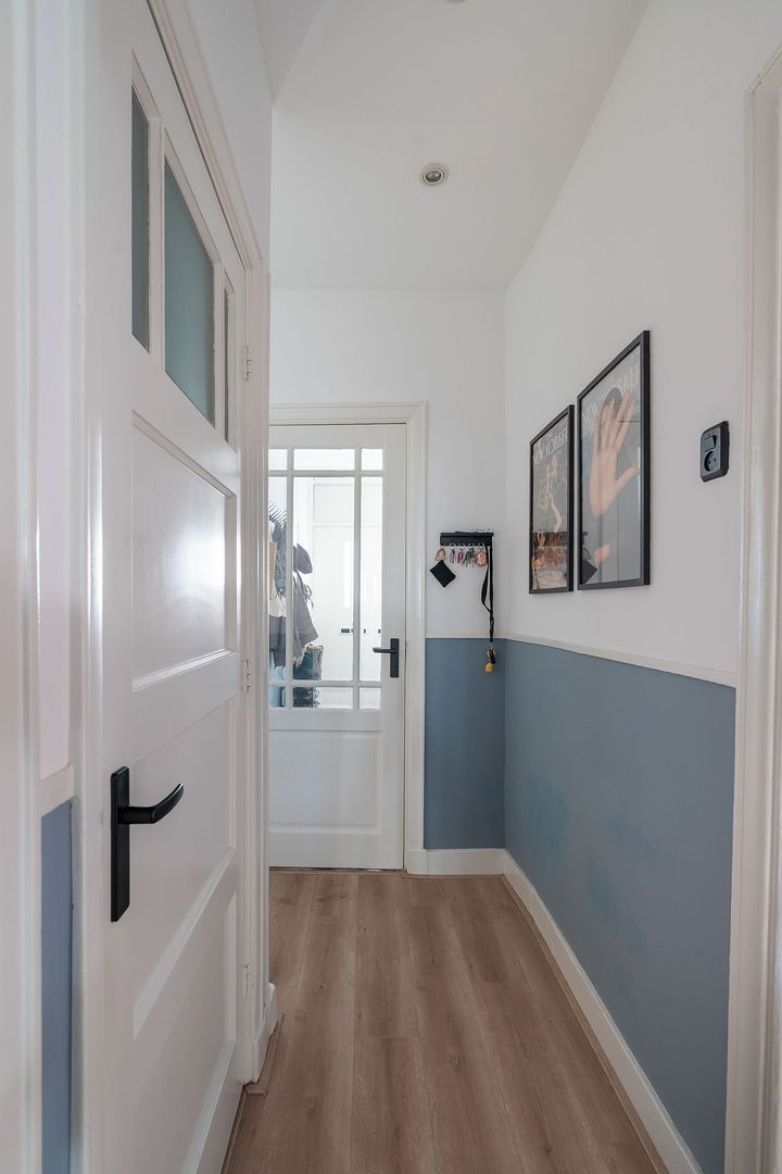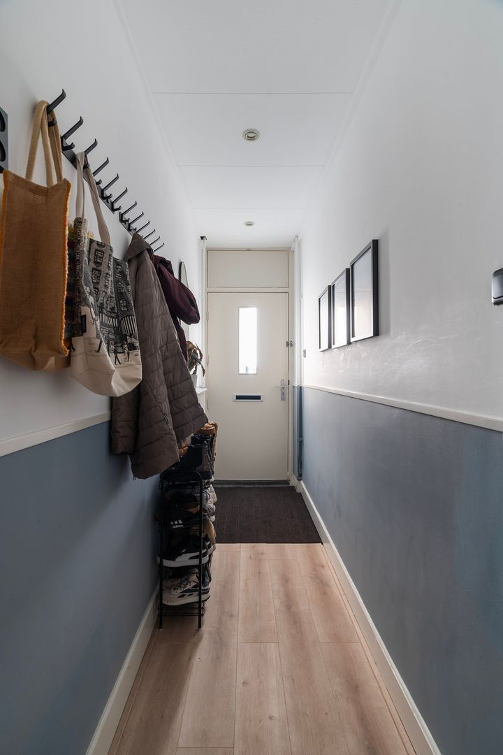 Entree hal; gang met diepe kast met meterkast; modern toilet met fonteintje; riante doorgebroken woon/eetkamer met 2 vaste kasten, radiatoren met lambrisering en aan de achterzijde de toegang tot de tuin met overkapping, net verzorgde open keuken aan de achterzijde in hoekopstelling met inbouwapparatuur kookplaat met wok brander, afzuigkap, koelkast, combi oven/magnetron, vaatwasser en deur naar de tuin; ruime 1e slaapkamer aan de voorzijde; 2e slaapkamer aan de achterzijde, modern badkamer met inloopdouche en wastafelmeubel; verzorgde achtertuin met overkapping en een houten berging.