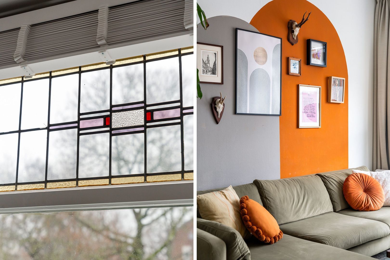 Woningentree; tochtportaal; gang met een vaste kast; woonkamer en suite met een erker, vaste kasten, glas in lood schuifseparatie en openslaande deuren naar de achtertuin; moderne keuken voorzien van een gaskookplaat, afzuigkap, koel-vriescombinatie, oven, vaatwasser en deur naar de achtertuin; 1e slaapkamer aan de voorzijde; 2e slaapkamer aan de achterzijde met openslaande deuren naar de achtertuin; moderne badkamer met een inloopdouche, wastafelmeubel en wasmachineaansluiting; modern separaat toilet (wandcloset) met fonteintje;
