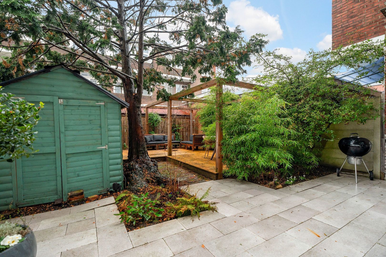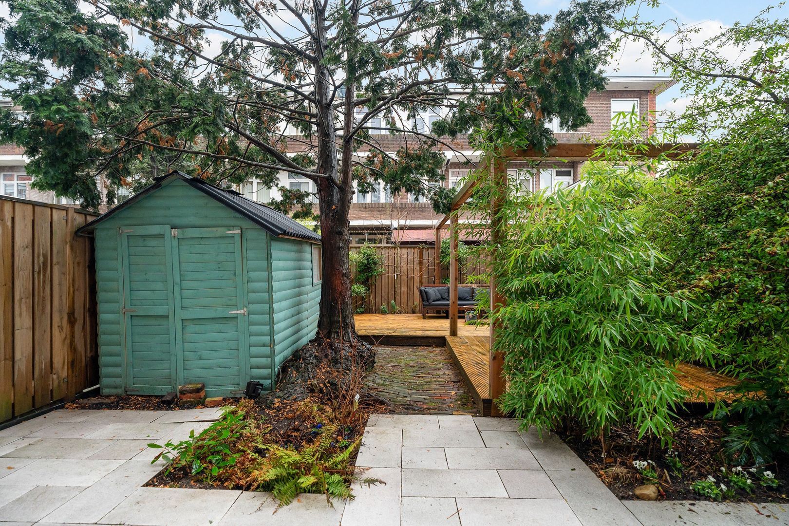 Fraai aangelegde groene achtertuin met een fraai vlonder terras, pergola en een vrijstaande berging.