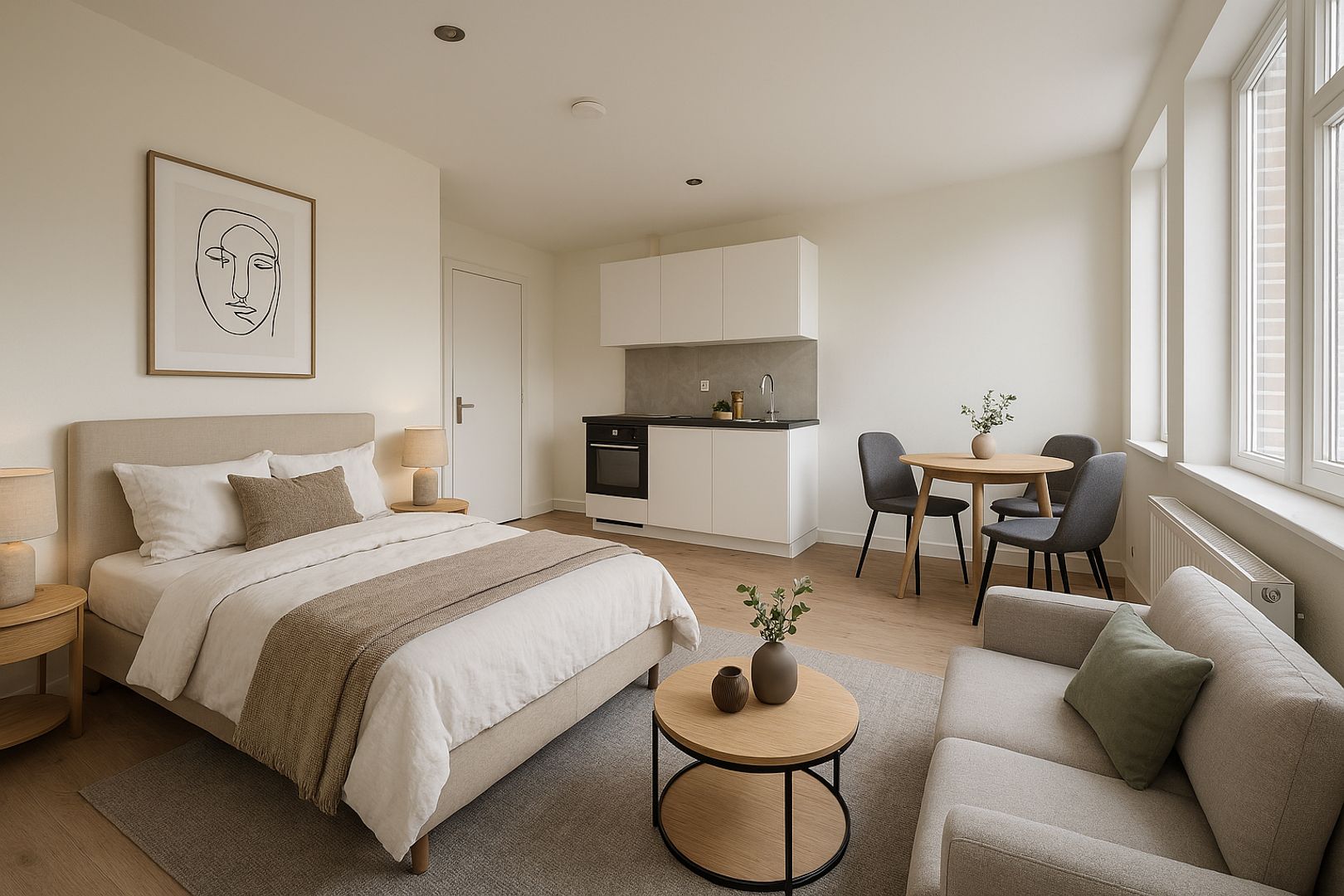 Centrumrand. In een complex met 28 kleine appartementen ligt dit 1e etage appartement aan de achterzijde. Het appartement heeft 1 kamer, een nieuwe open keuken met ingebouwde apparatuur, een nieuwe badkamer, nieuw laminaat en schilderwerk. Het betreft een complex met woningen die uit de huursector komen. Binnenkort wordt een warmtepomp aangesloten in het kader van verduurzaming.