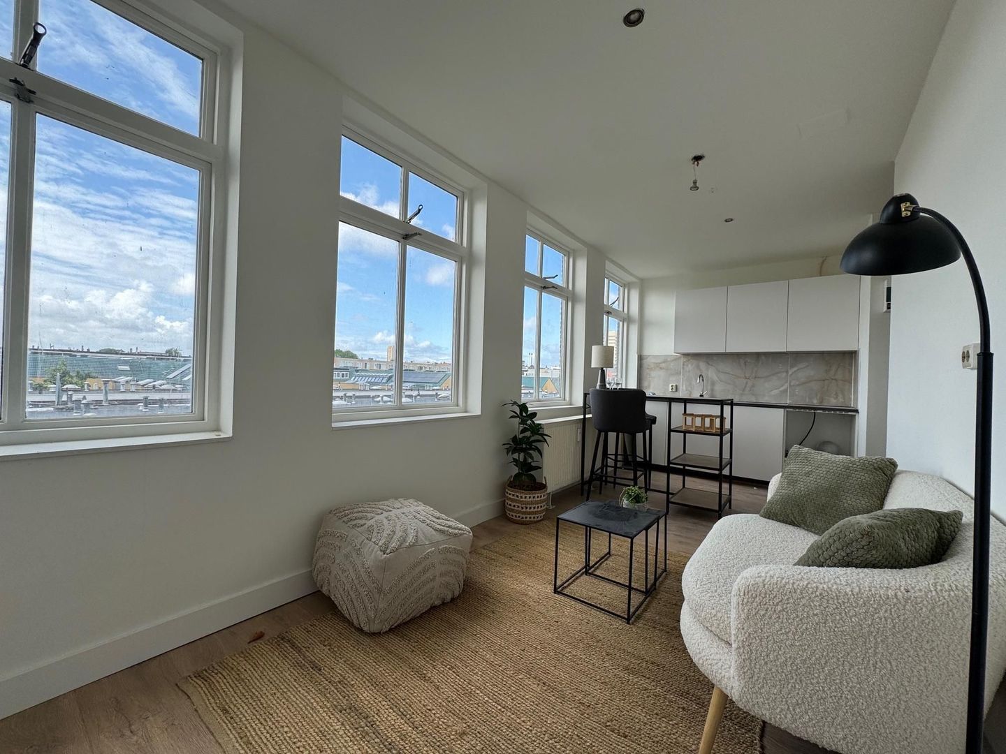 Centraal entree op de begane grond; binnentrap naar de 2e etage; gang met toegang tot het appartement. Woonkamer over de volle breedte met drie ramen, een modern keukenblok met ingebouwde koelkast, inductie kookplaat, afzuigkap, en combioven. Mogelijkheid voor inpandige (slaap)kamer. Betegelde douche, toilet en wastafel.