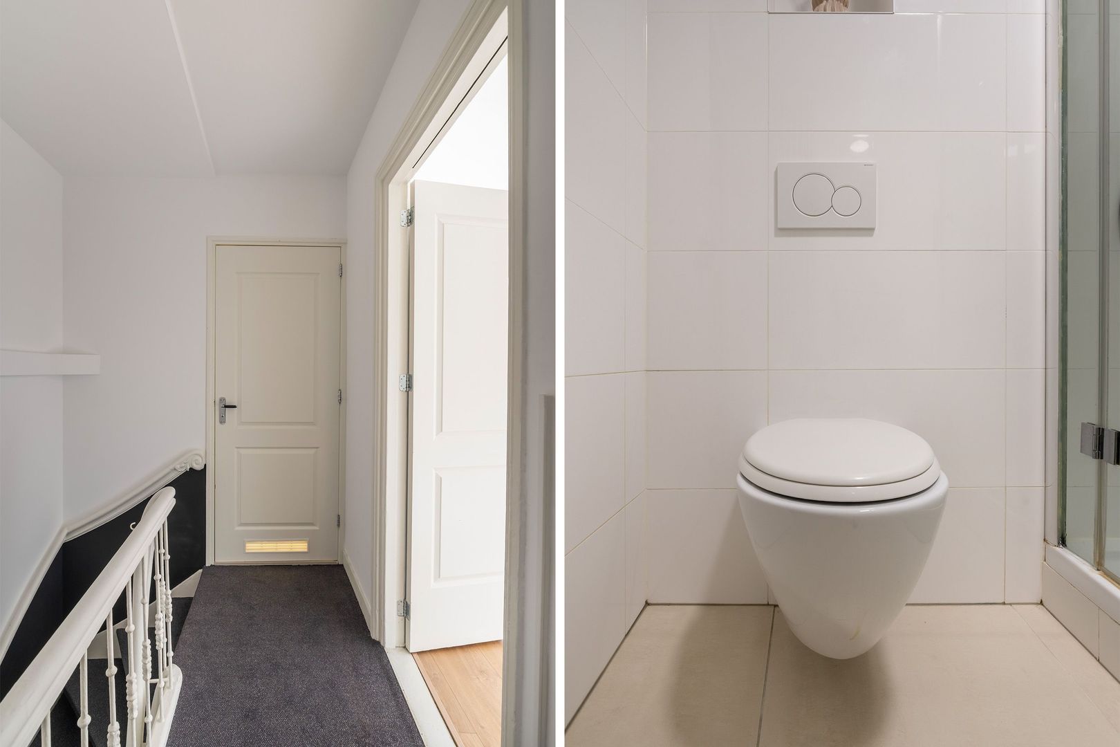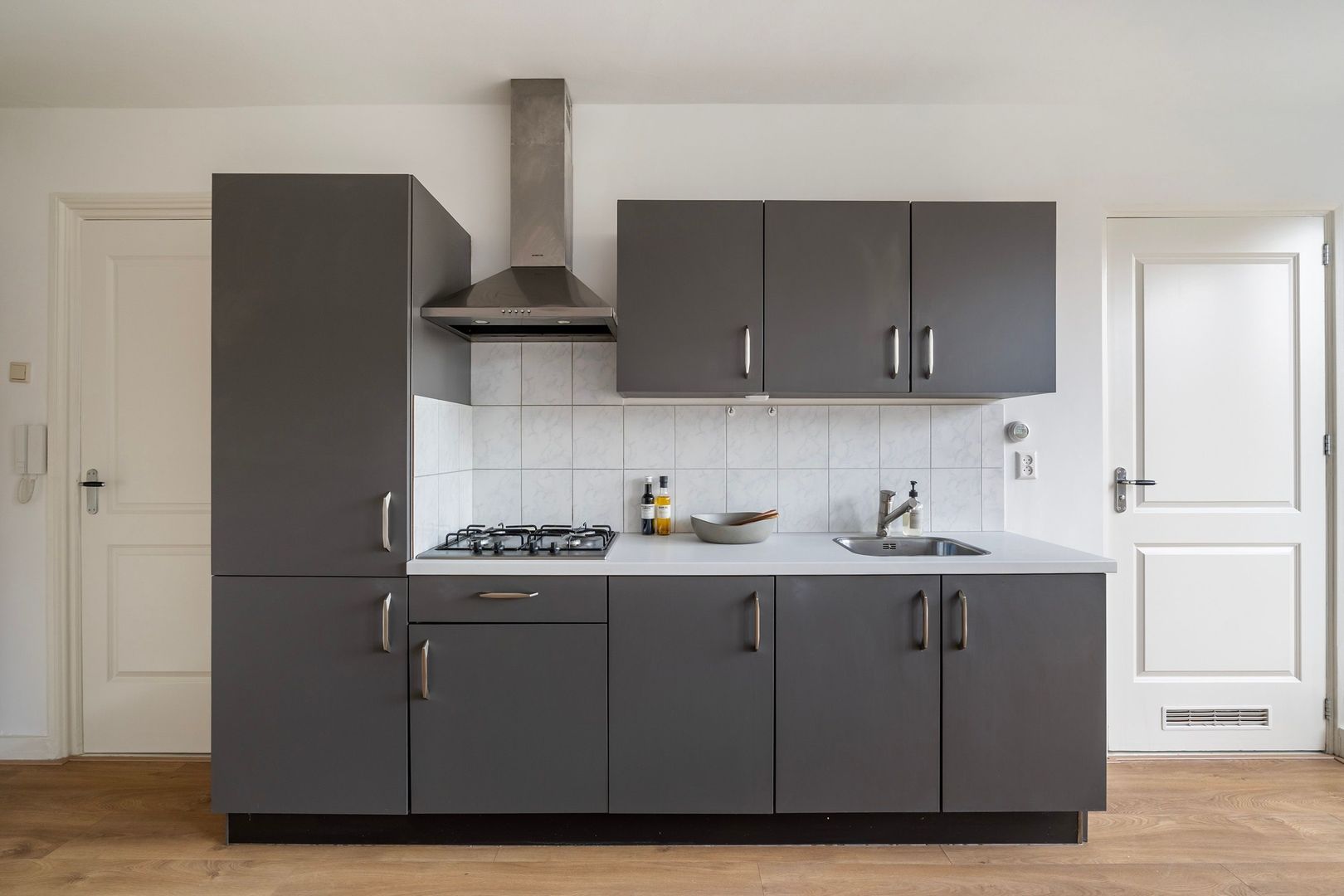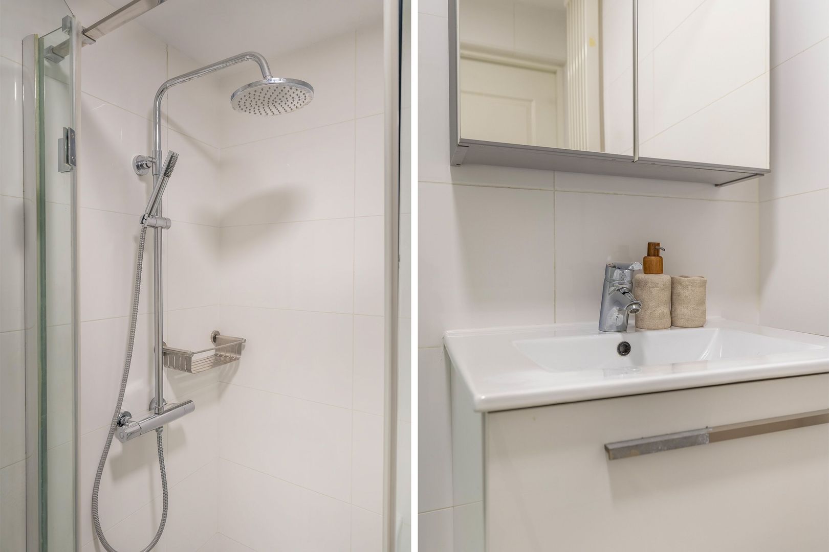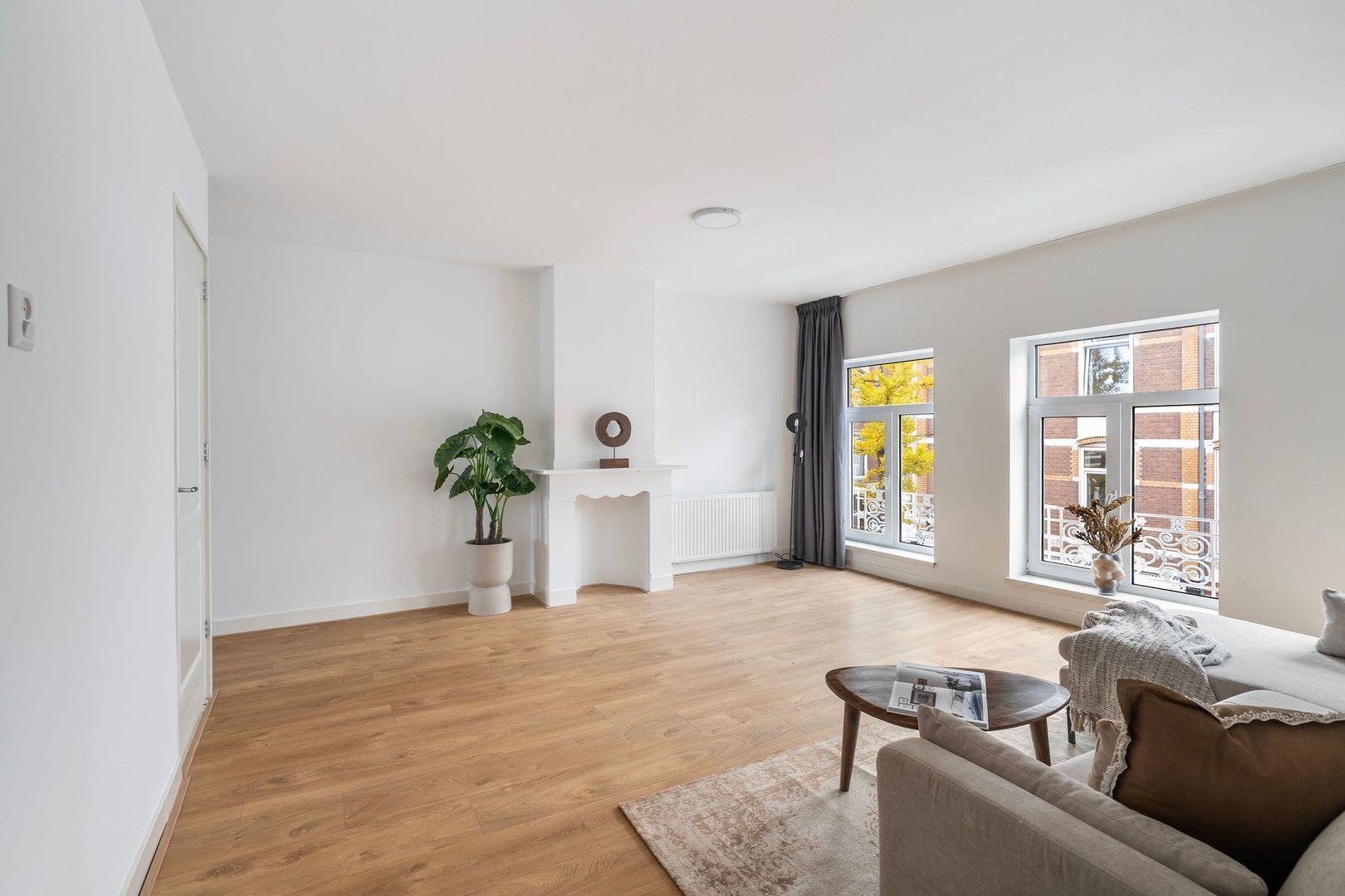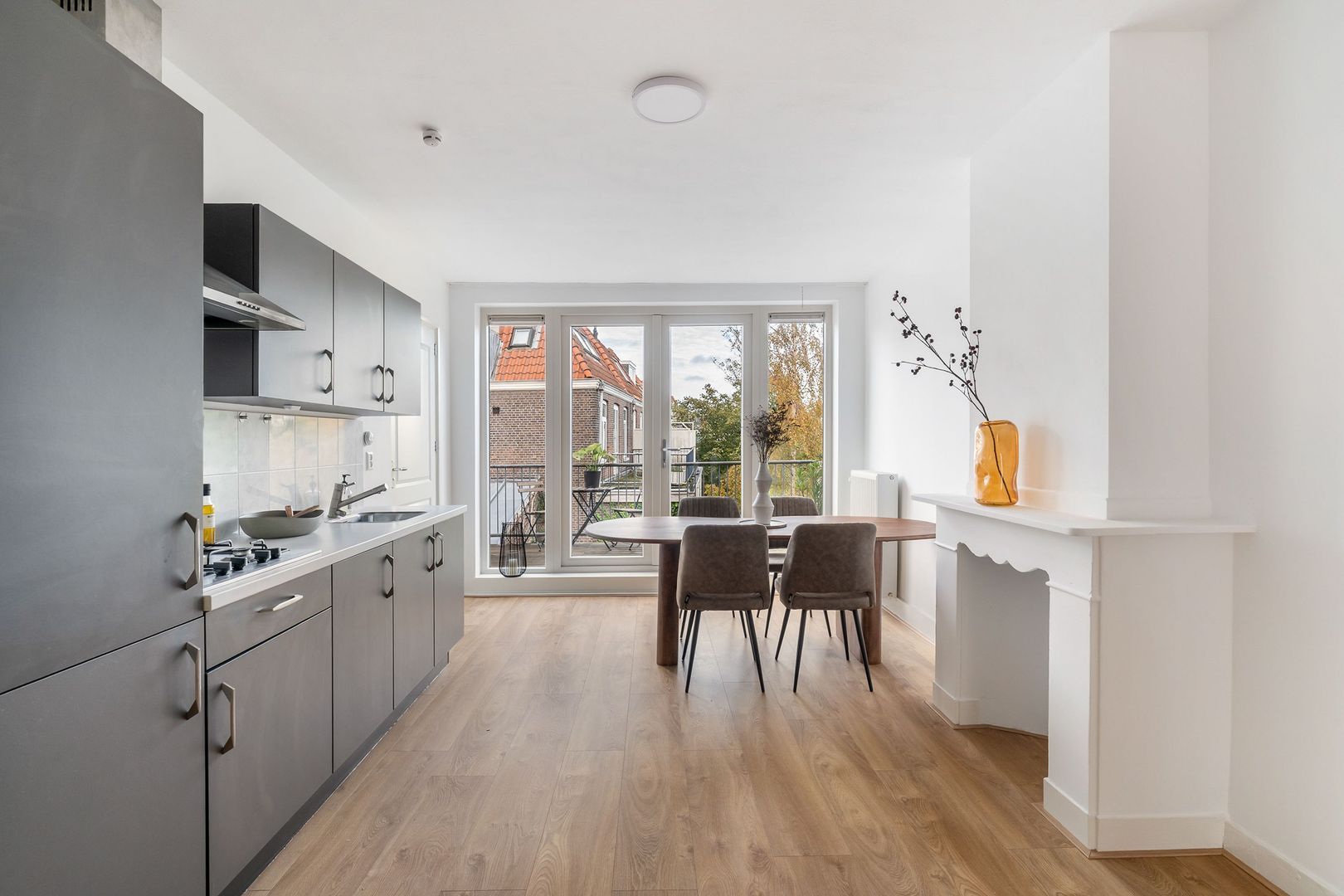 1e etage: Overloop met toegang tot het toilet. Ruime, lichte woonkamer (ca. 5.41 m x 4.07 m) met levendig uitzicht over de straat en een fraaie eiken lamelparketvloer. Aan de achterzijde bevindt zich de open keuken (ca. 5.91 m x 3.64 m) met toegang tot het balkon (ca. 3.64 m x 1.08 m). Op deze verdieping is tevens een badkamer (ca. 2.51 m x 1.68 m) met inloopdouche, wastafel en berging.