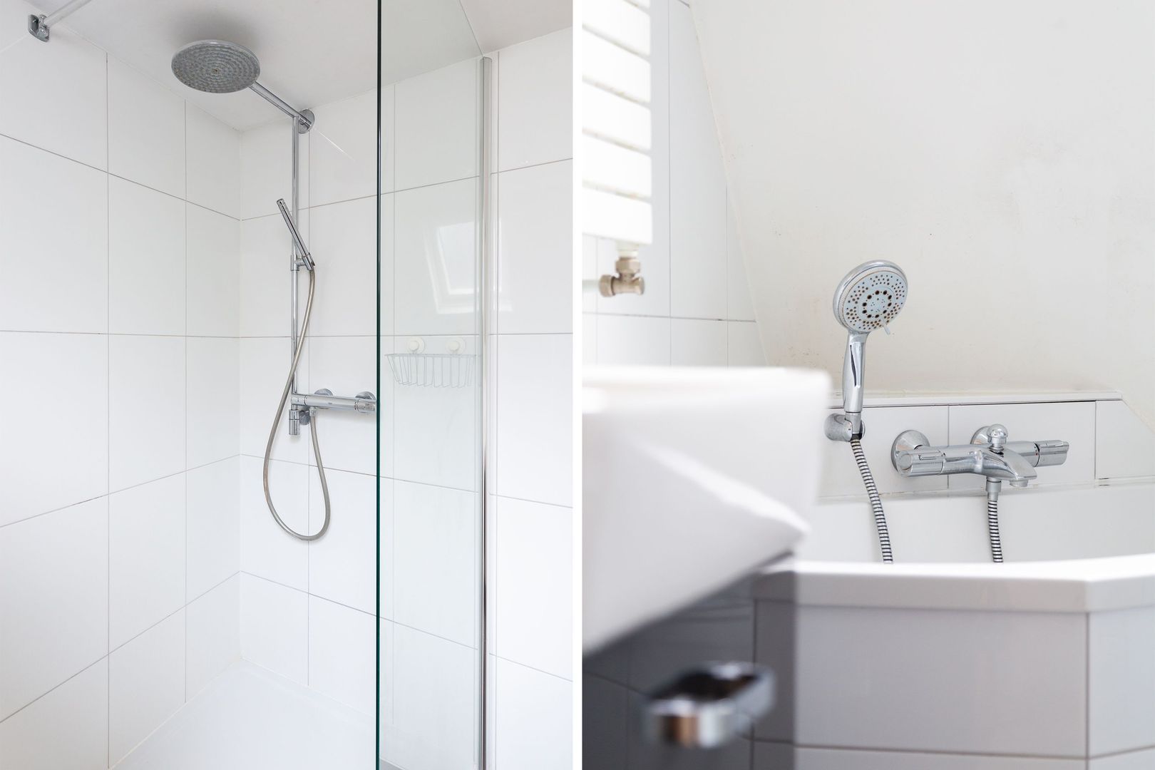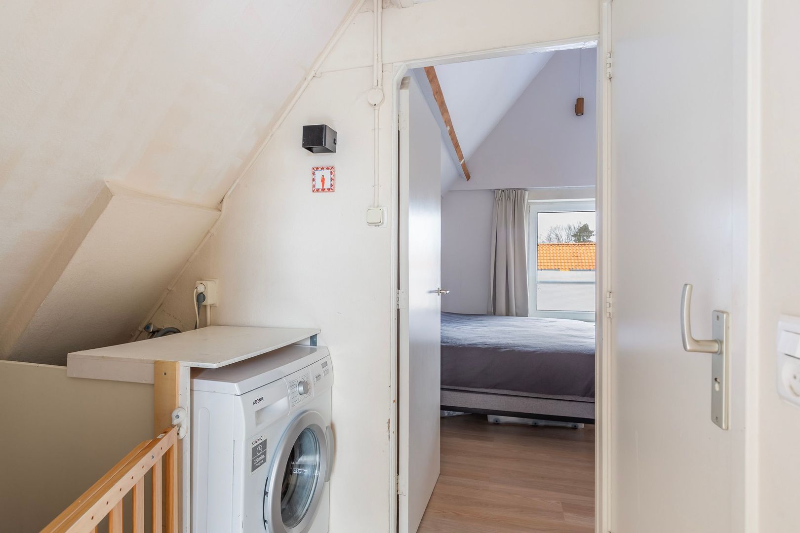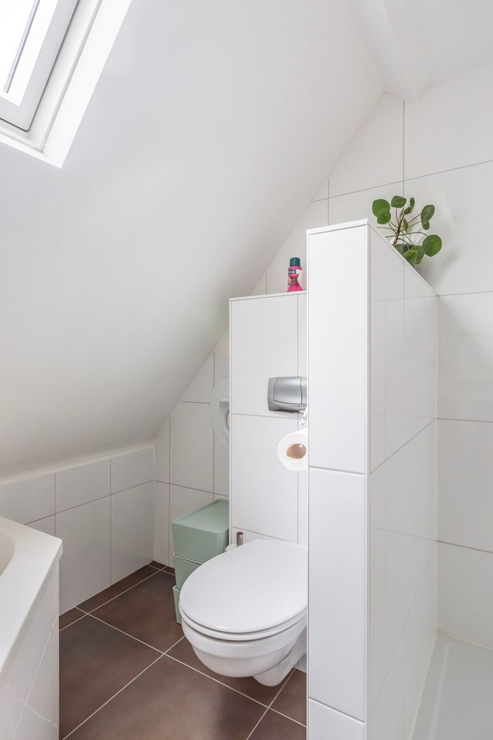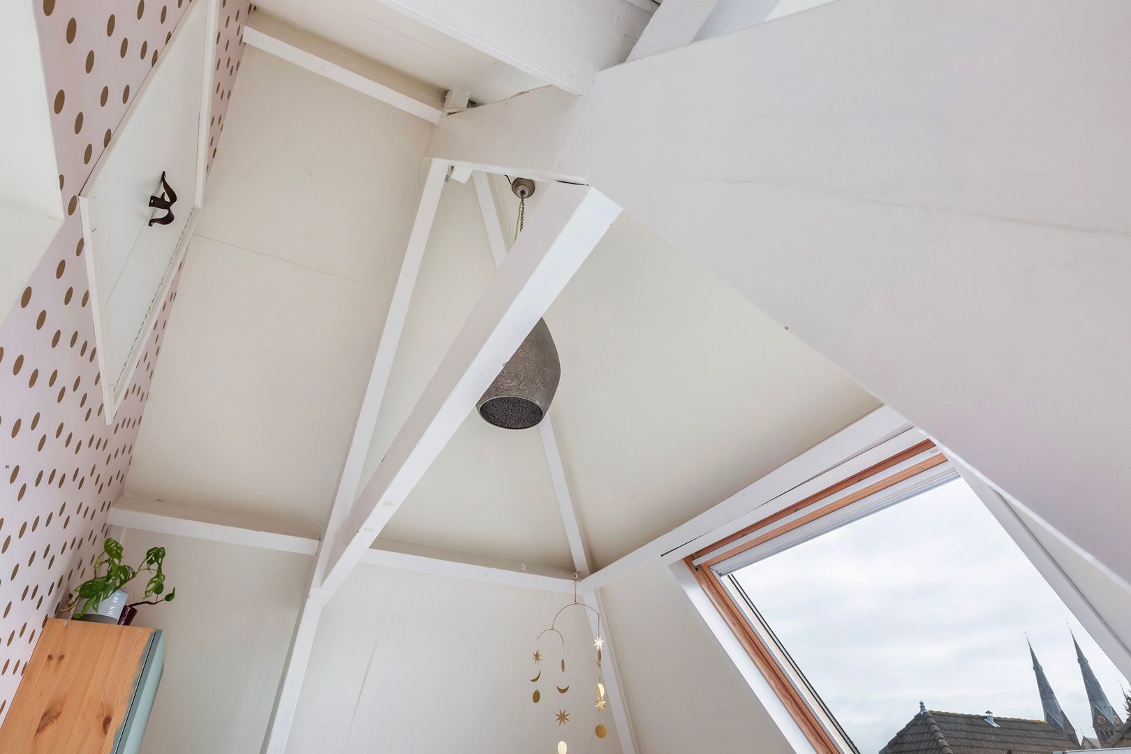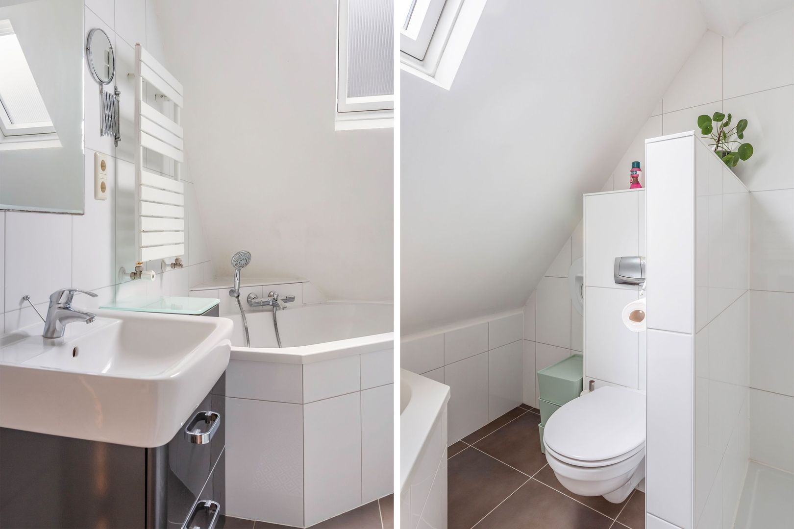 Trap naar de tweede etage; overloop met laminaatvloer en wasmachine aansluiting; sfeervolle achterkamer ca.3.53x3.29 (nokhoogte 3.68m) voorzien van laminaatvloer, balkenplafond en vaste kasten met opstelplaats voor de cv-ketel; luxe badkamer ca. 2.80x2.32 voorzien van ruime douche met thermostaatkraan, wastafelmeubel, ligbad, dakraam en tweede toilet; lichte voorkamer ca. 3.53x2.68 (nokhoogte 3.68) met laminaatvloer, balken plafond, twee Velux dakramen en toegang tot de bergvliering.