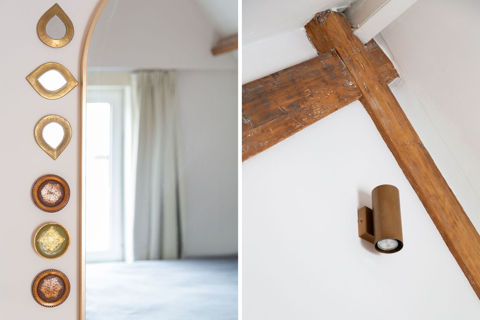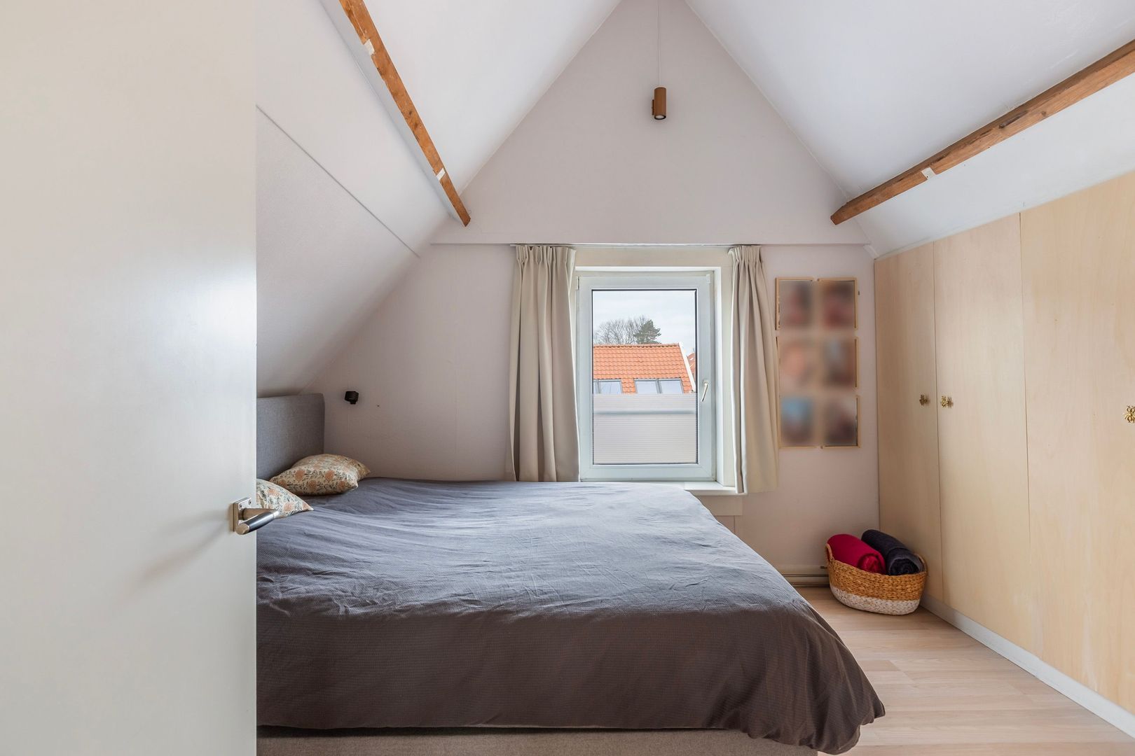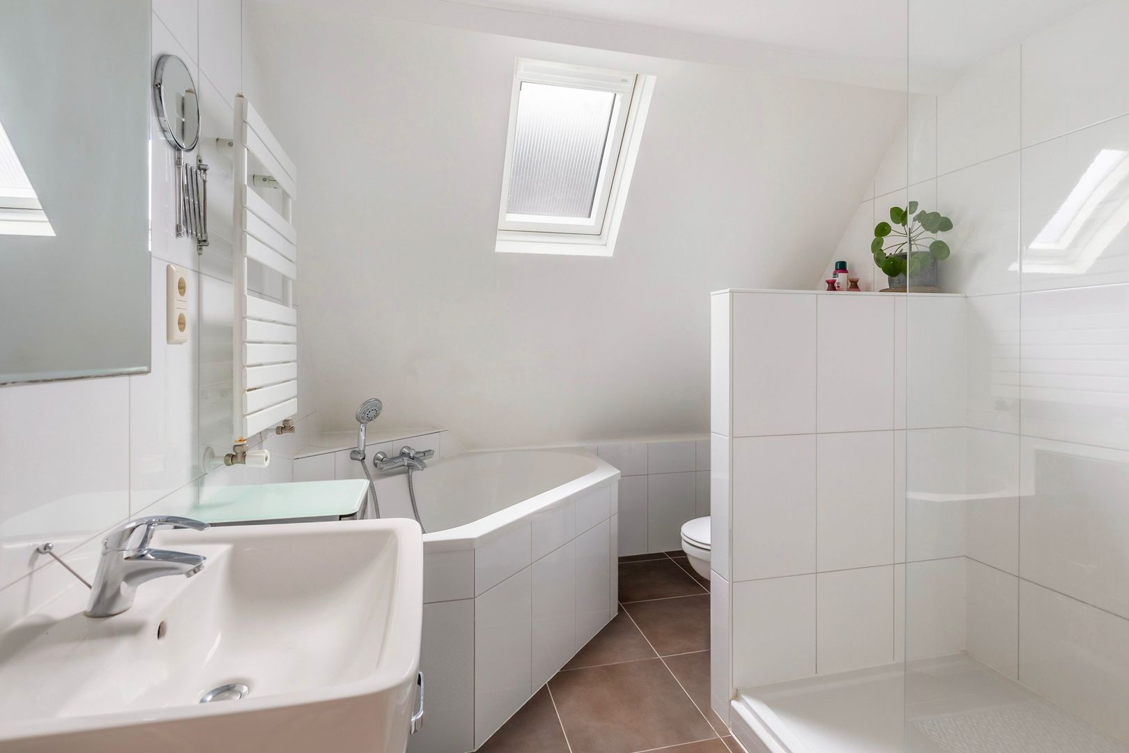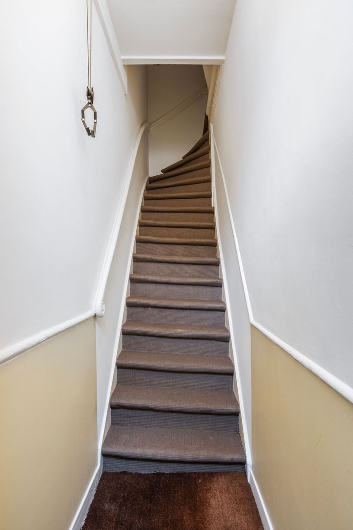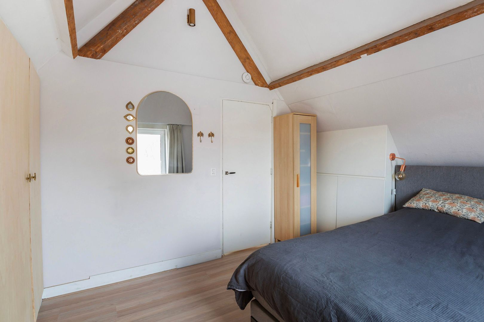 Trap naar de tweede etage; overloop met laminaatvloer en wasmachine aansluiting; sfeervolle achterkamer ca.3.53x3.29 (nokhoogte 3.68m) voorzien van laminaatvloer, balkenplafond en vaste kasten met opstelplaats voor de cv-ketel; luxe badkamer ca. 2.80x2.32 voorzien van ruime douche met thermostaatkraan, wastafelmeubel, ligbad, dakraam en tweede toilet; lichte voorkamer ca. 3.53x2.68 (nokhoogte 3.68) met laminaatvloer, balken plafond, twee Velux dakramen en toegang tot de bergvliering.