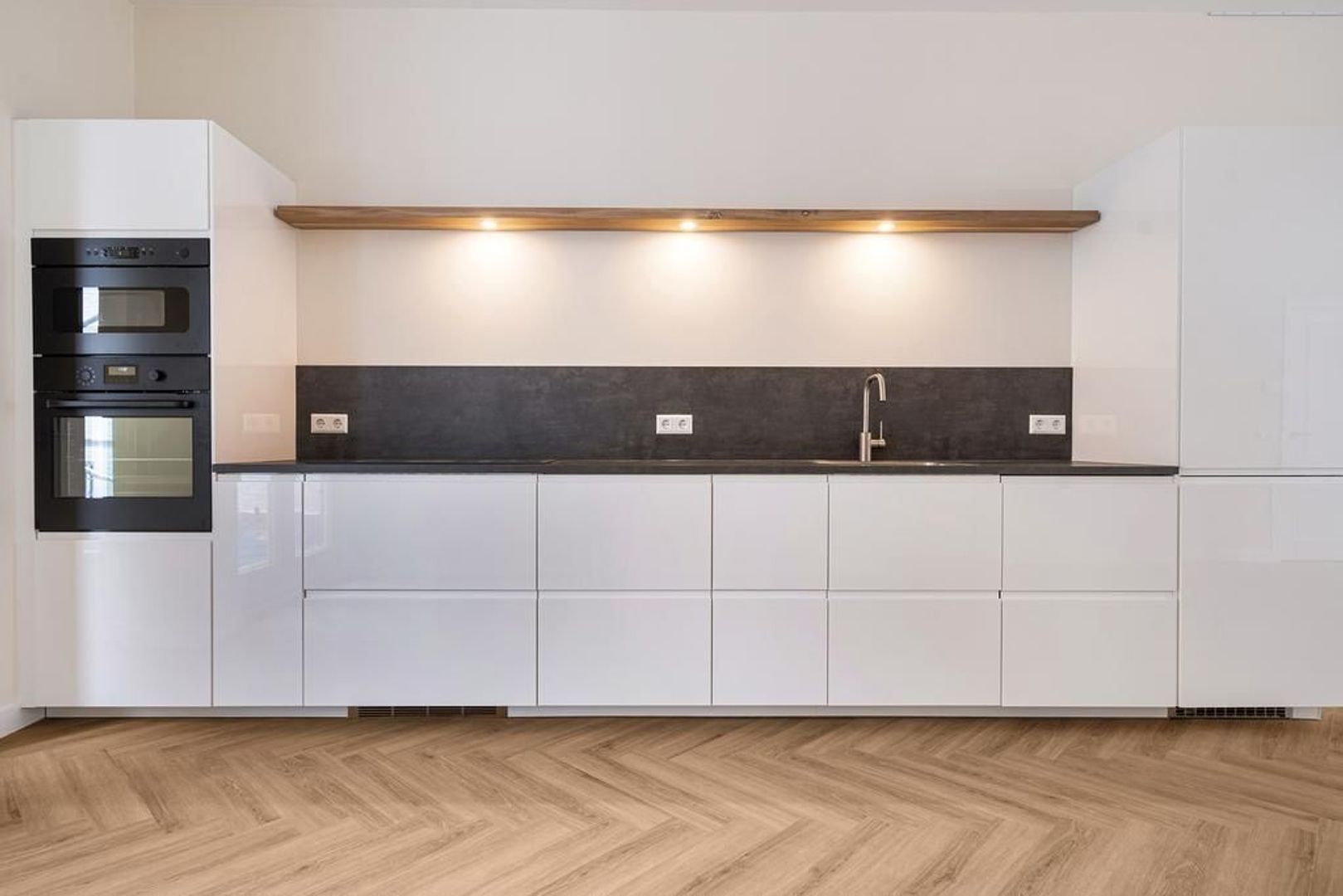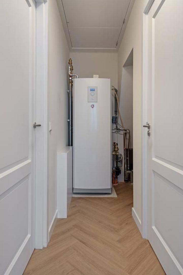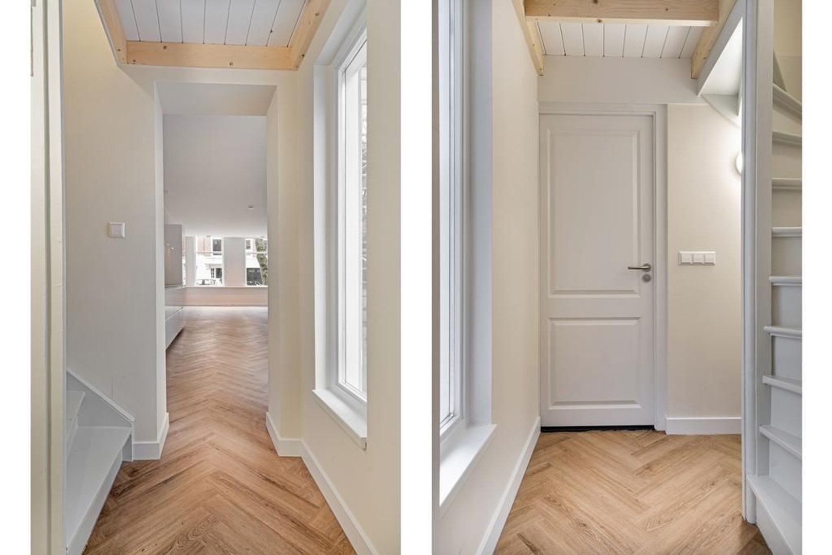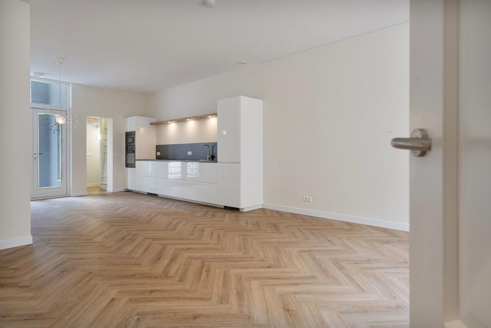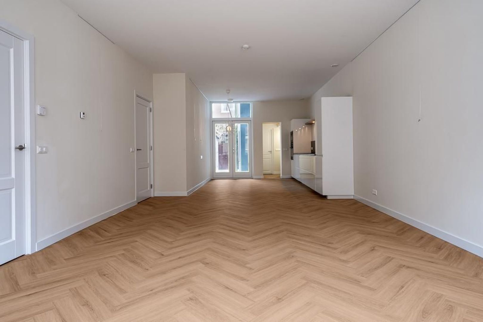 Entree appartement met hal en garderoberuimte; toegang woonkamer ca. 10.94x4.41/3.57 met achterin de nieuwe complete open keuken met ingebouwde inductie kookplaat, oven, afzuigkap, koel-/vriescombinatie, vaatwasser; Eveneens aan de achterzijde van de woonkamer zijn openslaande deuren naar de tuin; tussenhal met opstelplaats voor de warmtepompinstallatie, en bergruimte; toiletruimte; toegang tot achterslaapkamer ca. 3.74x2.68 met deur naar de tuin. Achter de woonkamer is de 2-laags achterbouw met de badkamer ca. 2.7x1.96 met inloopdouche, wastafelmeubel en aansluiting voor de wasmachine; trap naar de bovenetage met overloop en kamer van ca. 2.75x2.01.