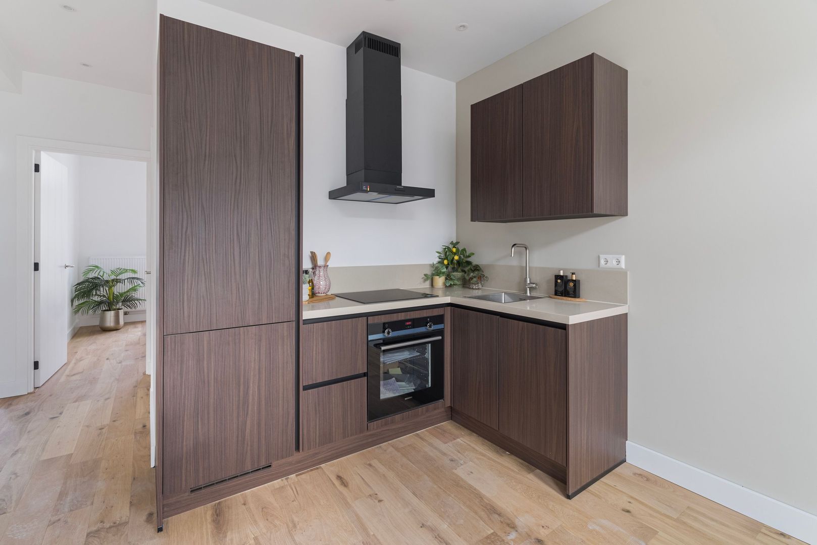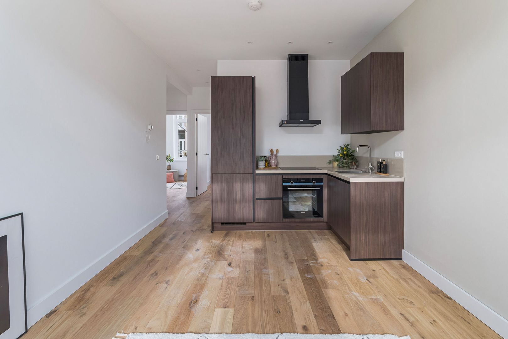Entree van het appartement via de hal met vaste kast; centrale overloop met toegang tot alle vertrekken; ruime woonkamer met aangrenzende open keuken voorzien van een inductiekookplaat, afzuigkap, combi magnetron/oven, koel-vriescombinatie en vaatwasser; 1e slaapkamer aan de achterzijde; 2e slaapkamer aan de achterzijde met toegang tot het balkon; 3e slaapkamer aan de voorzijde; moderne badkamer met inloopdouche, wastafelmeubel en aansluiting wasmachine.
