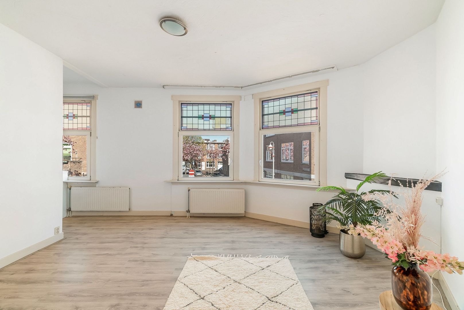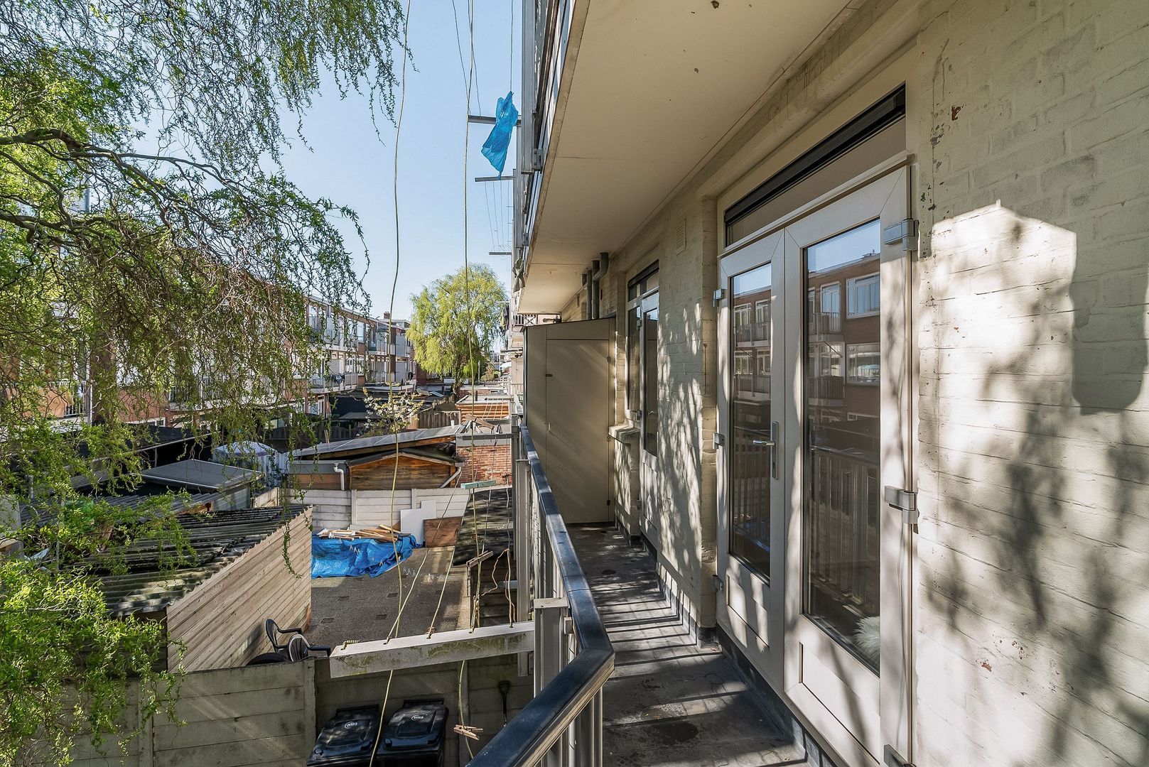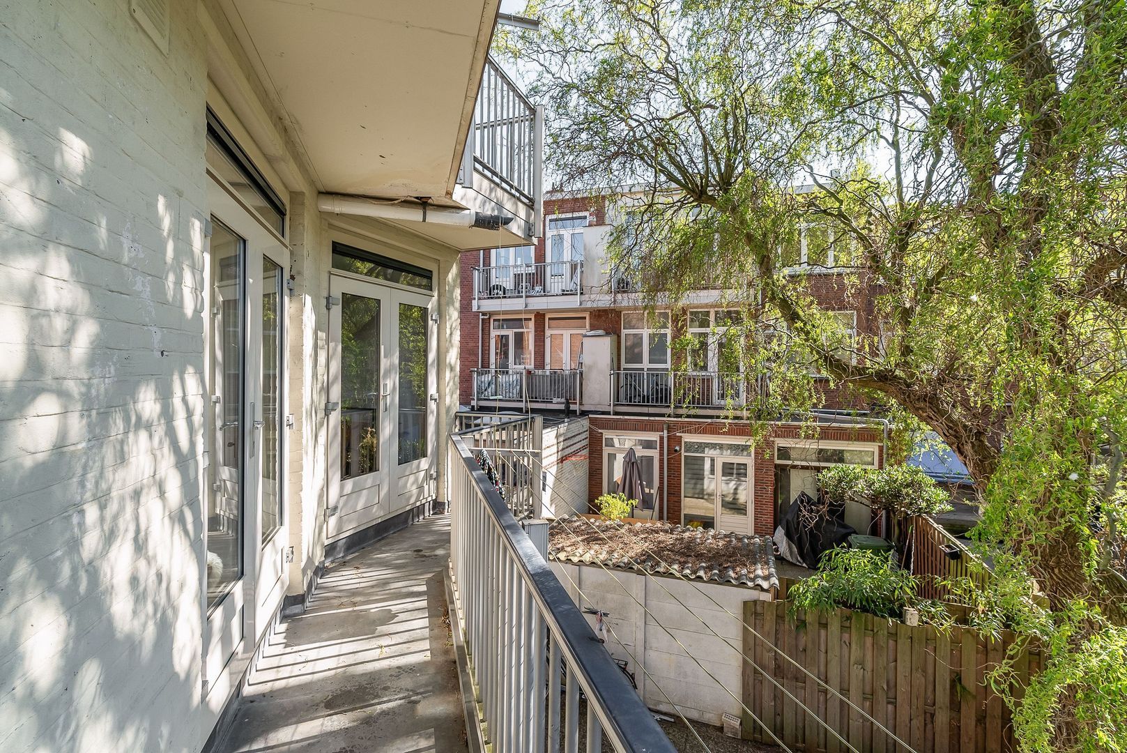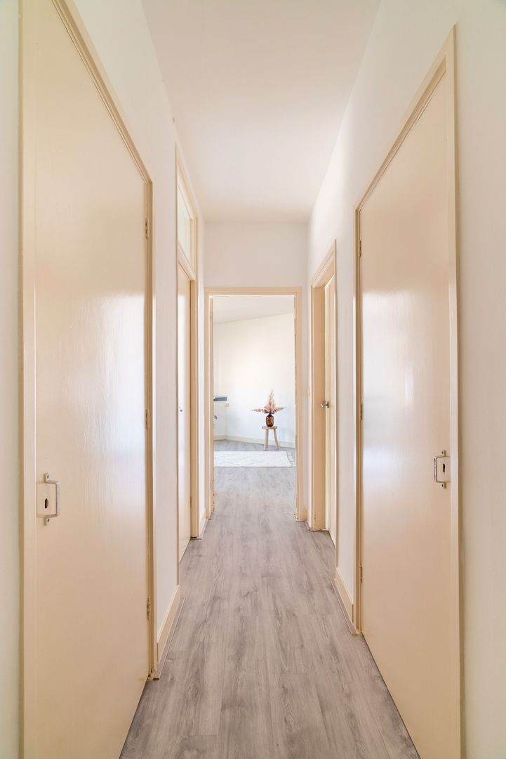Woningentree op de 1e etage via open portiek; gang met meterkast, bergkast en kast met de cv-opstelling; ruime met sfeervol glas in lood en een moderne open keuken in hoekopstelling voorzien van een gaskookplaat, afzuigkap, oven en vaatwasser; 1e slaapkamer aan de achterzijde met openslaande deuren naar het balkon; 2e slaapkamer aan de achterzijde met openslaande deuren naar het balkon; ruime badkamer met douche, wastafel en de wasmachine aansluiting; separaat toilet met fonteintje;