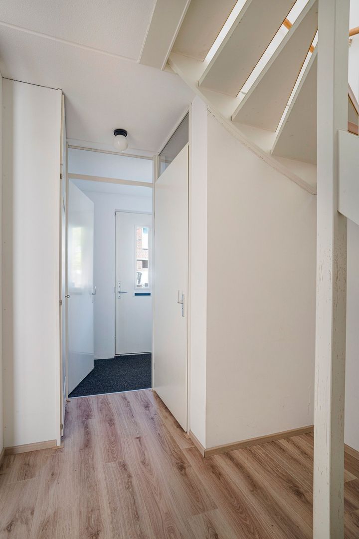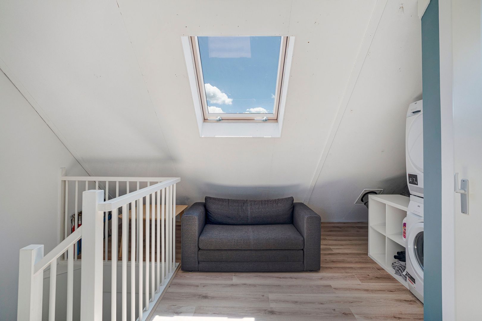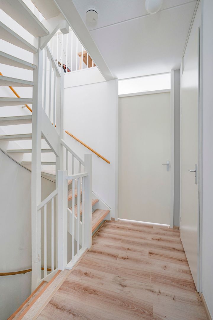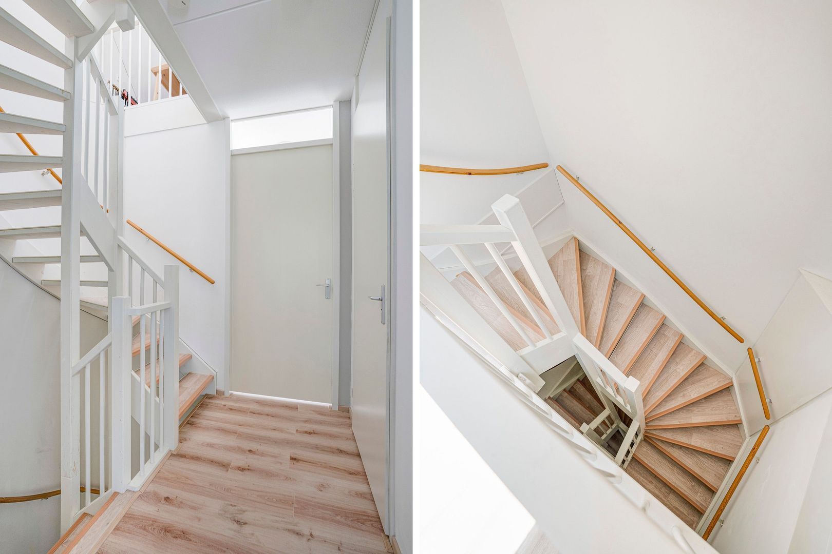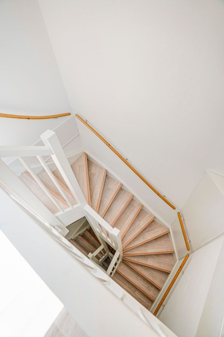 Trap vanaf de overloop naar de grote overloop op de 2e etage met de wasmachine aansluiting en de cv-opstelling; 3e slaapkamer aan de voorzijde met grote raampartijen;