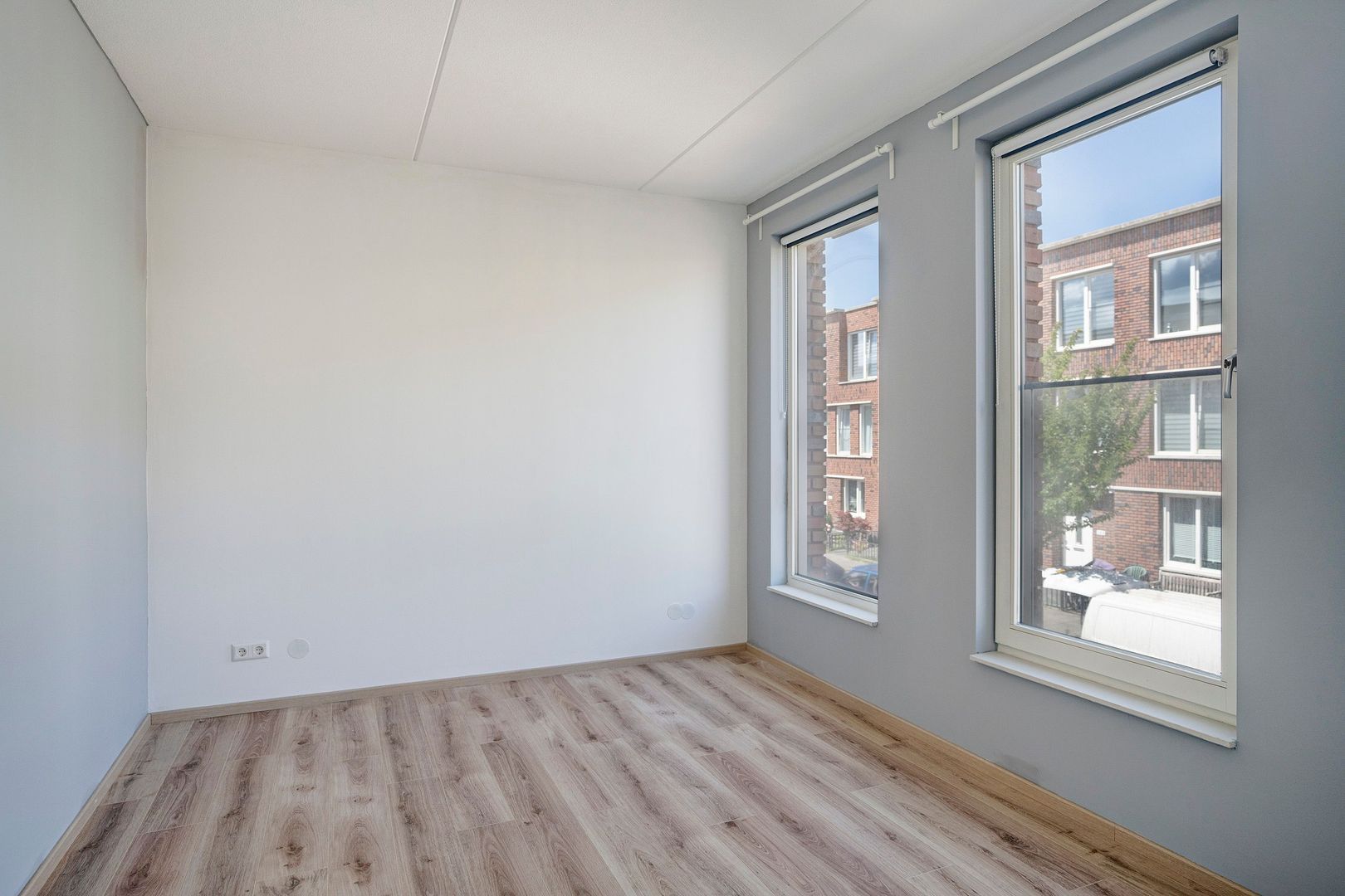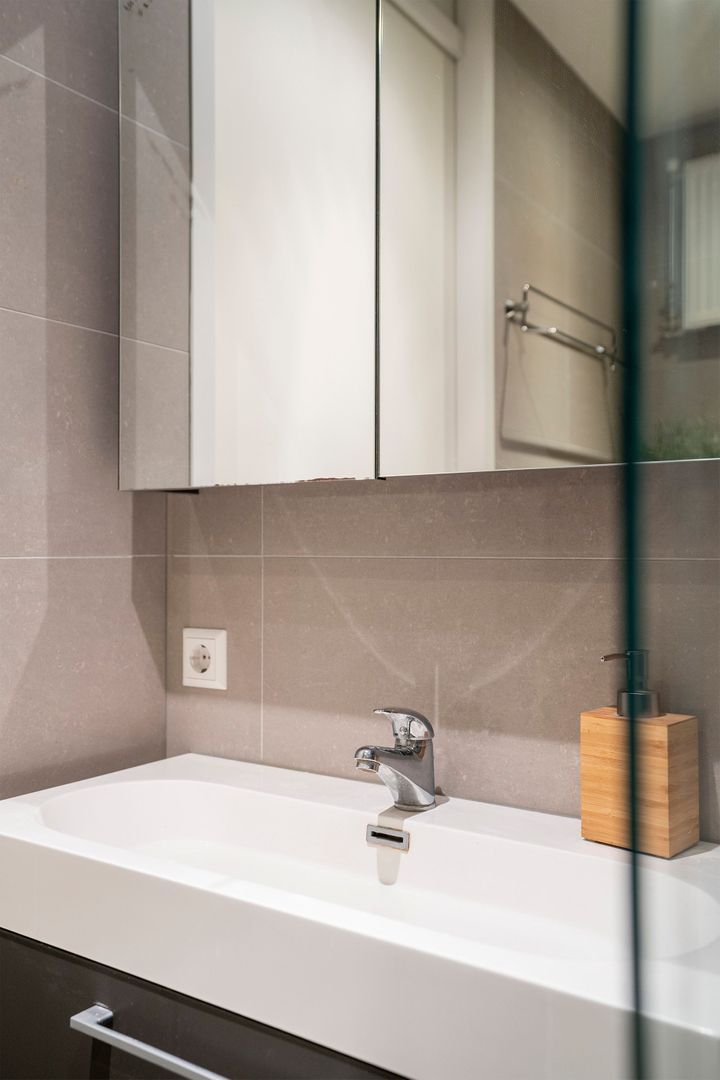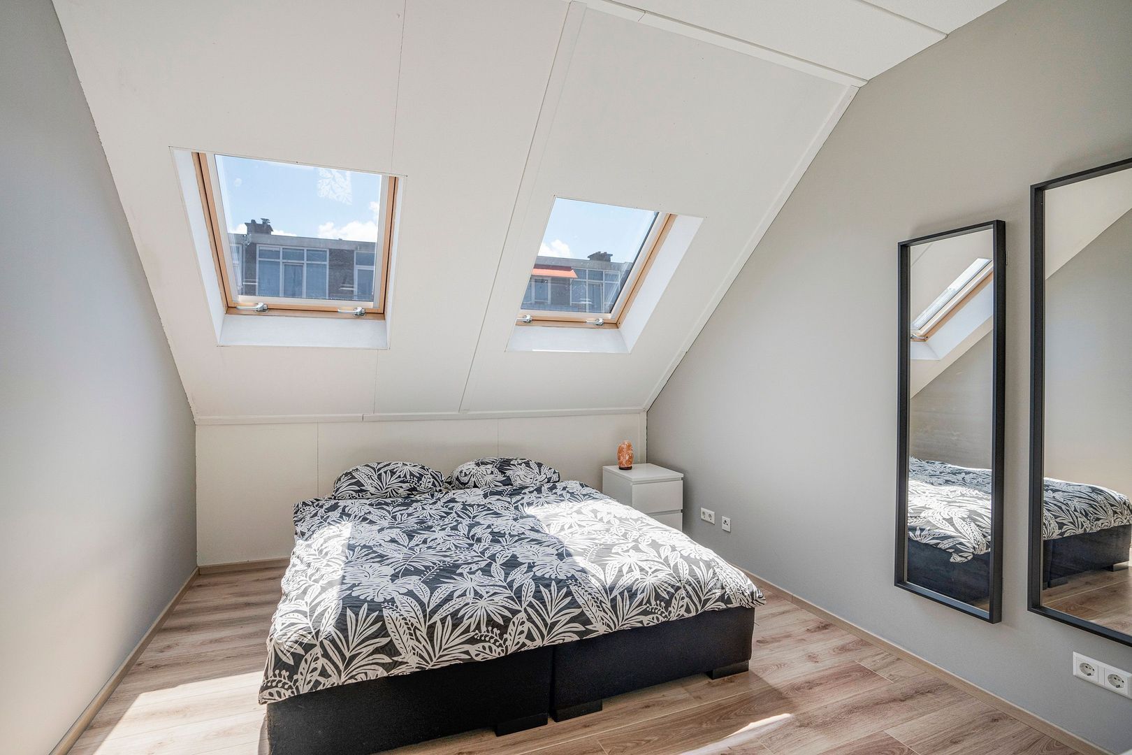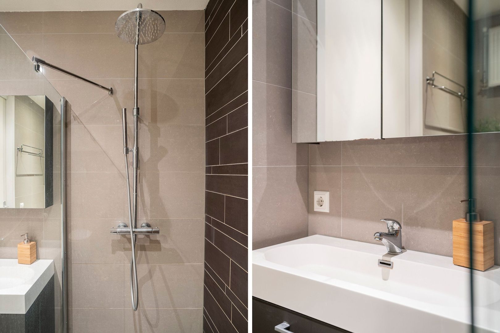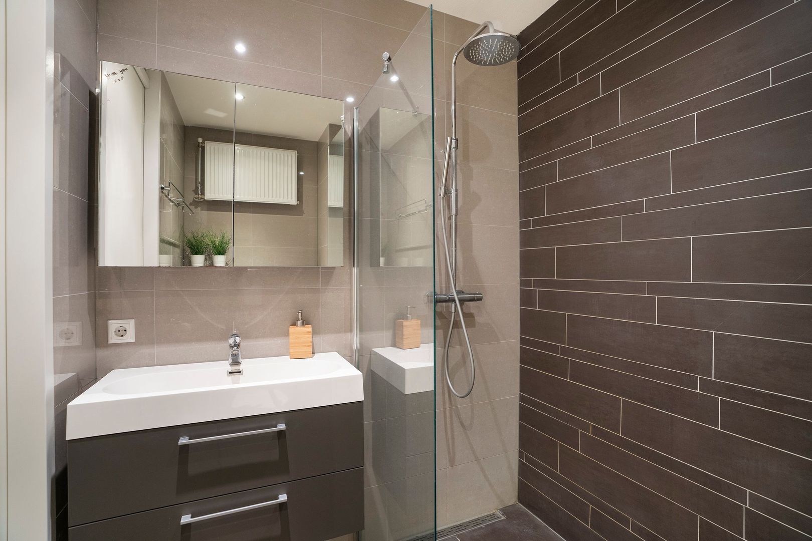 Trap vanuit de hal naar de overloop op de 1e etage; 1e slaapkamer aan de voorzijde met grote raampartijen; 2e slaapkamer aan de achterzijde met dakramen en een eigen grote inloopkast; moderne badkamer met een inloopdouche, wastafel meubel en toilet (wandcloset);