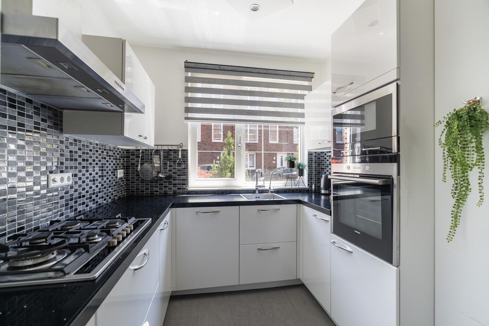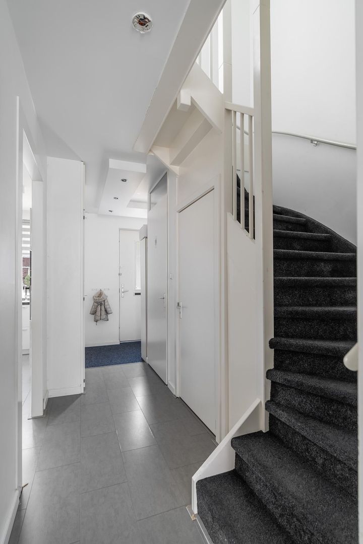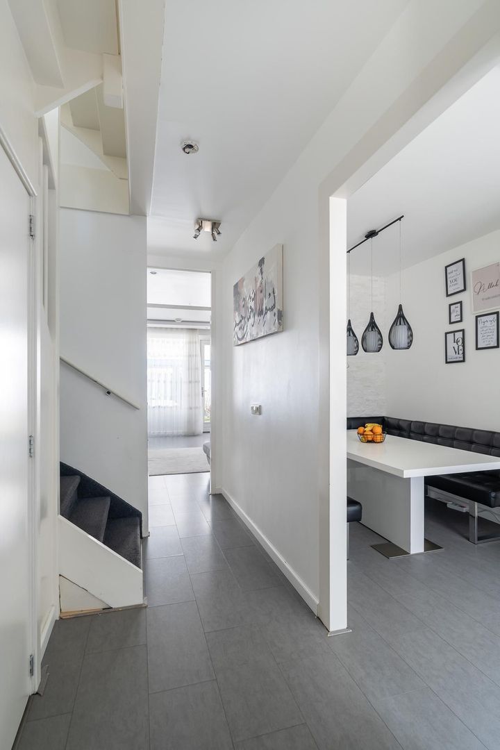 Begane grond: Woningentree via eigen voortuin; hal met meterkast en 2 bergkasten, modern toilet met fontein; woonkamer aan de tuinzijde; afzonderlijke moderne keuken in U-vorm o.a. voorzien van een 5-pits gaskookplaat, afzuigkap, vaatwasser, oven en magnetron en met een aangesloten eetgedeelte; achtertuin met ruim 3 meter diepe serre overkapping en met achterom via het afgesloten parkeerterrein.