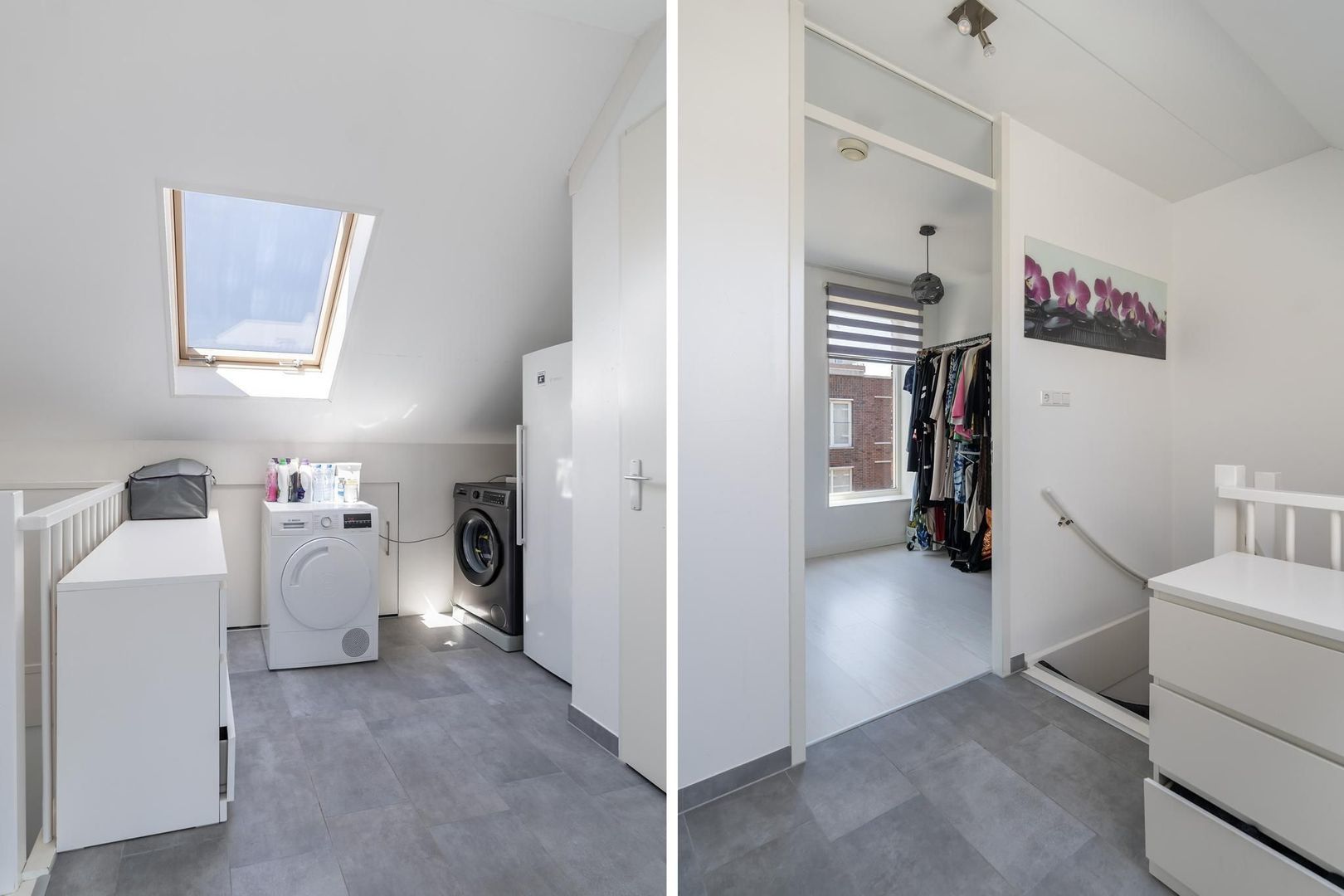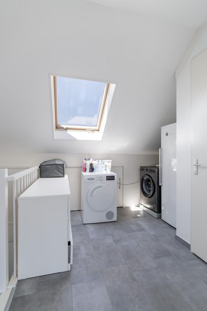 Tweede etage: riante overloop met vaste kast (alwaar de Cv-ketel staat opgesteld), bergruimte, dakraam, wasmachineaansluiting en de mogelijkheid tot het realiseren van een extra slaapkamer; ruime slaapkamer aan de voorzijde die eventueel opgesplitst kan worden in 2 kamers.