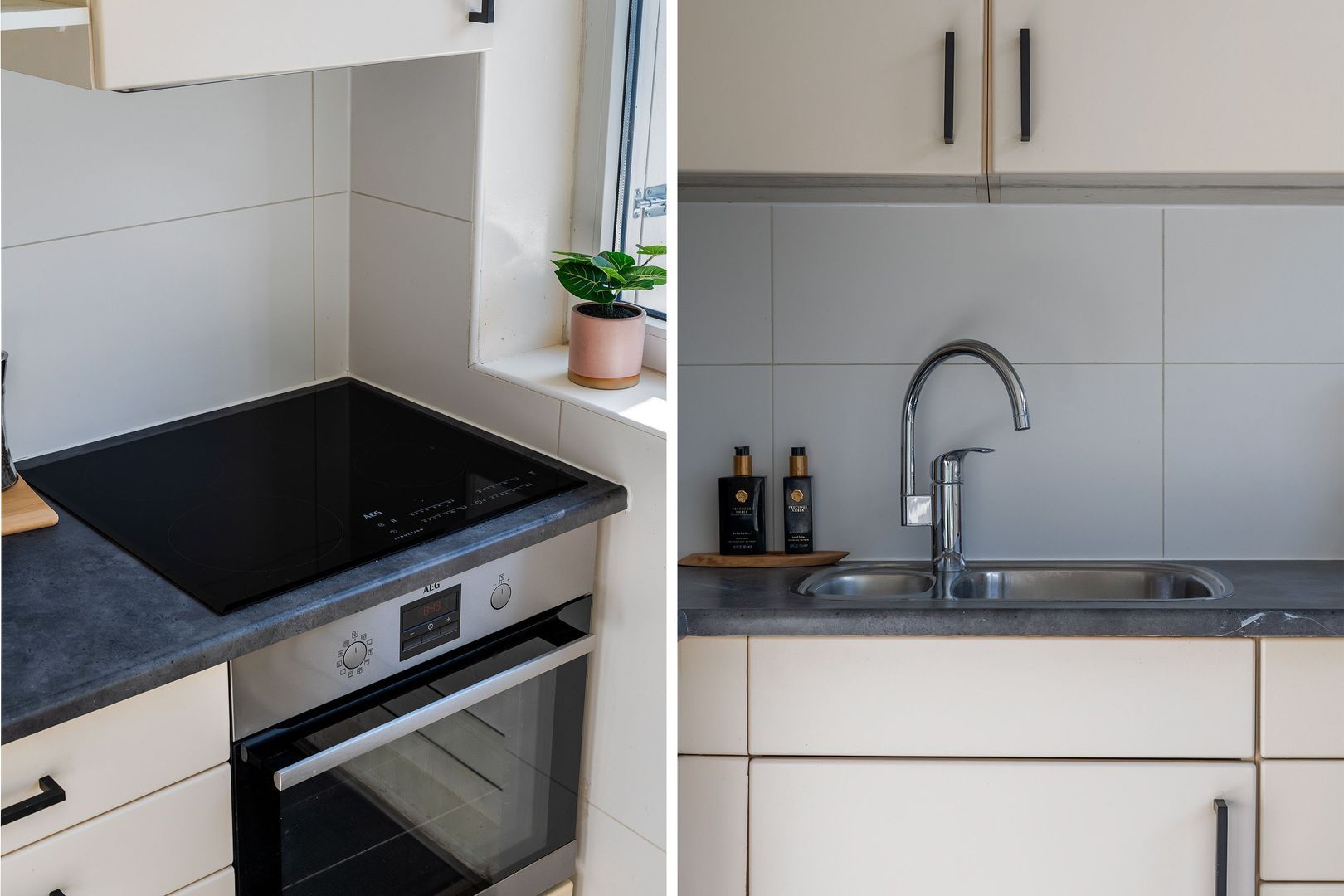 Woningentree op de begane grond; hal met meterkast en binnentrap naar de overloop op de 1e etage; net toilet; woonkamer met een sfeervolle erker en een nette open keuken in hoekopstelling die is voorzien van een inductiekookplaat, afzuigkap, oven, vaatwasser, koel-vriescombinatie en toegang tot het balkon.