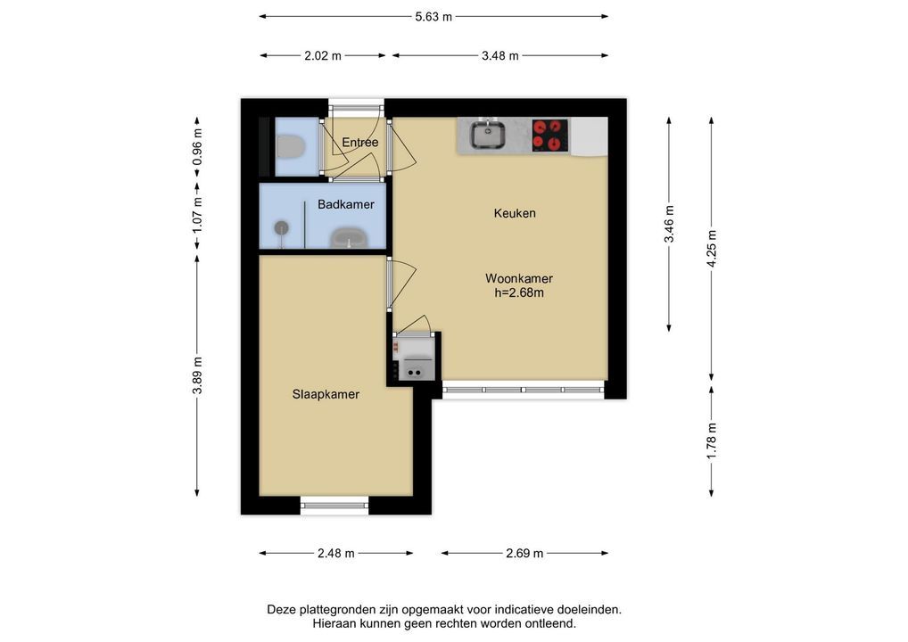 Entree woning; woon-/eetkamer ca. 4.25x3.48 met open keuken voorzien van een inductiekookplaat, afzuigkap, combi-oven, koelkast, vriezer en vaatwasser; luxe badkamer ca. 2.02x1.07voorzien van inloopdouche, wastafelmeubel seperaat toilet (wandcloset); ruime slaapkamer ca. 3.89x2.48