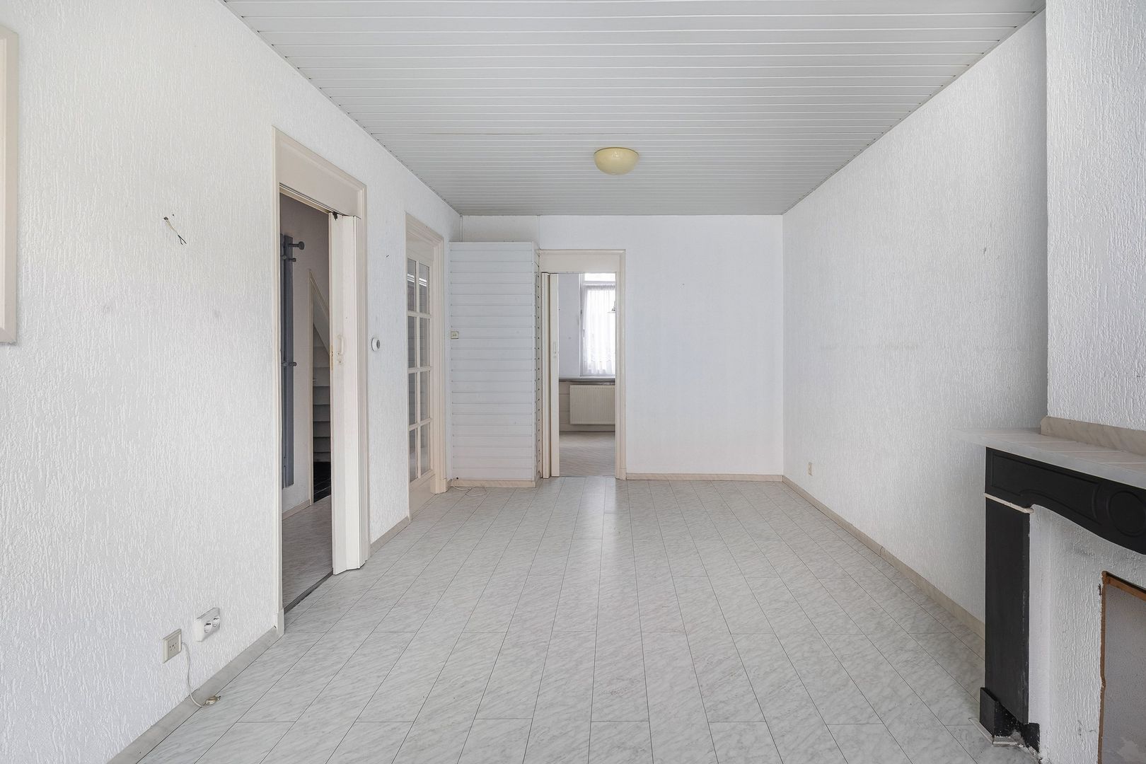 1e etage: overloop met toilet; L-vormige (woon)kamer aan de voorzijde die eenvoudig te verbouwen is tot 2 slaapkamers; ruime achterkamer; keuken aan de achterzijde met toegang tot het terras. via overloop trap naar zolderetage.