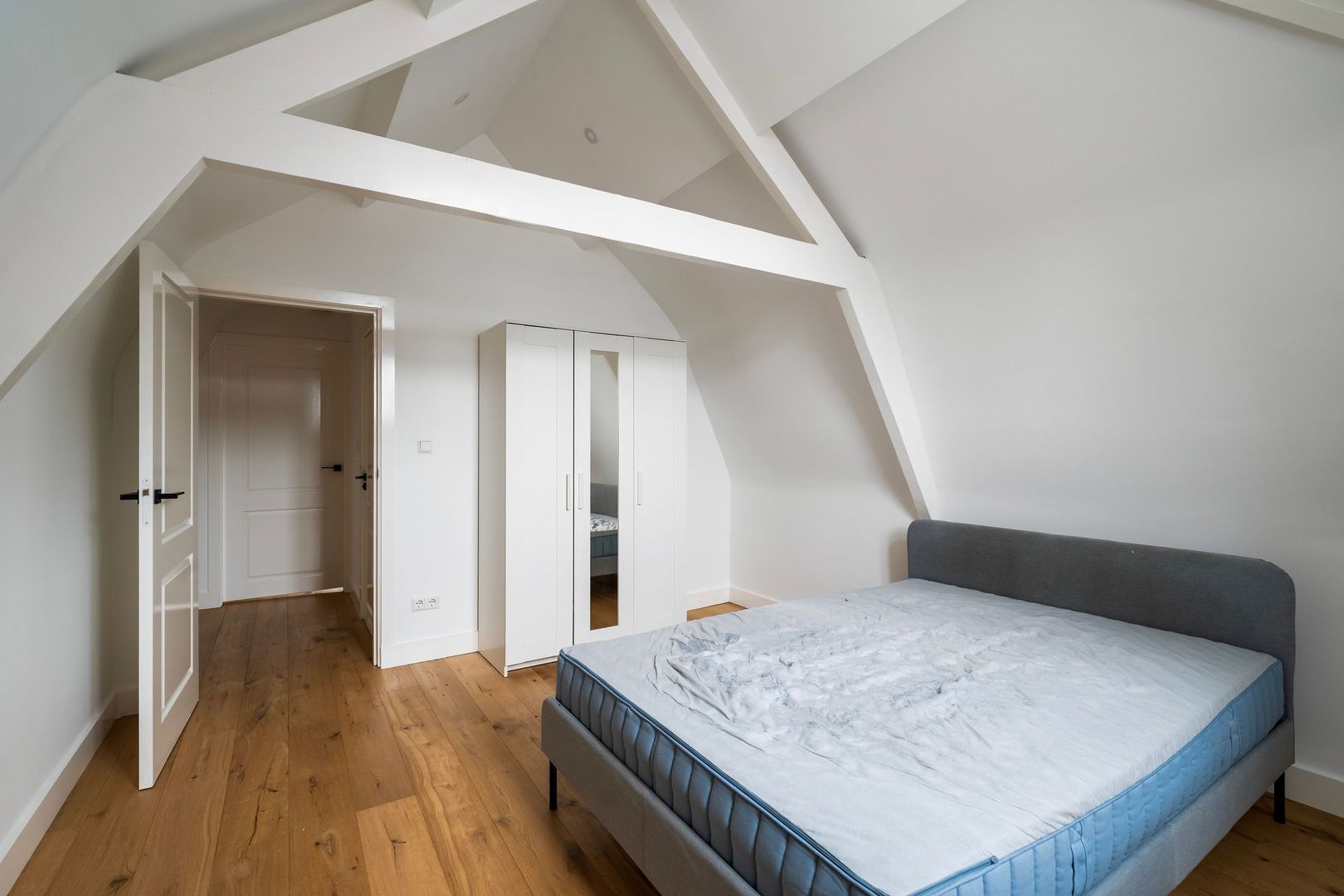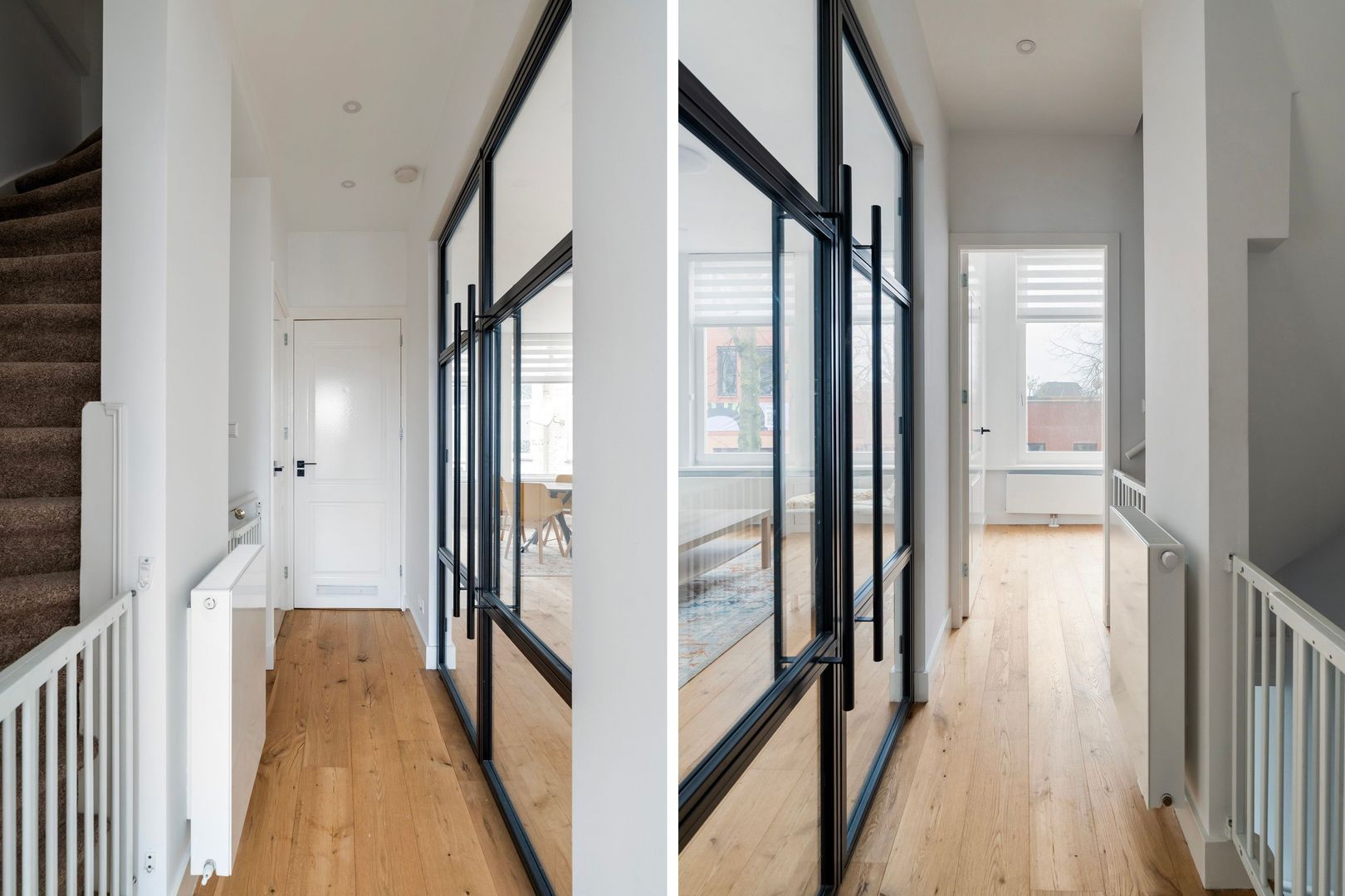 Trap vanaf de overloop naar de overloop op de 2e etage; 1e slaapkamer aan de voorzijde; 2e slaapkamer aan de achterzijde; moderne badkamer met inloopdouche, wastafelmeubel en toilet;