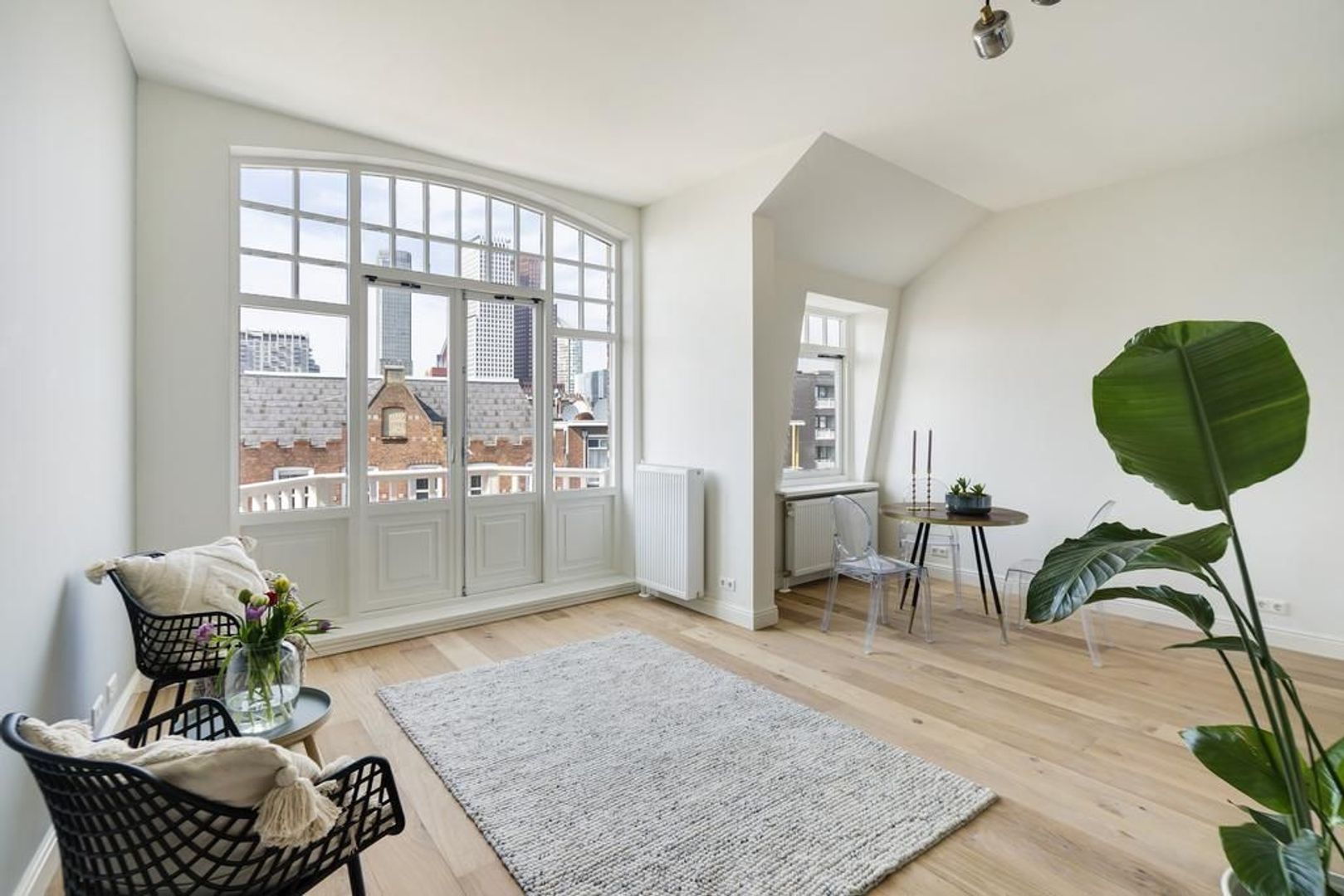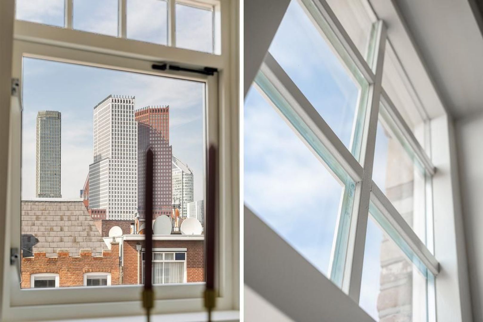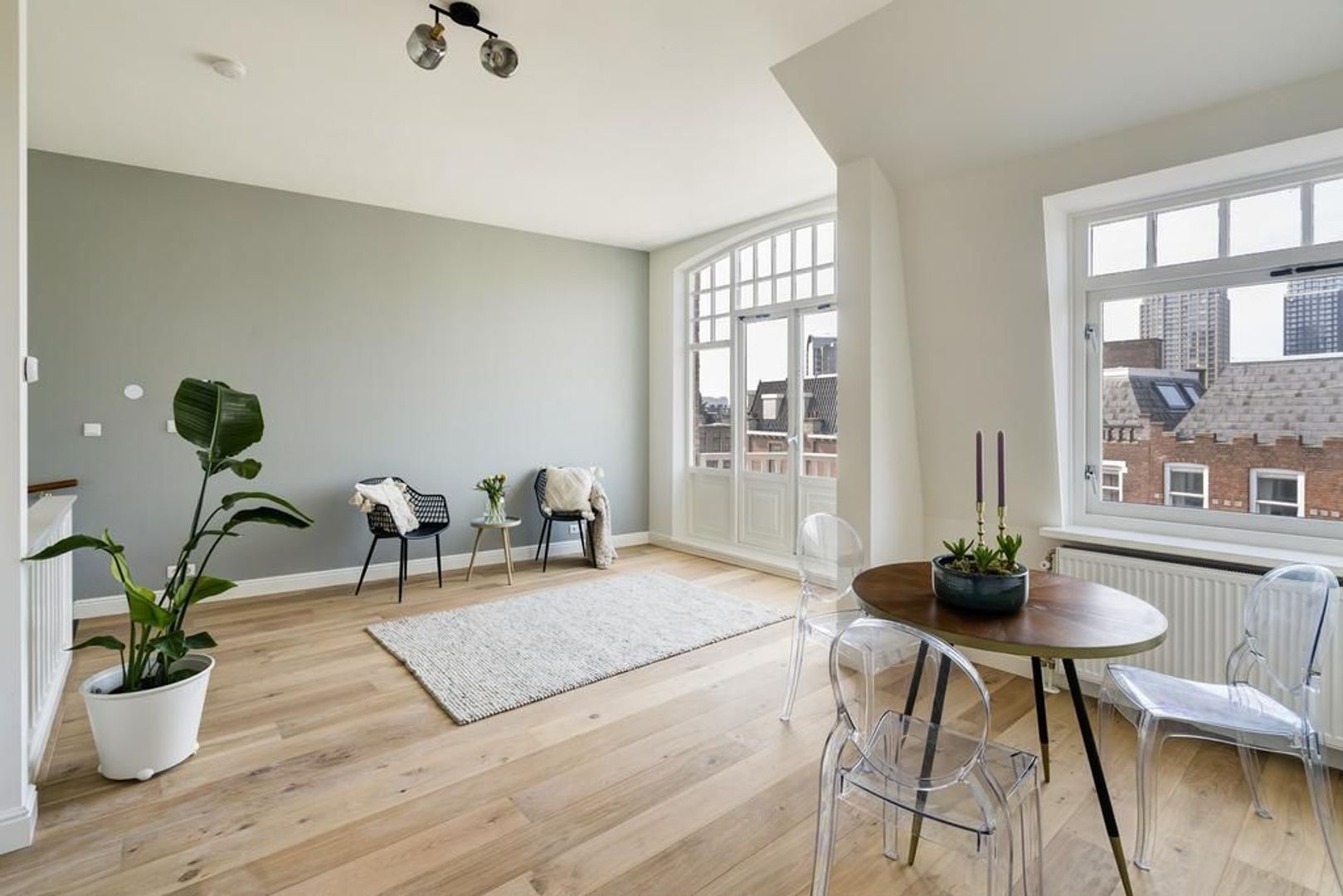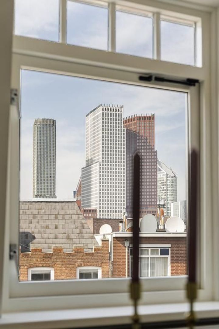3e Etage: woon/eetkamer ca.5.90x5.18 met luxe open keuken voorzien van een fraai natuurstenen aanrechtblad, 4-pits inductiekookplaat, oven, afzuigkap, koelkast, vriezer en vaatwasser, toegang tot het Franse balkon aan de voorzijde met spectaculair uitzicht over het centrum van Den Haag