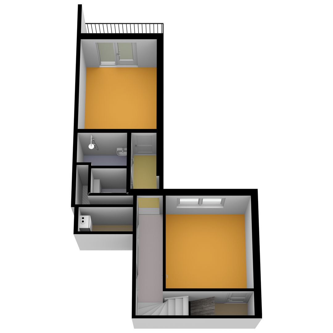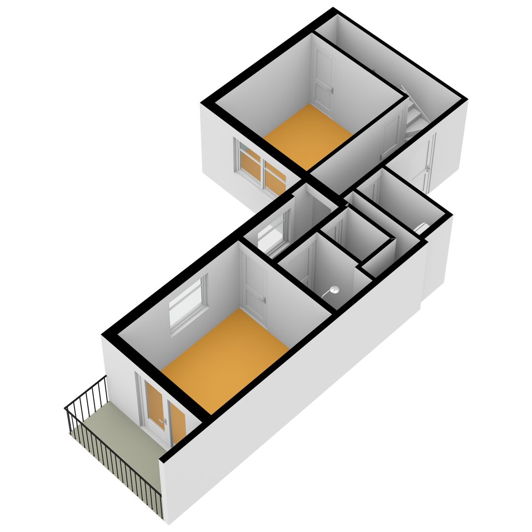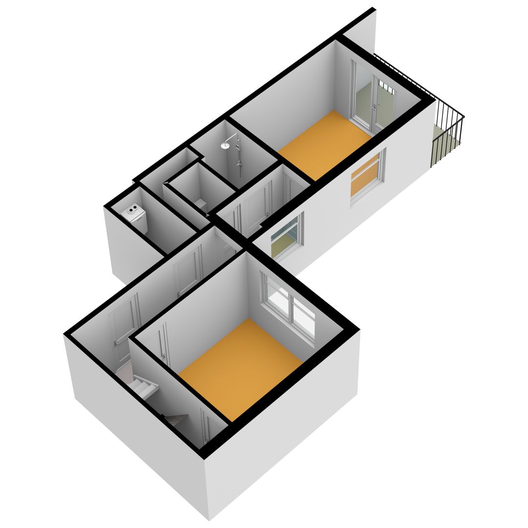 1e Etage: Woningentree via open portiek; hal; modern toilet (wandcloset) met fontein; ruime 1e slaapkamer aan de voorzijde ca. 3.35x2.98 ; 2e slaapkamer aan de achterzijde ca. 3.60x3.00 met ruim balkon; luxe badkamer ca. 1.27x1.82 met inloopdouche en wastafelmeubel ;
