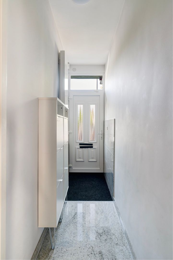Woningentree; gang met vaste kast voorzien van de cv-opstelling en wasmachine aansluiting; woonkamer ca. 5.37x3.56 met schuifpui naar de achtertuin en toegang tot de open keuken ca. 2.71x2.16 met een stenen werkblad in hoekopstelling en voorzien van een gaskookplaat, afzuigkap, oven, combimagnetron/-oven, koel-vriescombinatie, koffiezetapparaat, vaatwasser en toegang tot de achtertuin; 1e slaapkamer aan de voorzijde ca. 4.23x4.21; 2e slaapkamer ca. 4.02x3.01; 3e slaapkamer ca. 3.42x3.01/1.90; moderne badkamer ca. 3.01x1.95 met inloopdouche, wastafelmeubel en toilet (wandcloset);