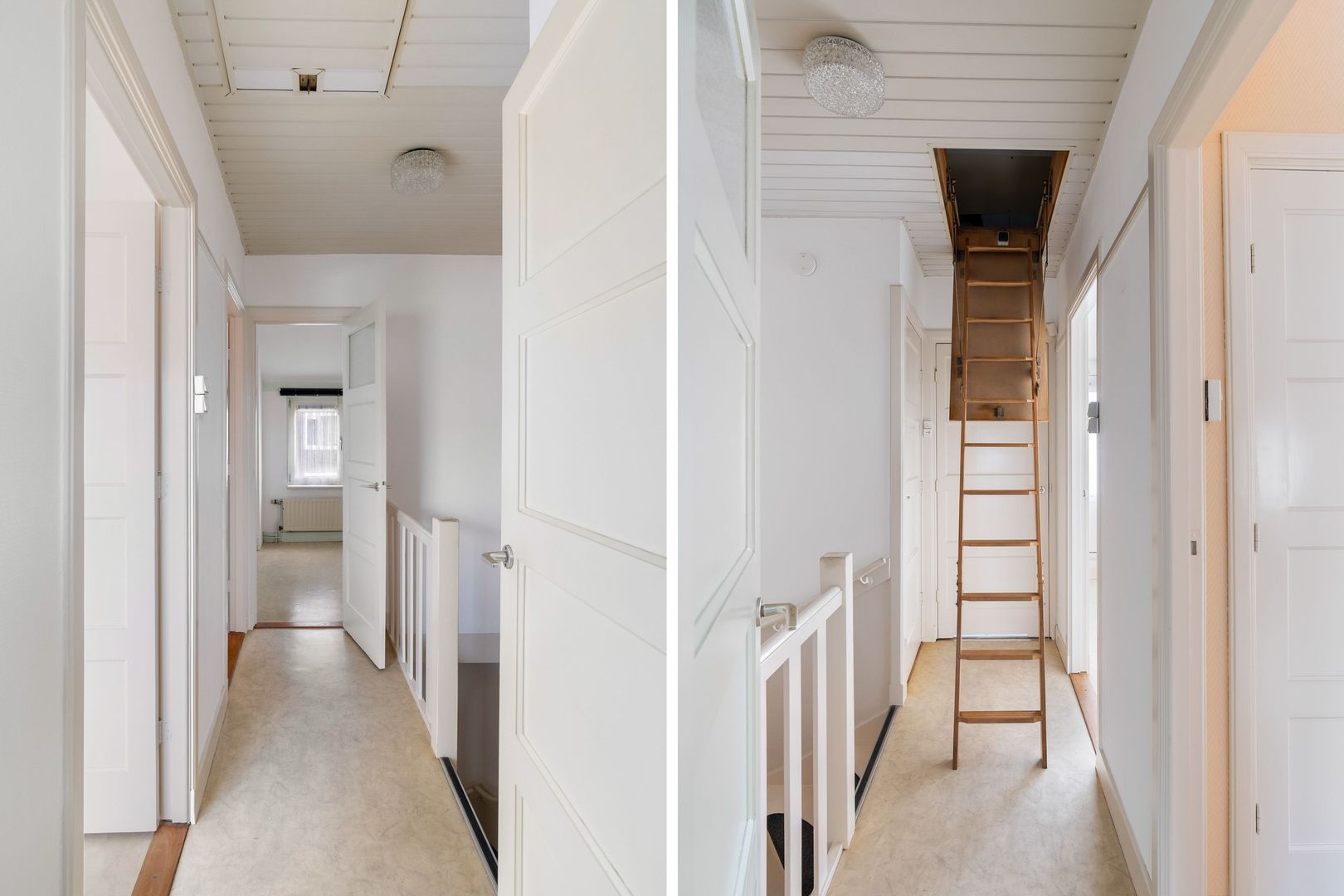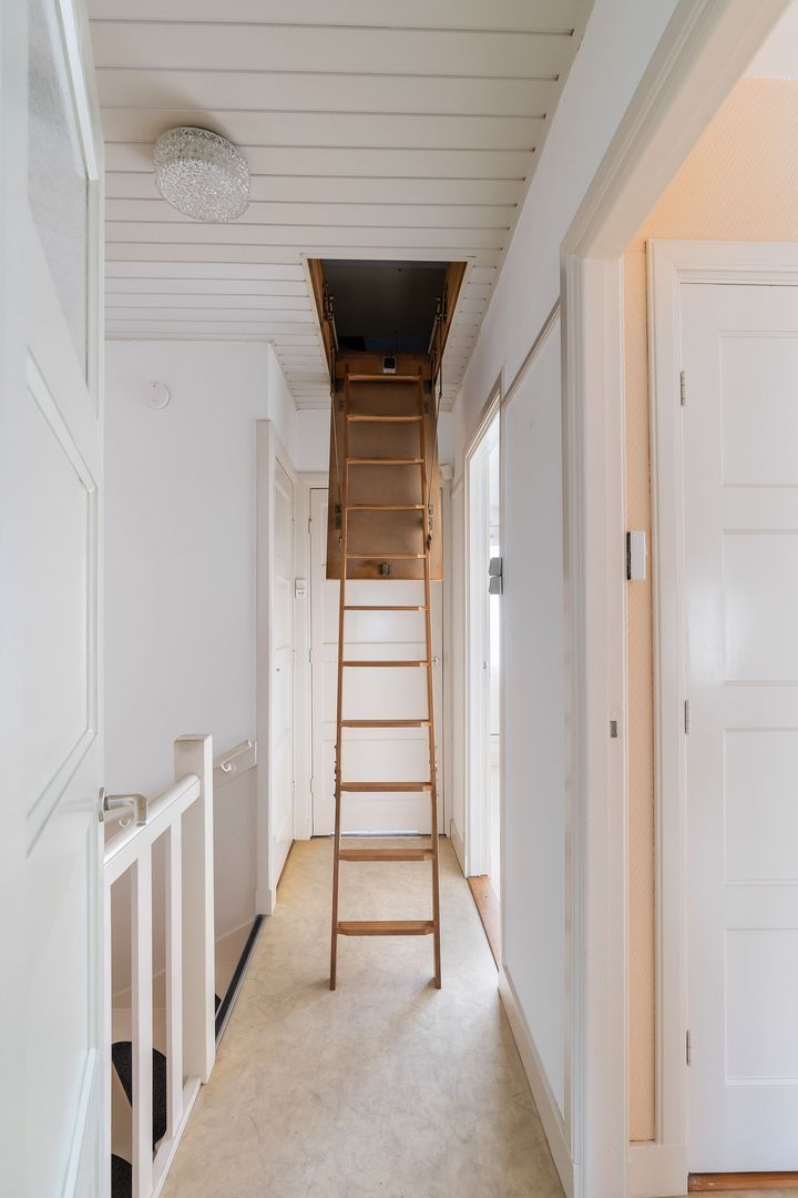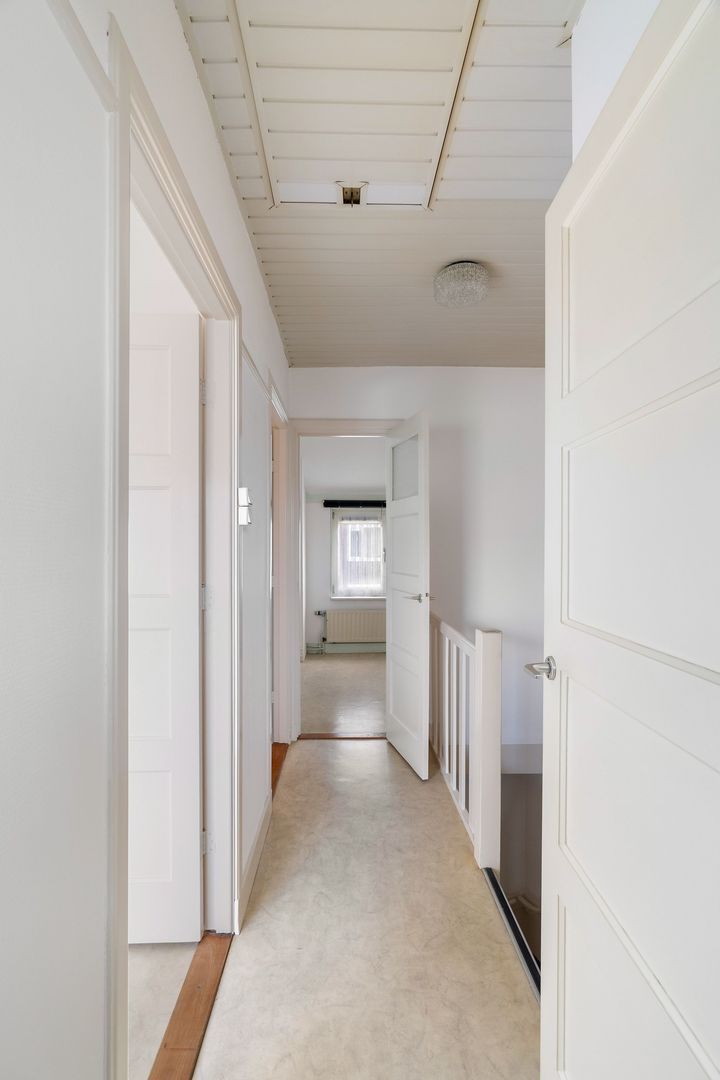 1e verdieping: overloop met vaste kast; 1e slaapkamer aan de voorzijde met 2 vaste kasten; 2e slaapkamer aan de voorzijde; 3e slaapkamer aan de achterzijde met vaste kast en toegang tot het balkon over de gehele breedte van de woning; vliezotrap naar zolder.