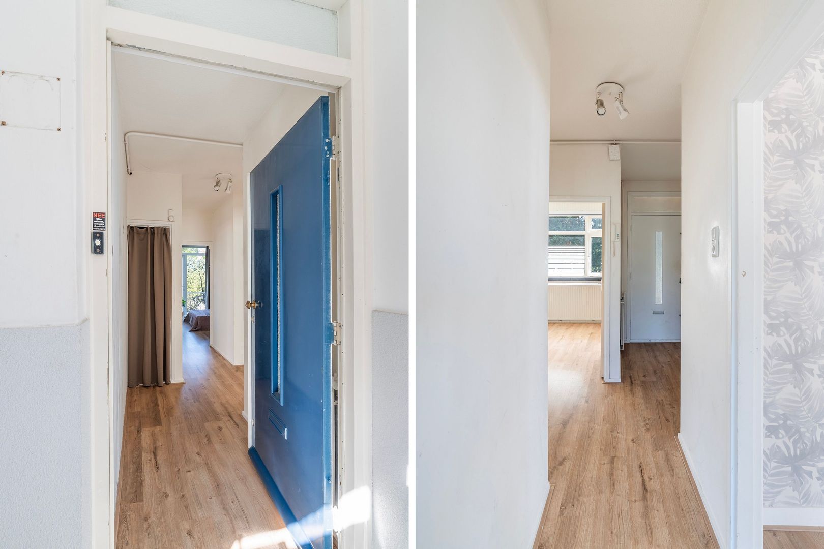 Gezamenlijke entree op straatniveau, trap naar de 1e verdieping. Entree appartement Daar kom je uit in de hal, die toegang geeft tot alle vertrekken in de woning.