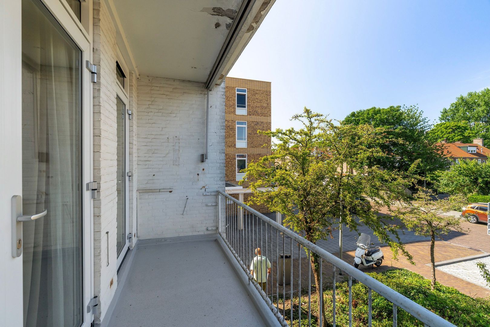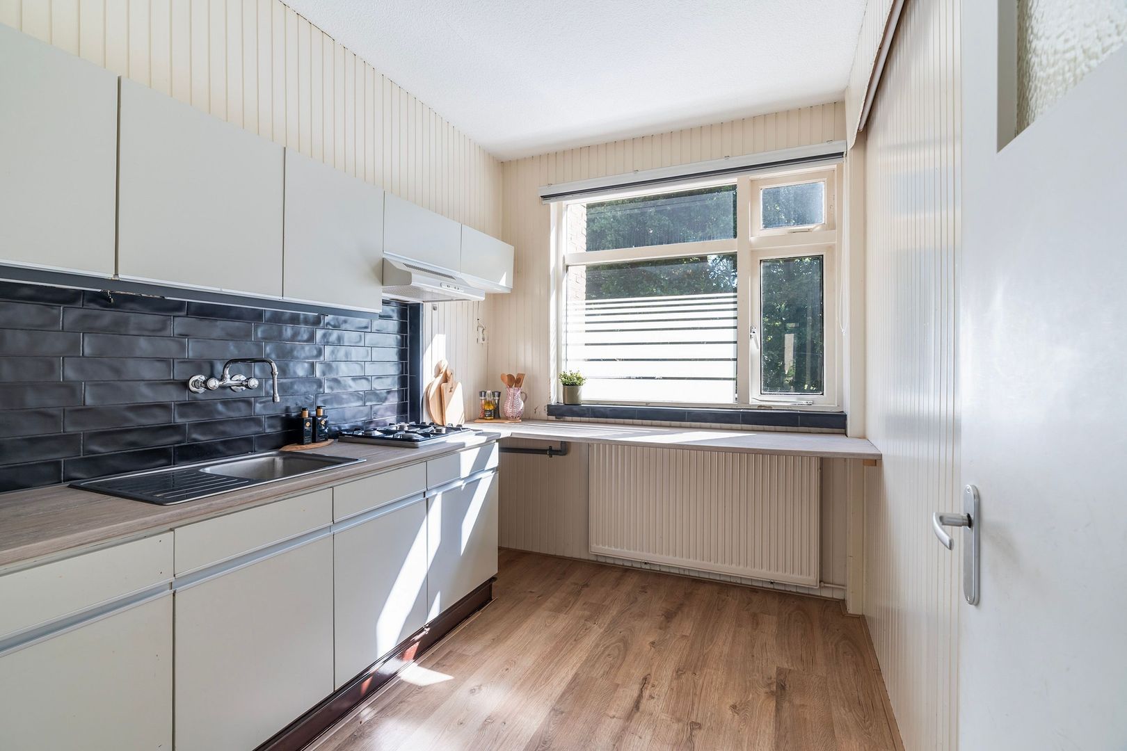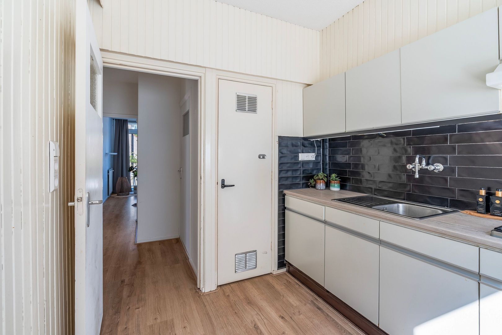 Aan de achterzijde van het appartement ligt de gesloten keuken, voorzien van gaskookplaat, afzuigkap en gootsteen – een fijne plek om te koken, met voldoende kastruimte en een vaste kast met de cv-opstelling. Hoofdslaapkamer met vaste kast en toegang tot het terras aan de voorzijde , ideaal als hoofdslaapkamer.
