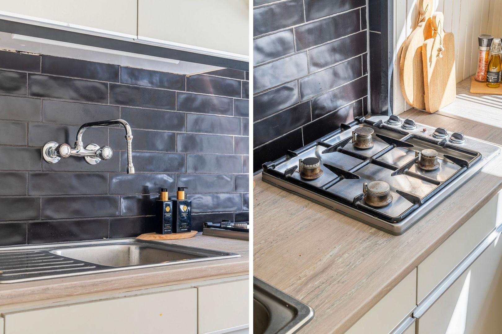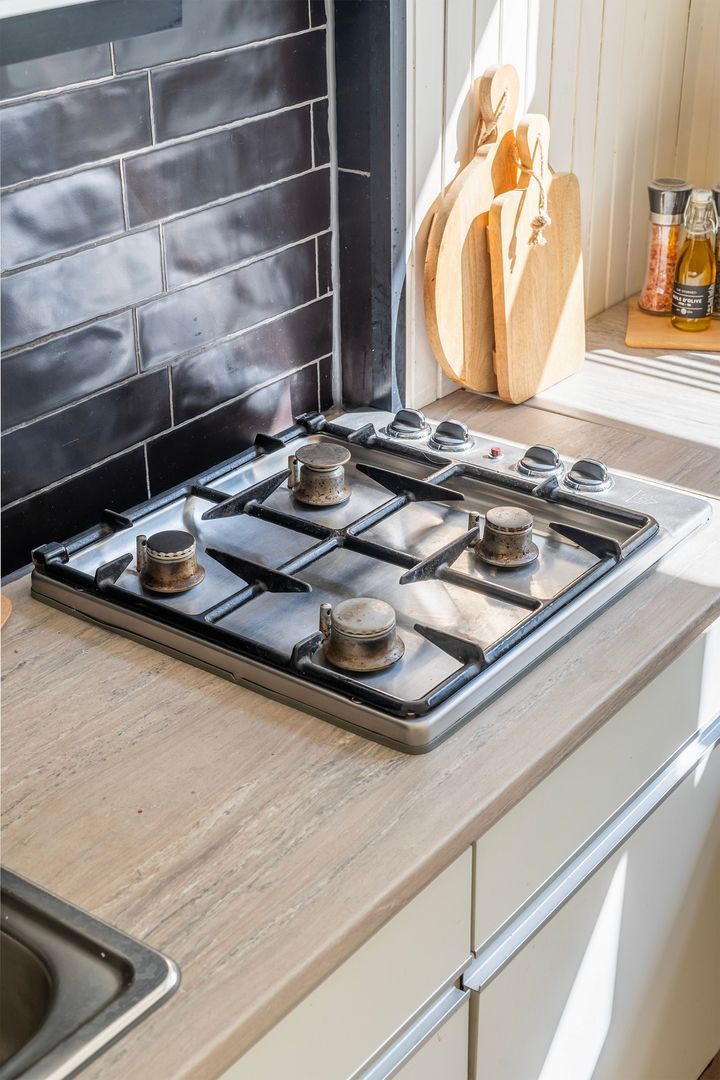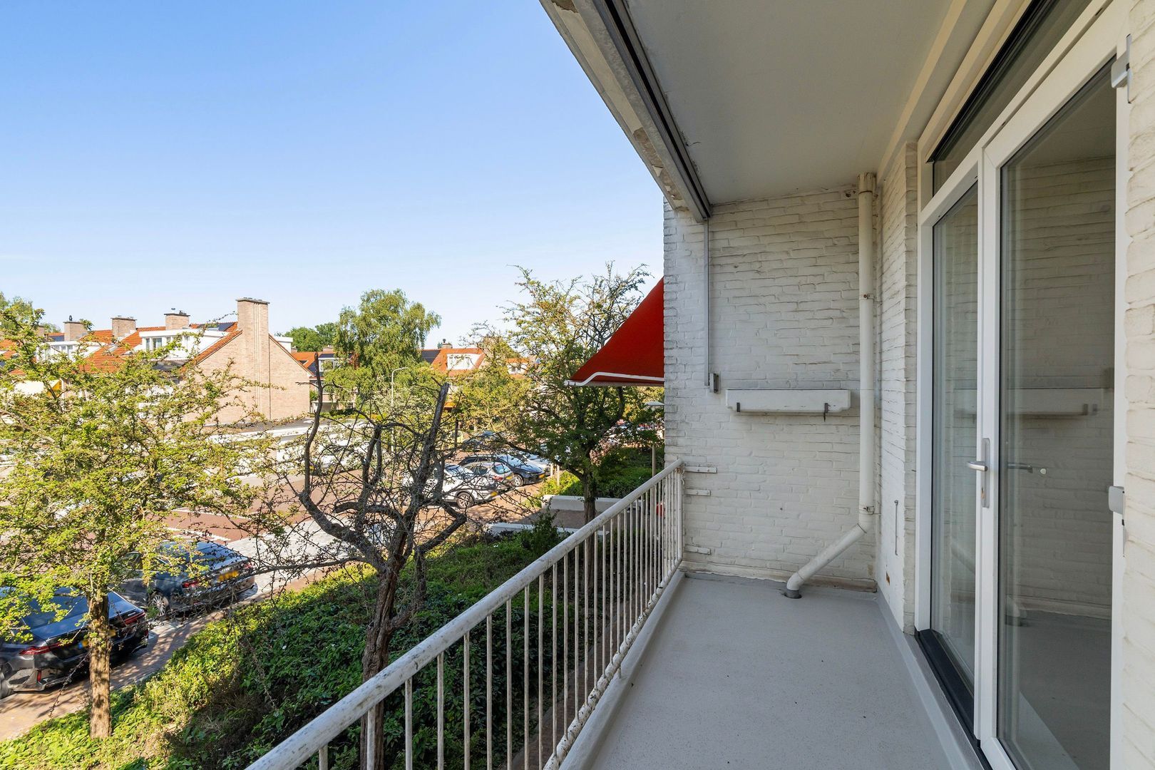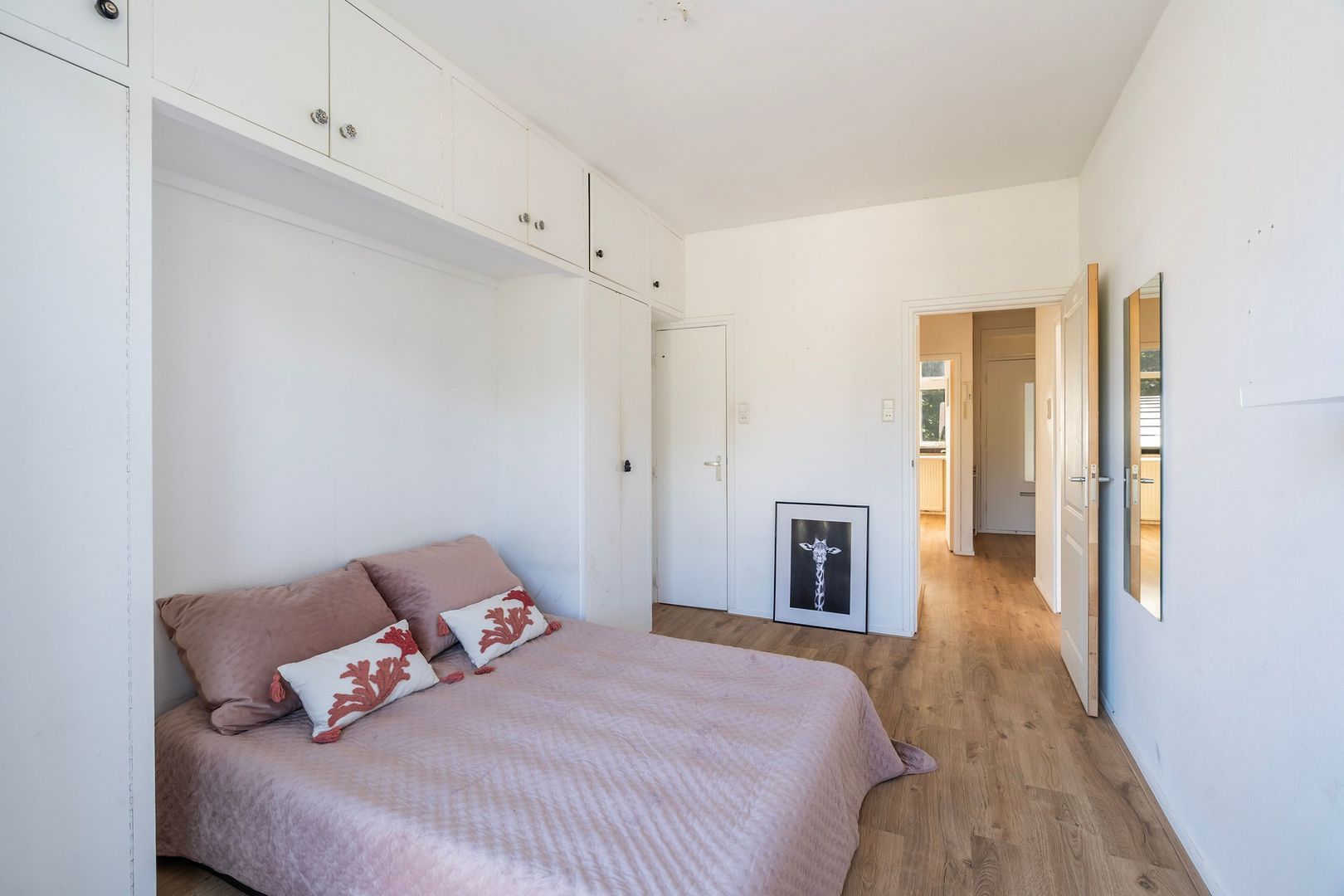 Aan de achterzijde van het appartement ligt de gesloten keuken, voorzien van gaskookplaat, afzuigkap en gootsteen – een fijne plek om te koken, met voldoende kastruimte en een vaste kast met de cv-opstelling. Hoofdslaapkamer met vaste kast en toegang tot het terras aan de voorzijde , ideaal als hoofdslaapkamer.