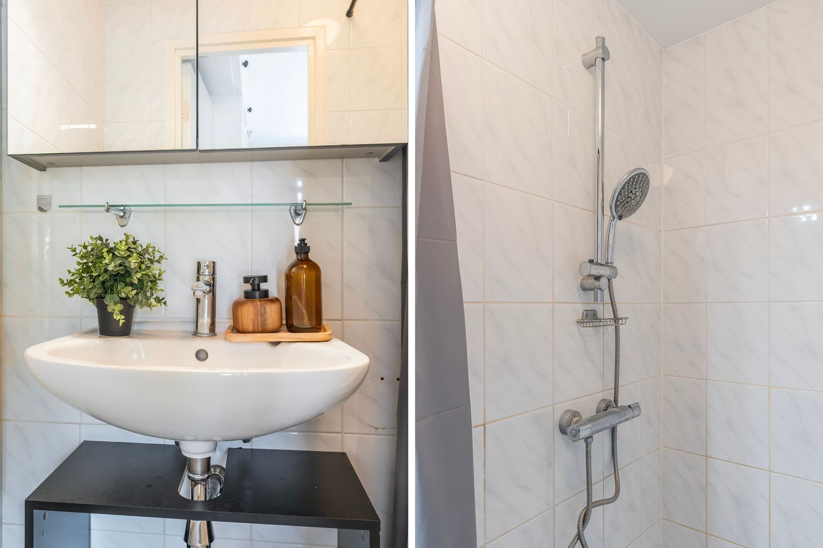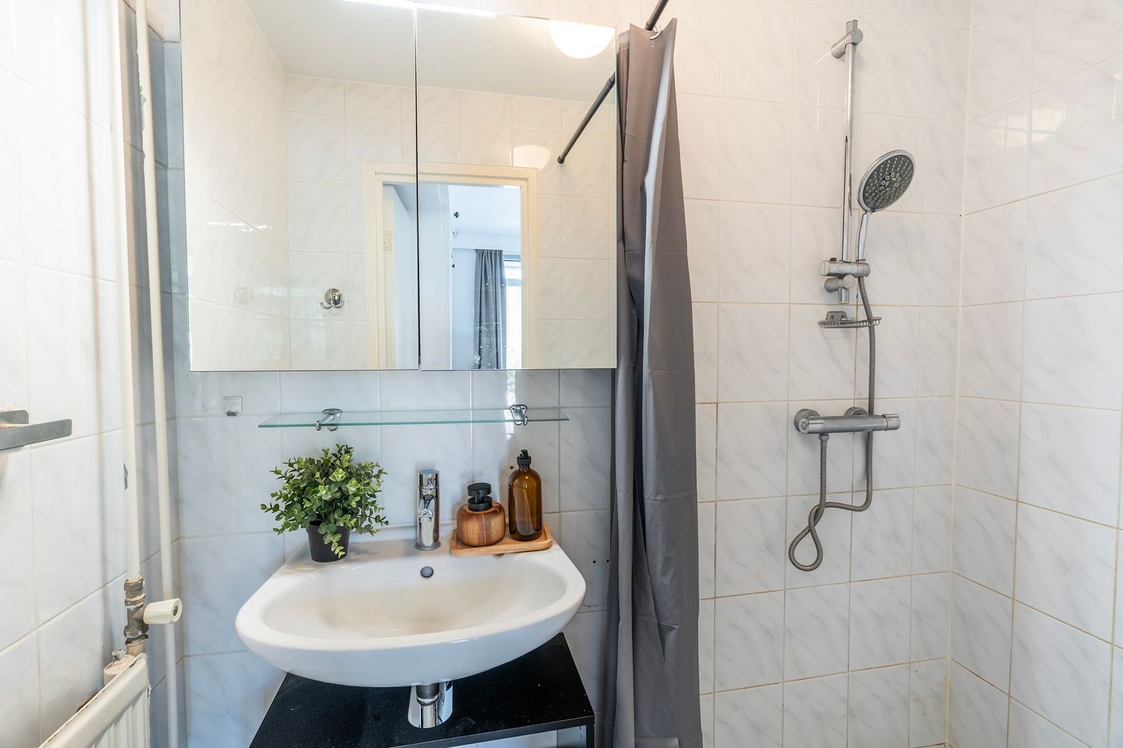 De nette badkamer is compact en efficiënt ingedeeld met een douche en wastafel.