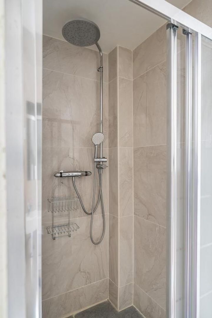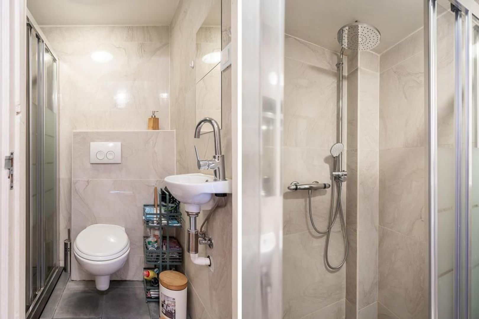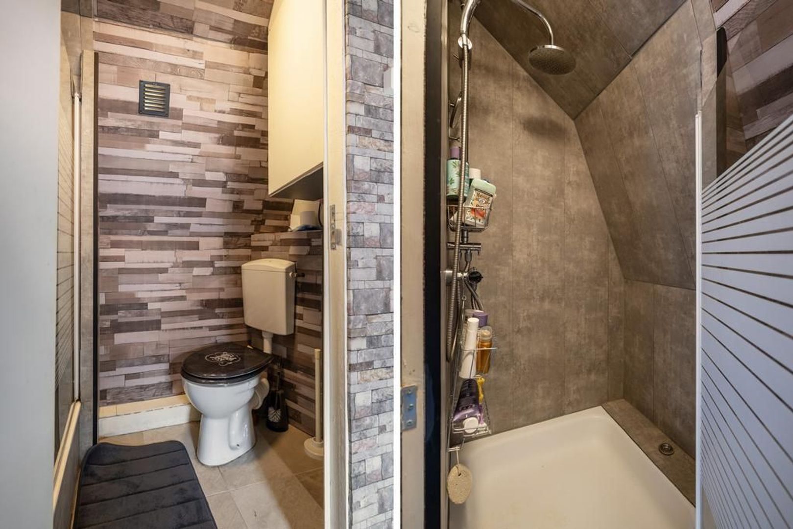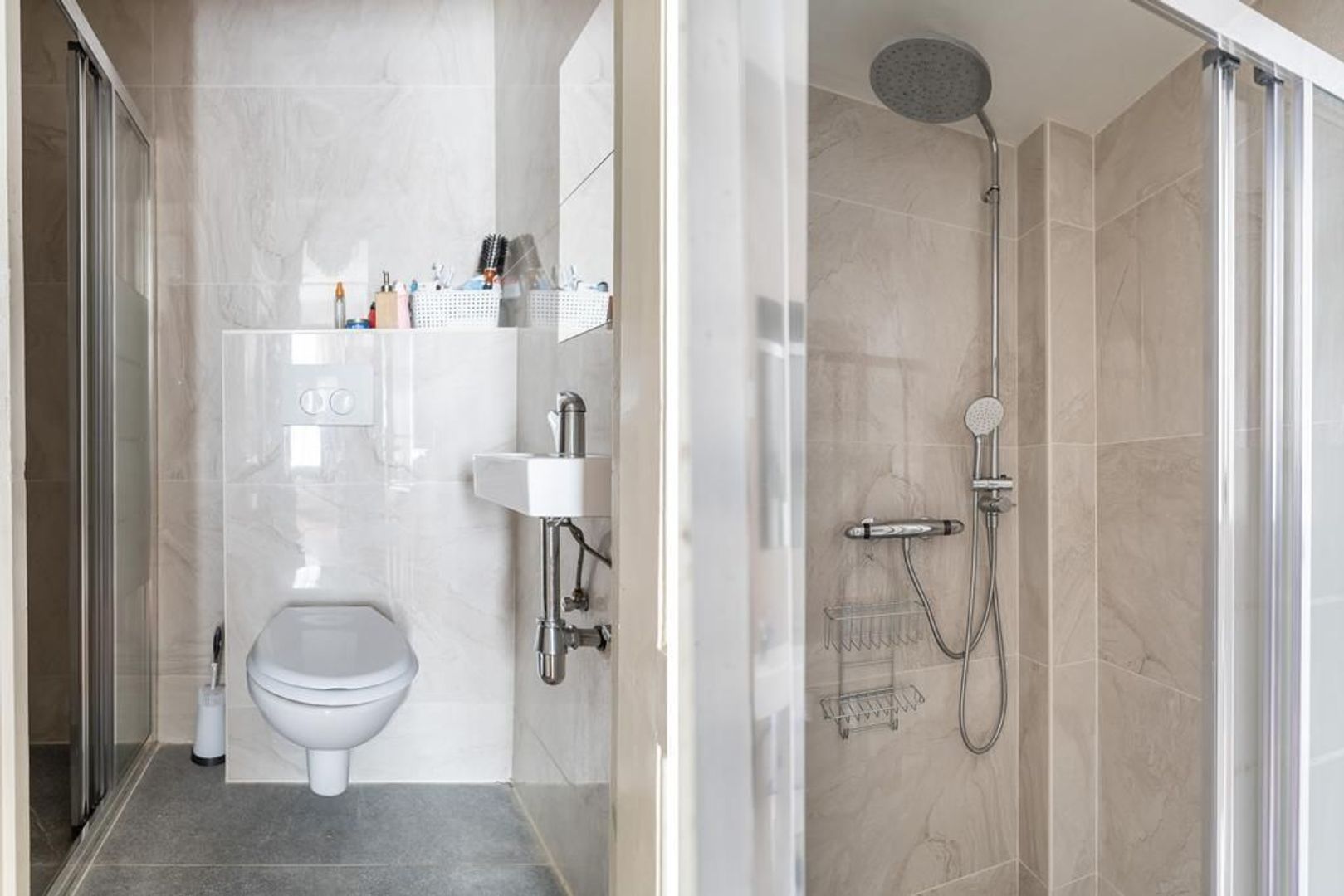 2e etage: overloop met douche/toilet combinatie; grote slaapkamer aan de voorzijde; grote slaapkamer aan de achterzijde met bergkast en toegang tot het balkon; kleine voorzijkamer met ingebouwde kast.