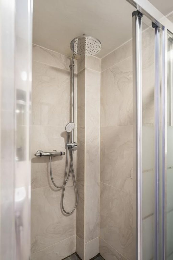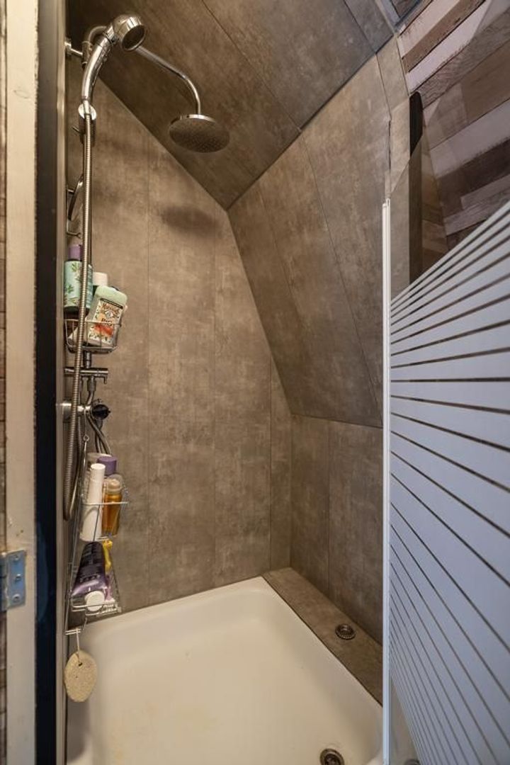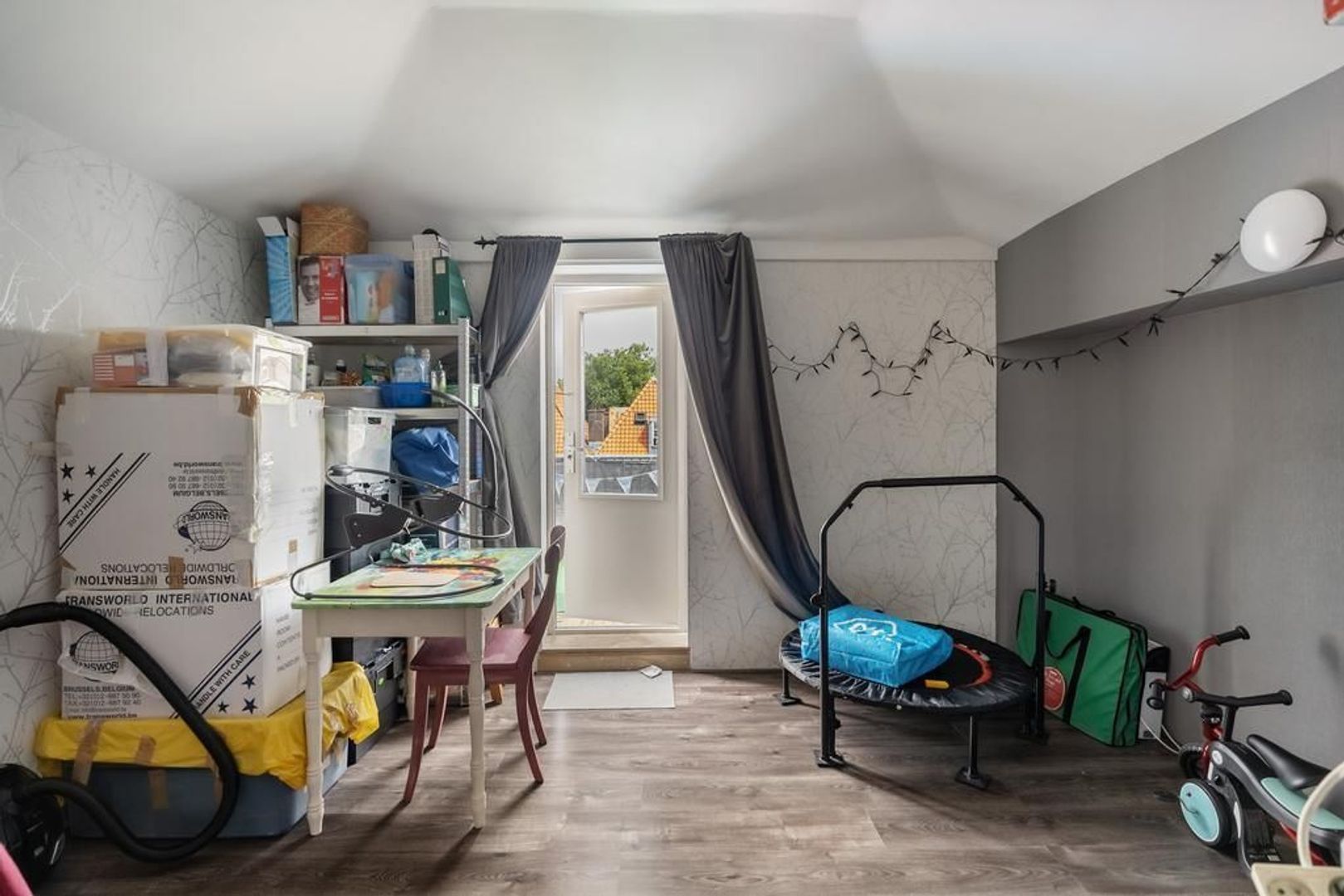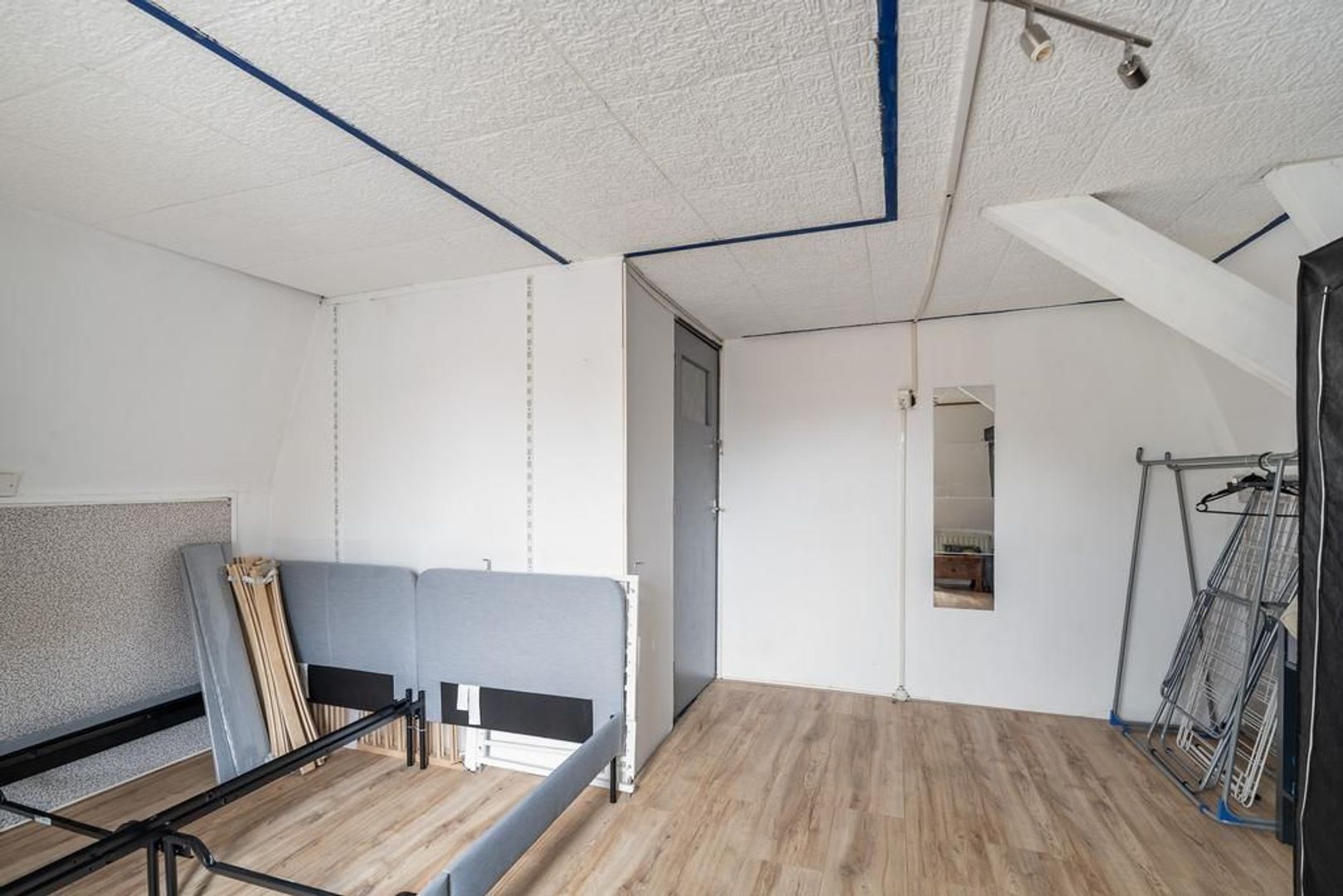 kapverdieping met overloop met wasruimte en badkamer met douche, toilet en wastafel; grote voorslaapkamer met kleine dakkapel; achterslaapkamer met toegang tot het terras. Dit terras ligt op het dak van de tussenbouw van de parterrewoning en is aangebracht in overleg met de eigenaren van het beneden huis.