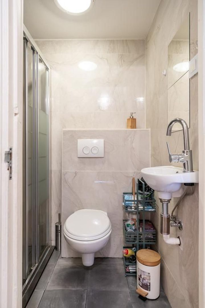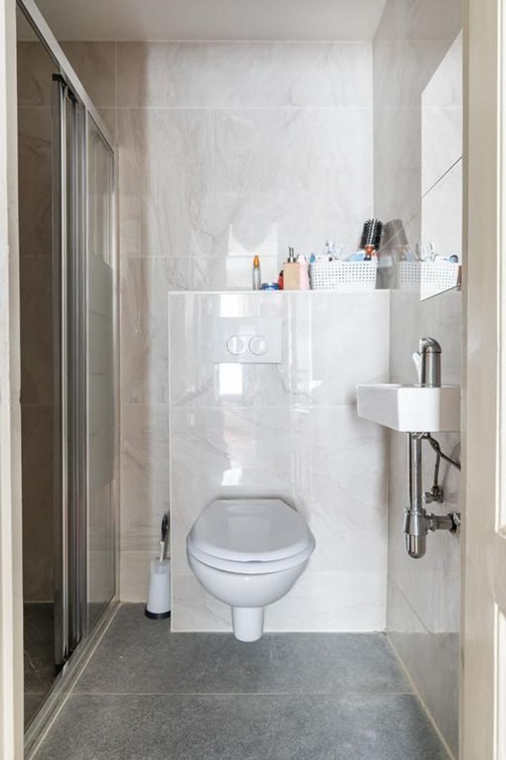 overloop met toilet/doucheruimte; dichte keuken aan de voorzijde; doorgebroken woonkamer met extra achterkamer;