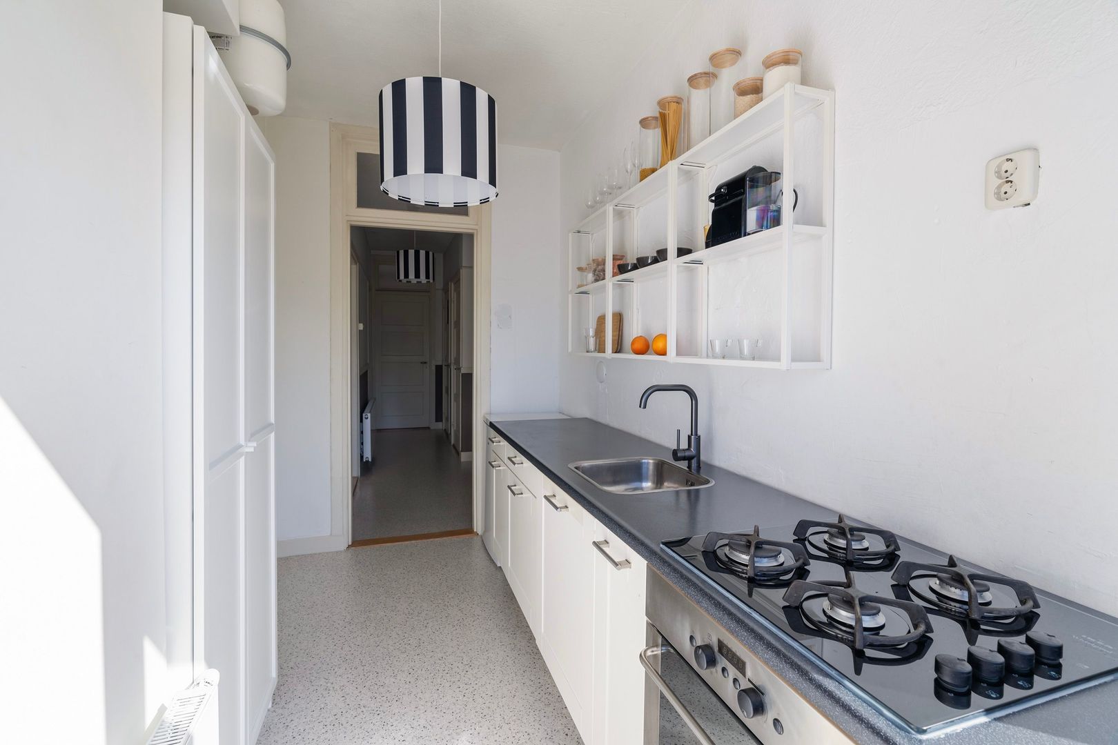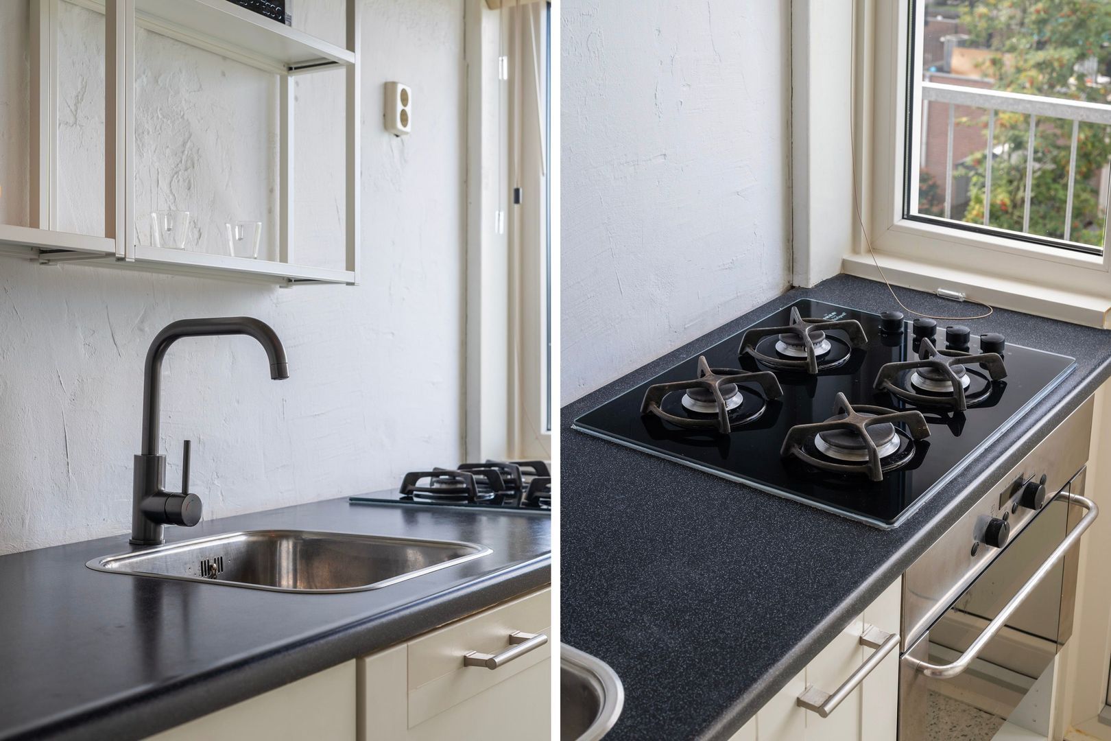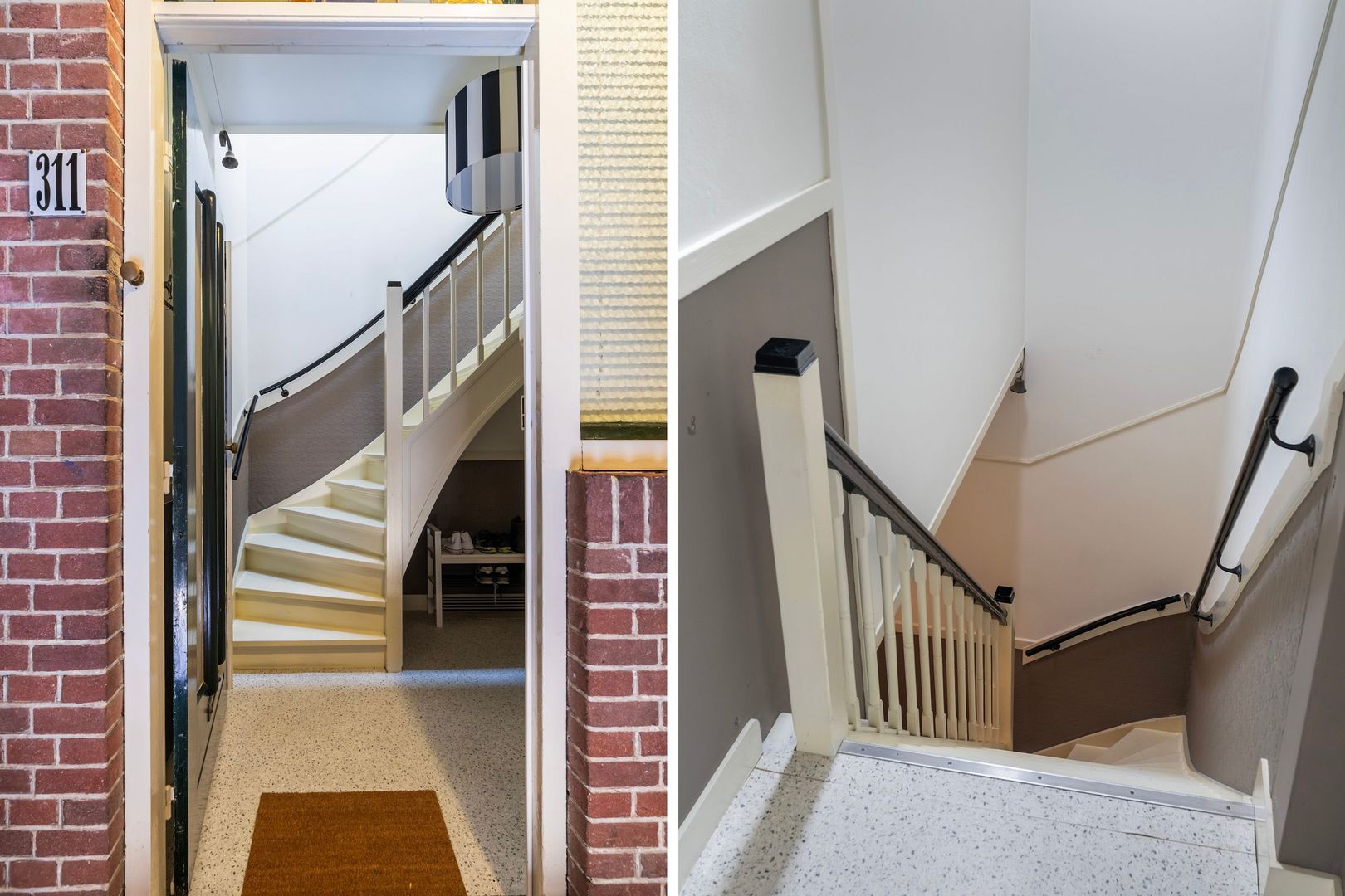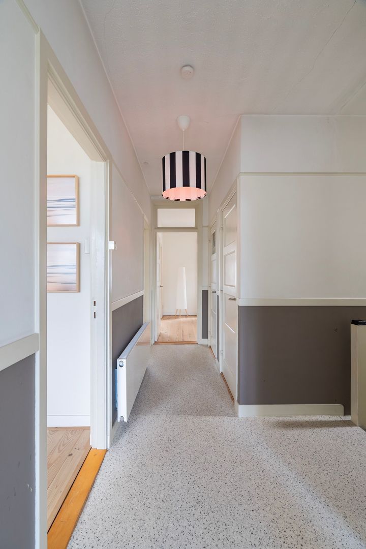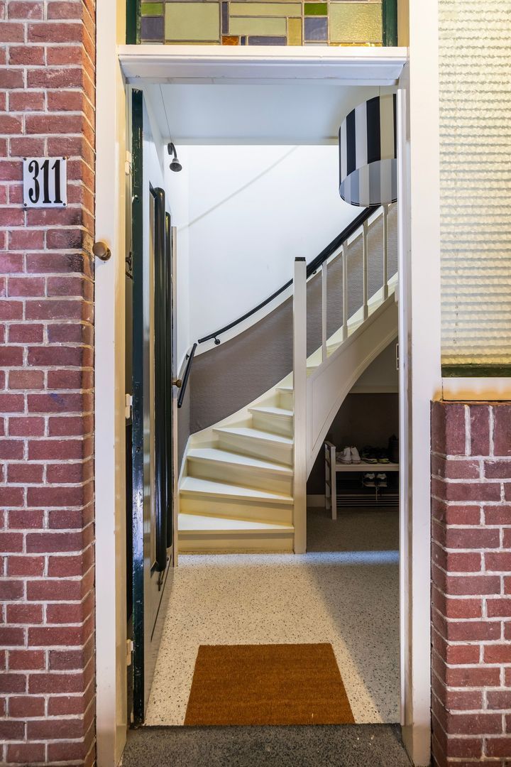 Via het open portiek bereikt u de voordeur op de eerste etage. Binnenkomst in een licht halletje met wat bergruimte en de ruimtelijke binnentrap naar de 2e etage; overloop die toegang biedt tot alle vertrekken. Ensuite woonkamer met keurige schuifseparatie voorzien van glas-in-lood. Aan weerszijden bevinden zich inbouwkasten. Zowel in de voorkamer als in de achterkamer zit een hardstenen schouw. De minimalistische keuken is voorzien van een oven, 4-pits gasfornuis, koel-/vriescombinatie en toegang tot het balkon. De slaapkamer aan de voorzijde (thans bij de woonkamer samengevoegd) kijkt uit over een rustige straat, wat zorgt voor een ontspannen sfeer. Aan de achterzijde bevindt zich een tweede slaapkamer. Het balkon is op het zuid-westen georiënteerd dus zon tot zonsondergang en uitzicht op de skyline van de stad.