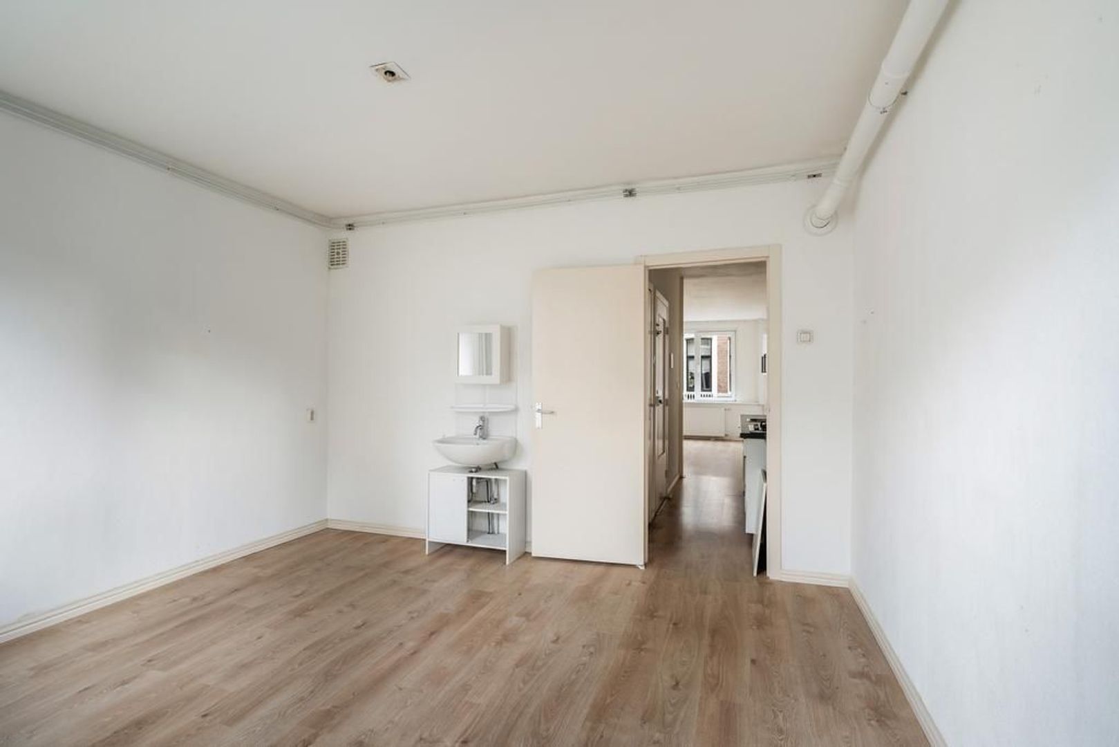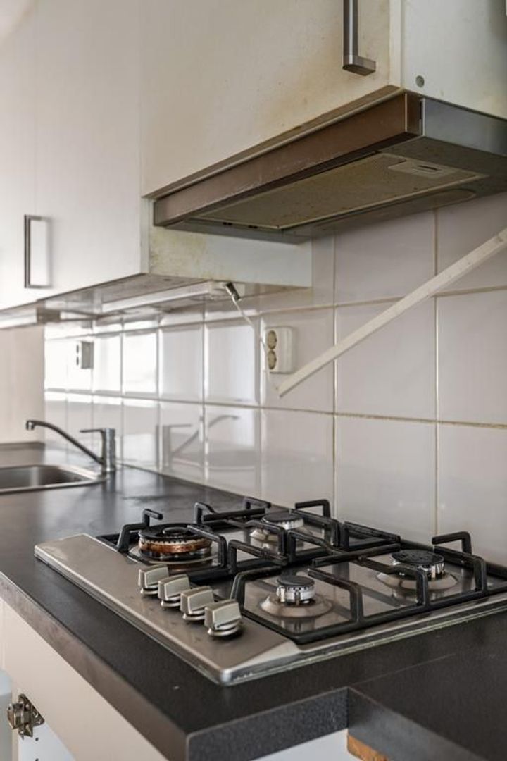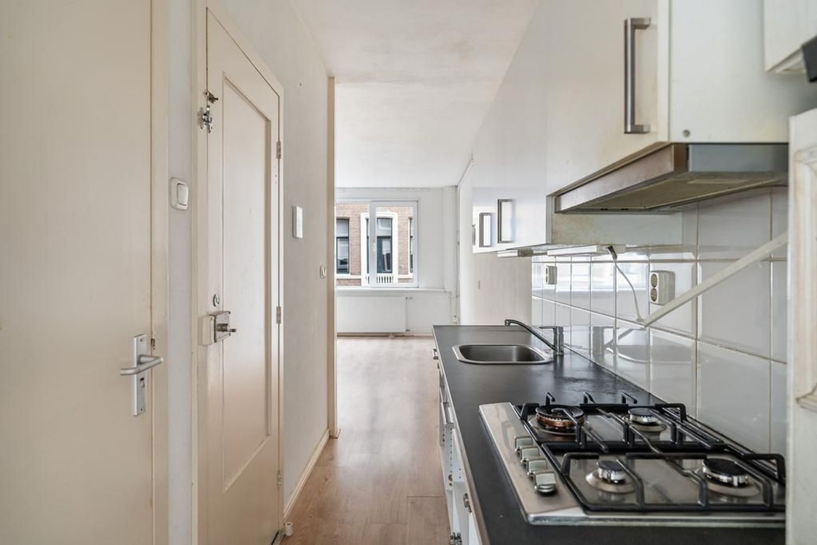 Entree woning op de 1e etage: lichte woonkamer aan de voorzijde voorzien van laminaatvloer; doorloop naar de achterzijde met een tussenliggende eenvoudige open keuken met gaskookplaat, vlakscherm afzuigkap, opstelplaats cv-ketel; badkamer met toilet met achtergelegen inloopdouche en handdoekradiator; ruime slaapkamer aan de achterzijde met wastafel en toegang tot zonnig balkon over de volle breedte, gelegen op Zuidwesten.