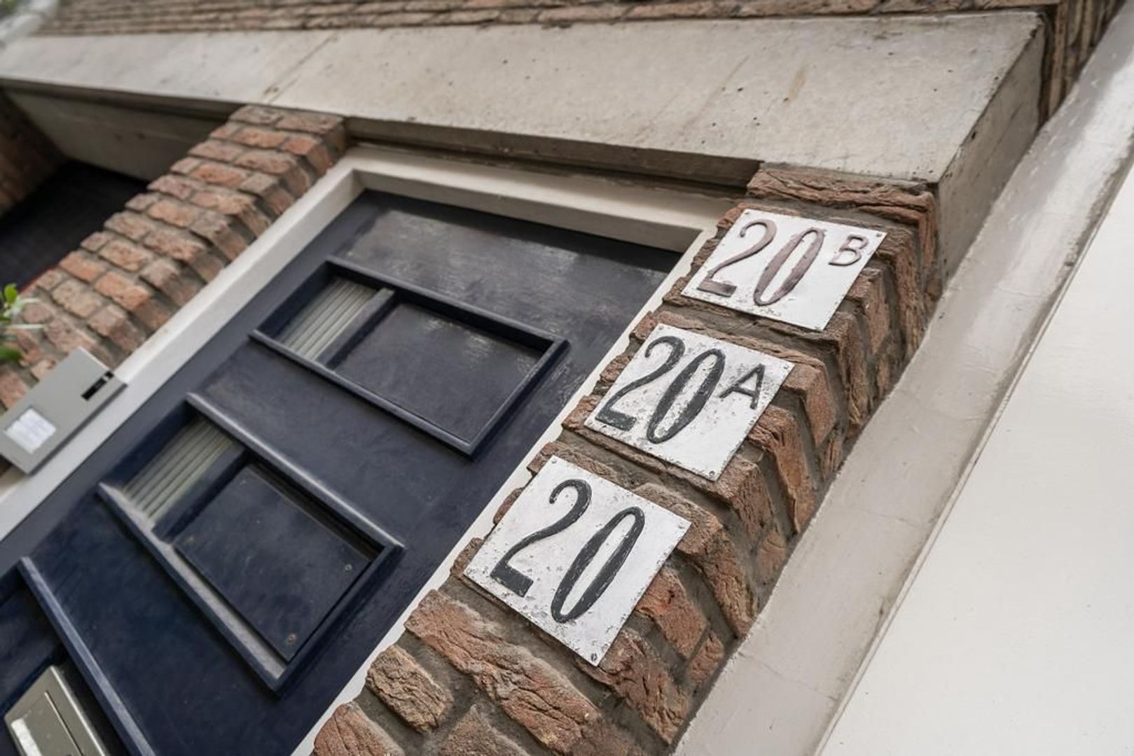 Gemeenschappelijk entree met bel- en brievenbus tableau en trappenhuis.