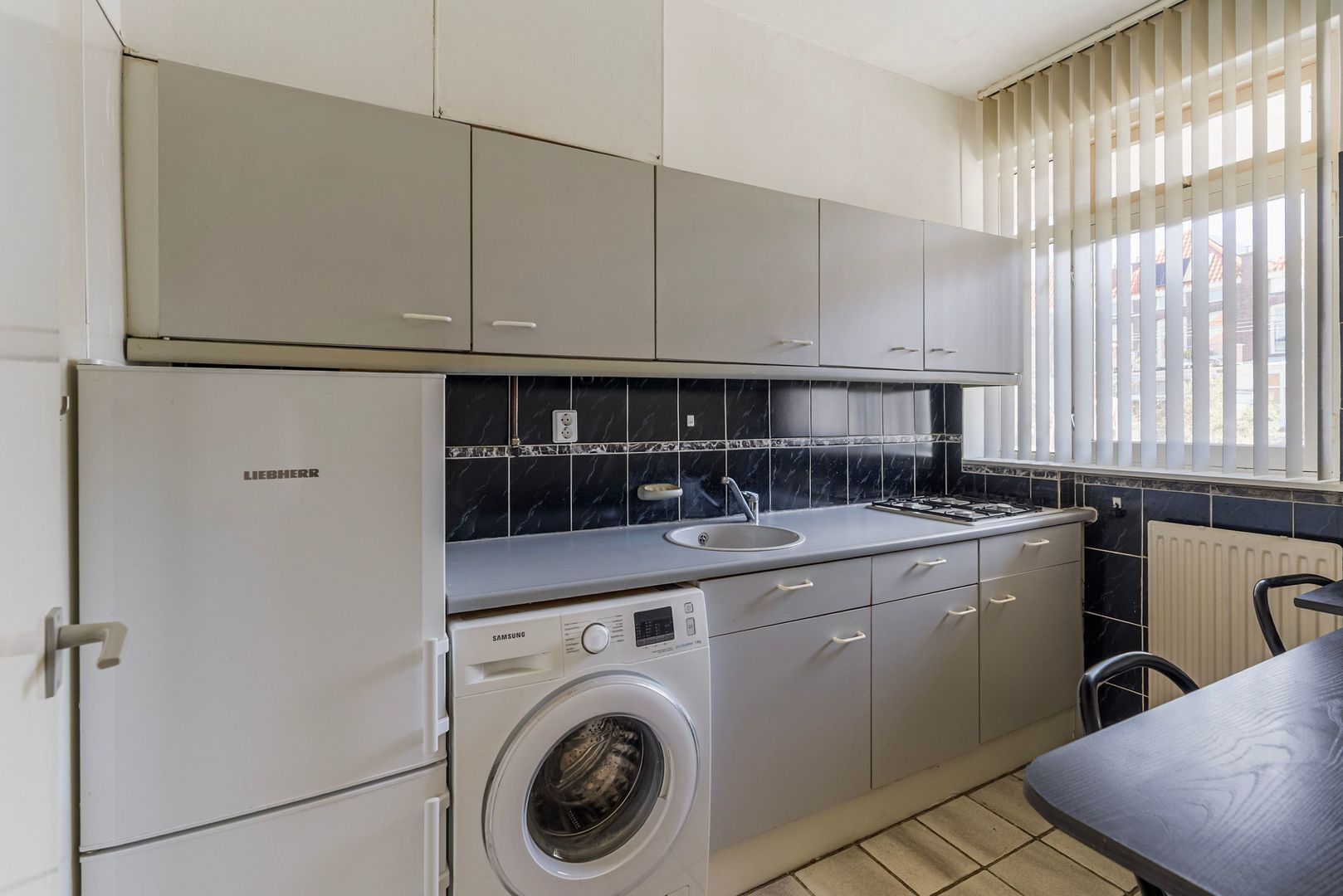 Afgesloten centrale entree met trapopgang naar de eerste verdieping. Via de galerij toegang tot het appartement. tochtportaal met meterkast; gang; L-vormige woonkamer aan de straatzijde met 2 vaste kasten; eenvoudige doch degelijke keuken met ingebouwde kookplaat en wasmachineaansluiting; ruime slaapkamer aan de galerijzijde; eenvoudige badkamer met douche en wastafelmeubel; keurig toilet.