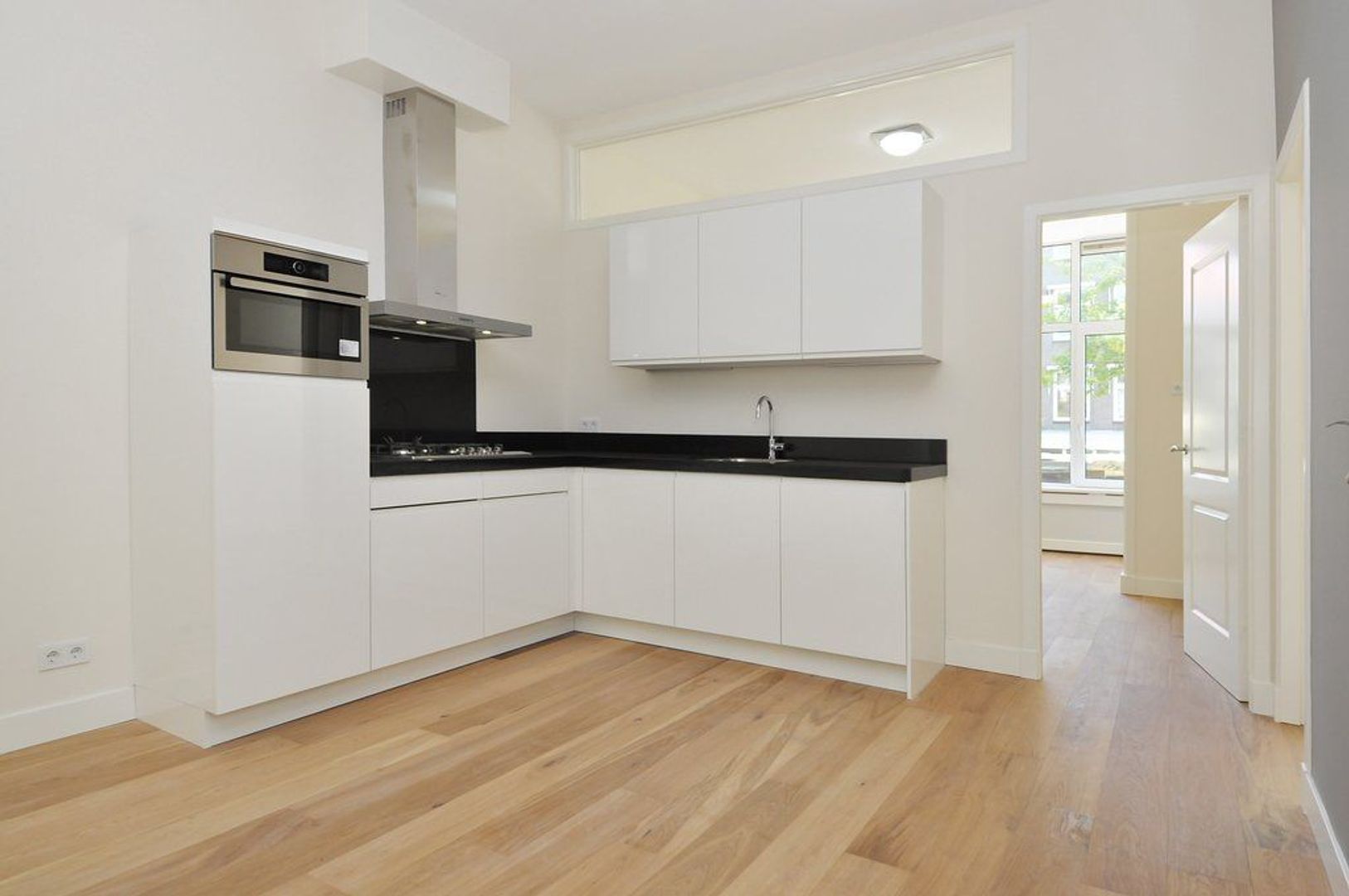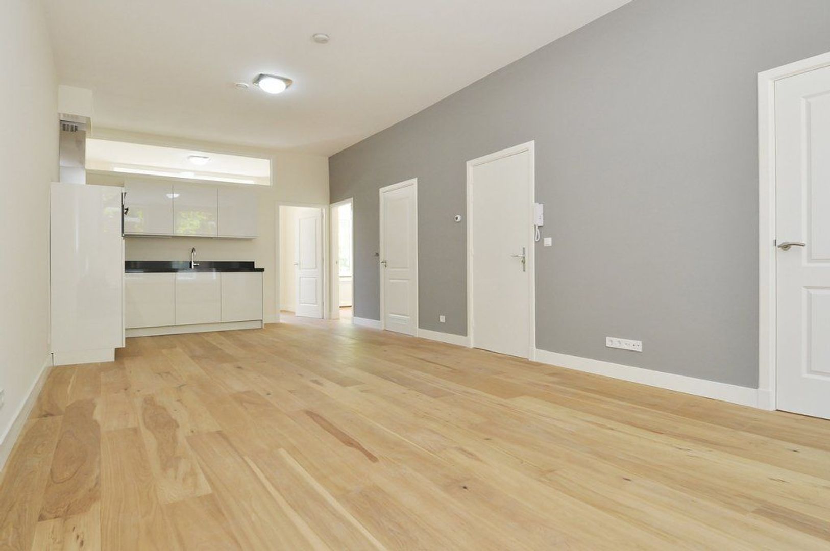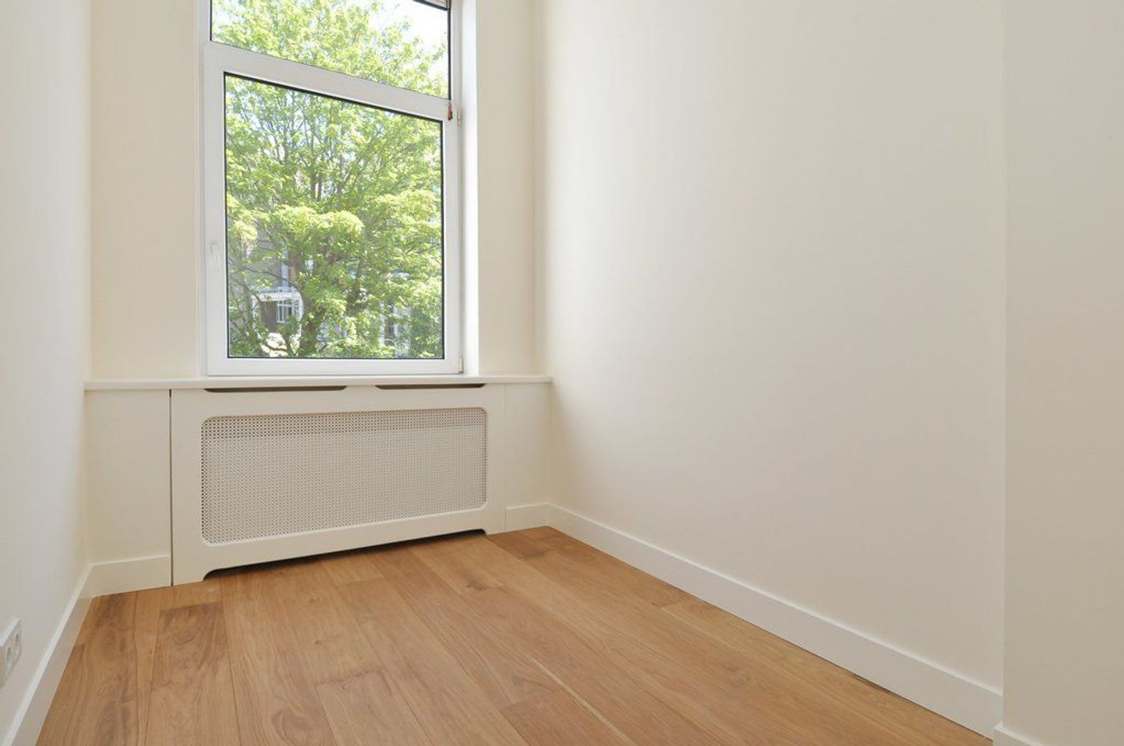 Closed central staircasehall, entrance apartment on the 1st floor, hall, spacious and bright living room with bay window and brand new luxury kitchen with all equipment, natural stone countertop, perfect bathroom with shower, washbasin and towel radiator,. Master bedroom (approx. 20 m2) second bedroom (approx. 3.30 x 3.05) and front side bedroom (approx. 2.02x2.22)