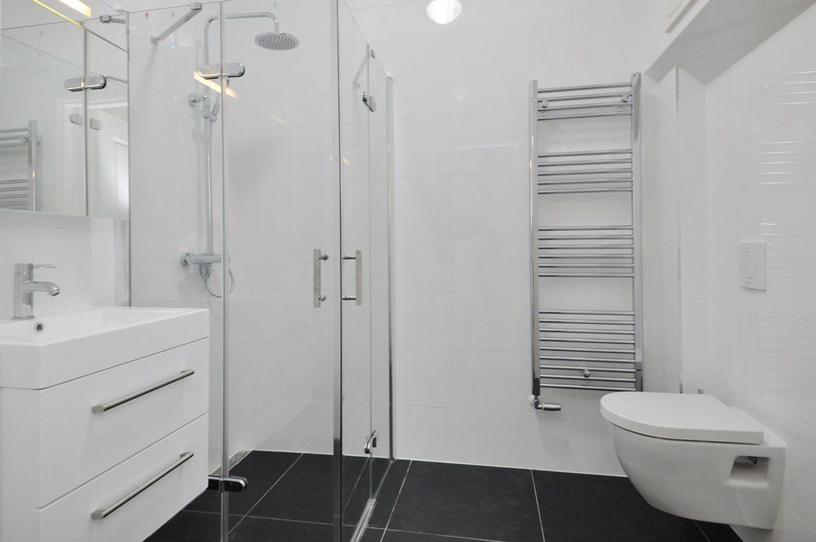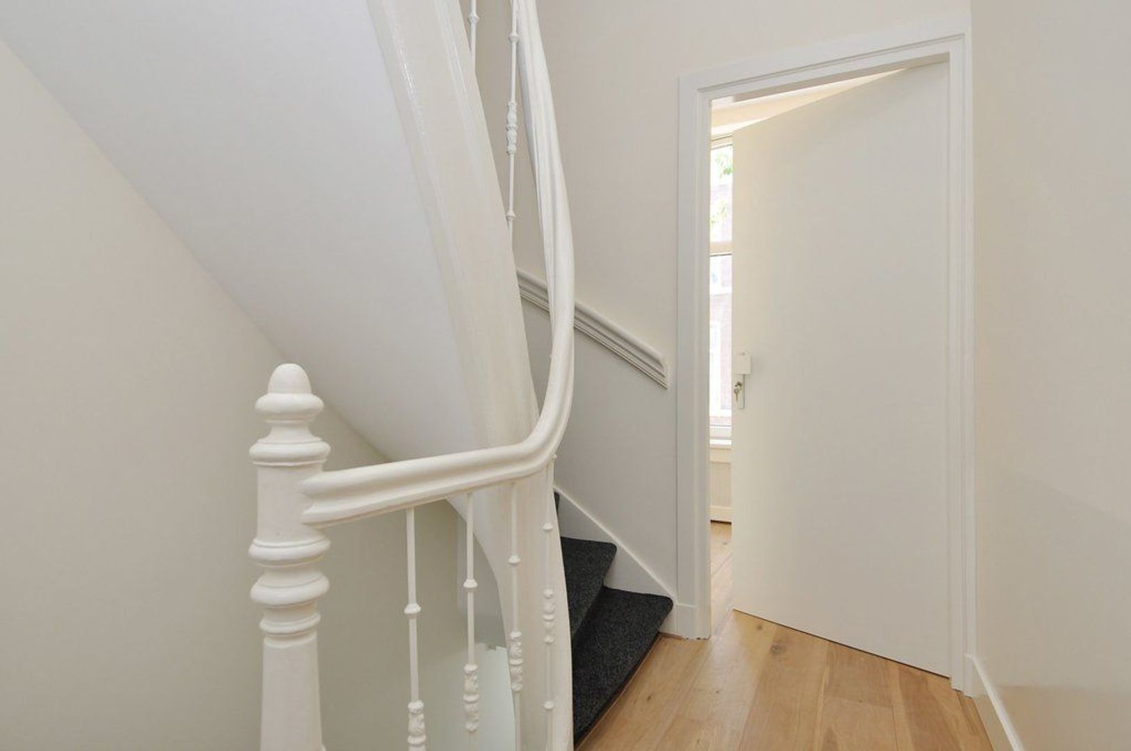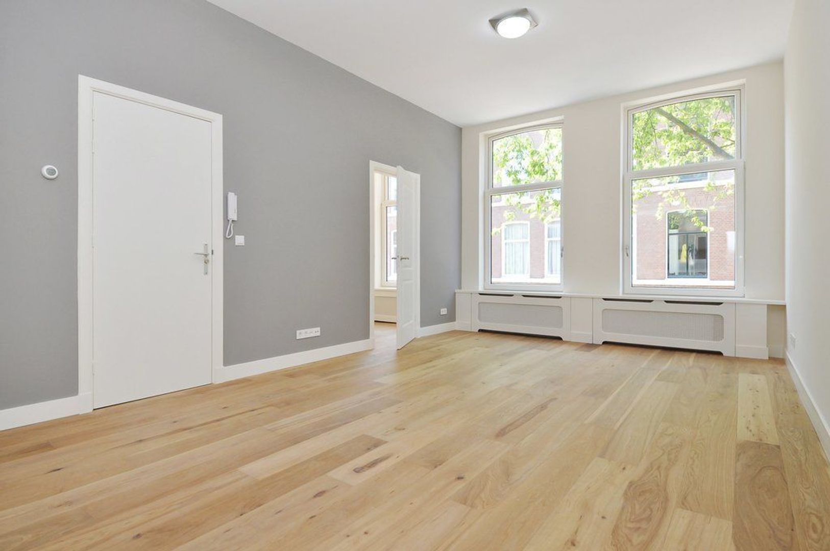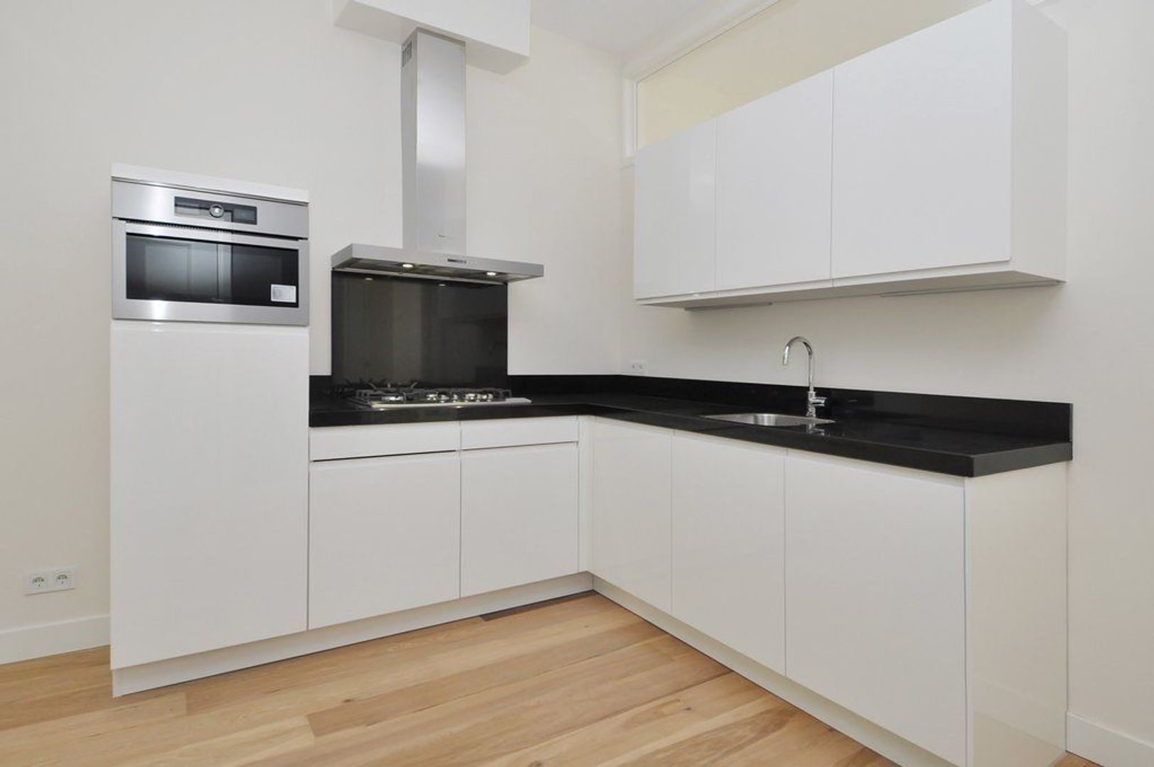 Closed central staircasehall, entrance apartment on the 1st floor, hall, spacious and bright living room with bay window and brand new luxury kitchen with all equipment, natural stone countertop, perfect bathroom with shower, washbasin and towel radiator,. Master bedroom (approx. 20 m2) second bedroom (approx. 3.30 x 3.05) and front side bedroom (approx. 2.02x2.22)