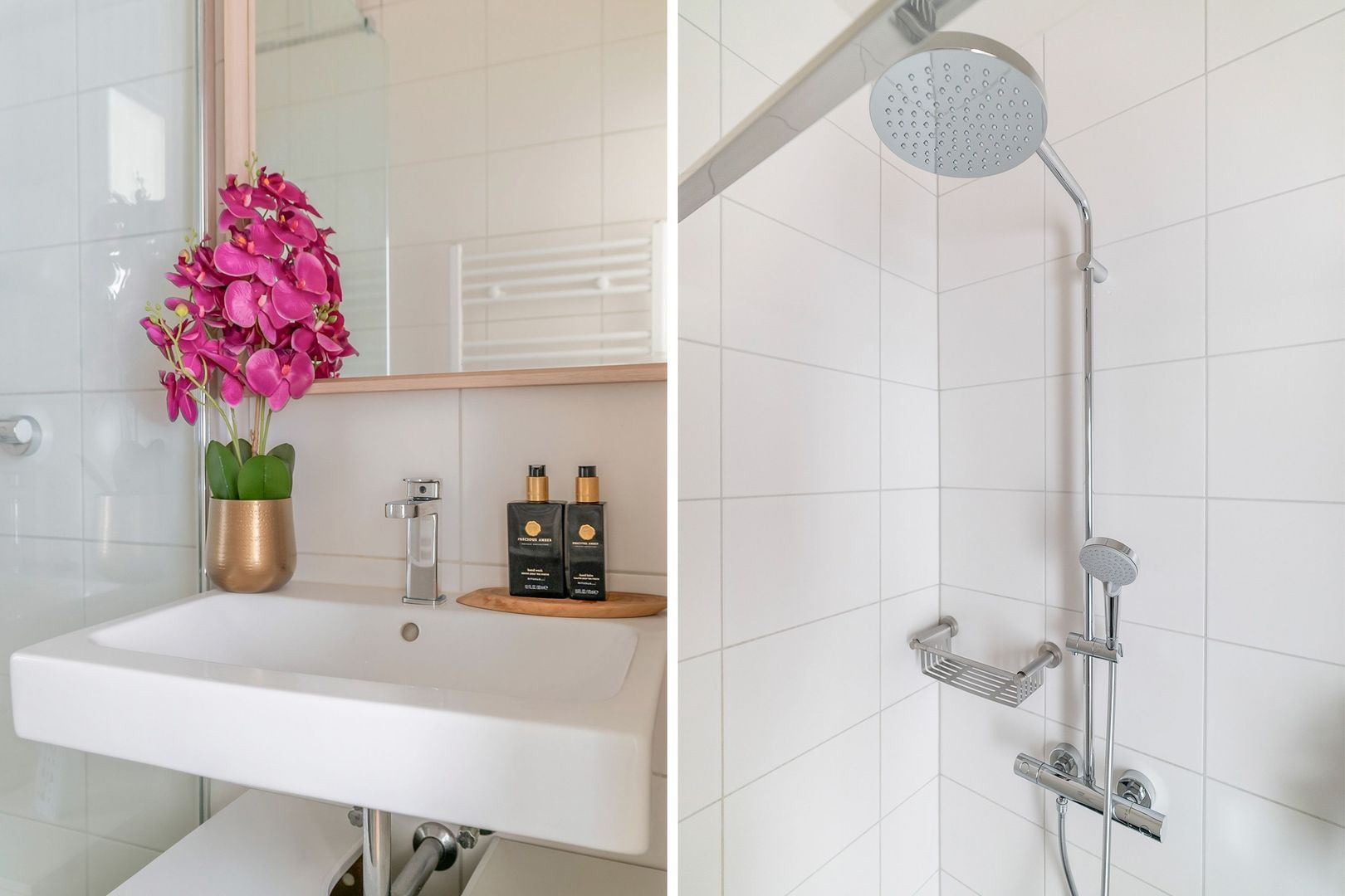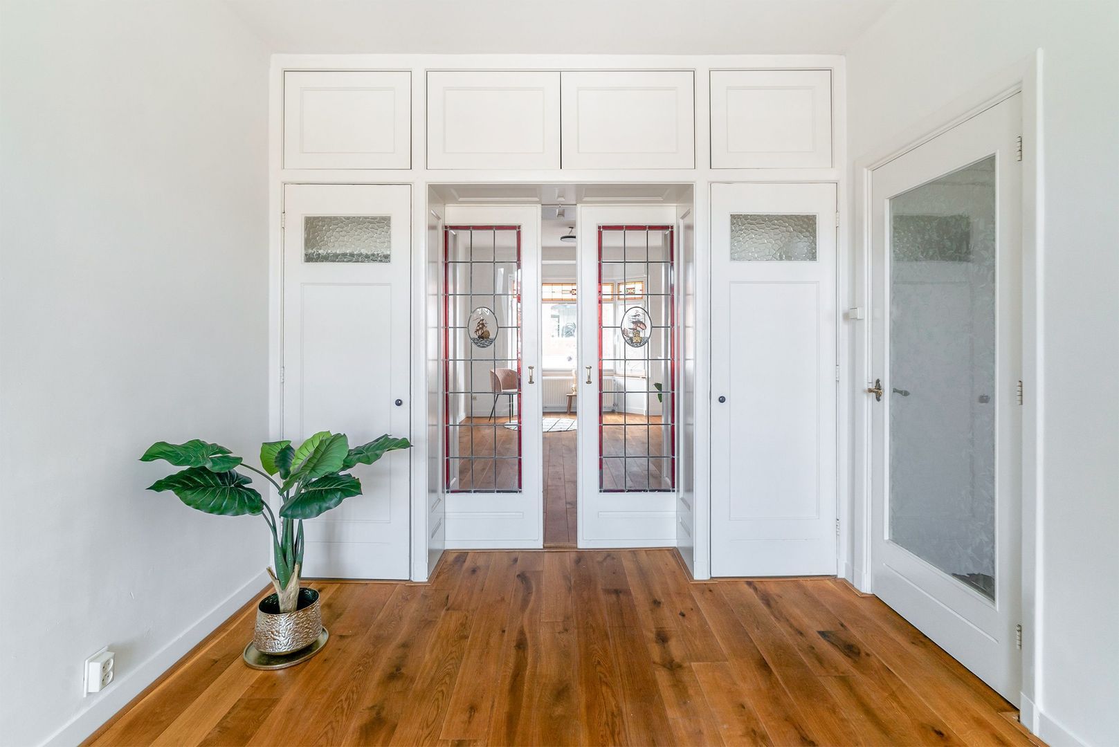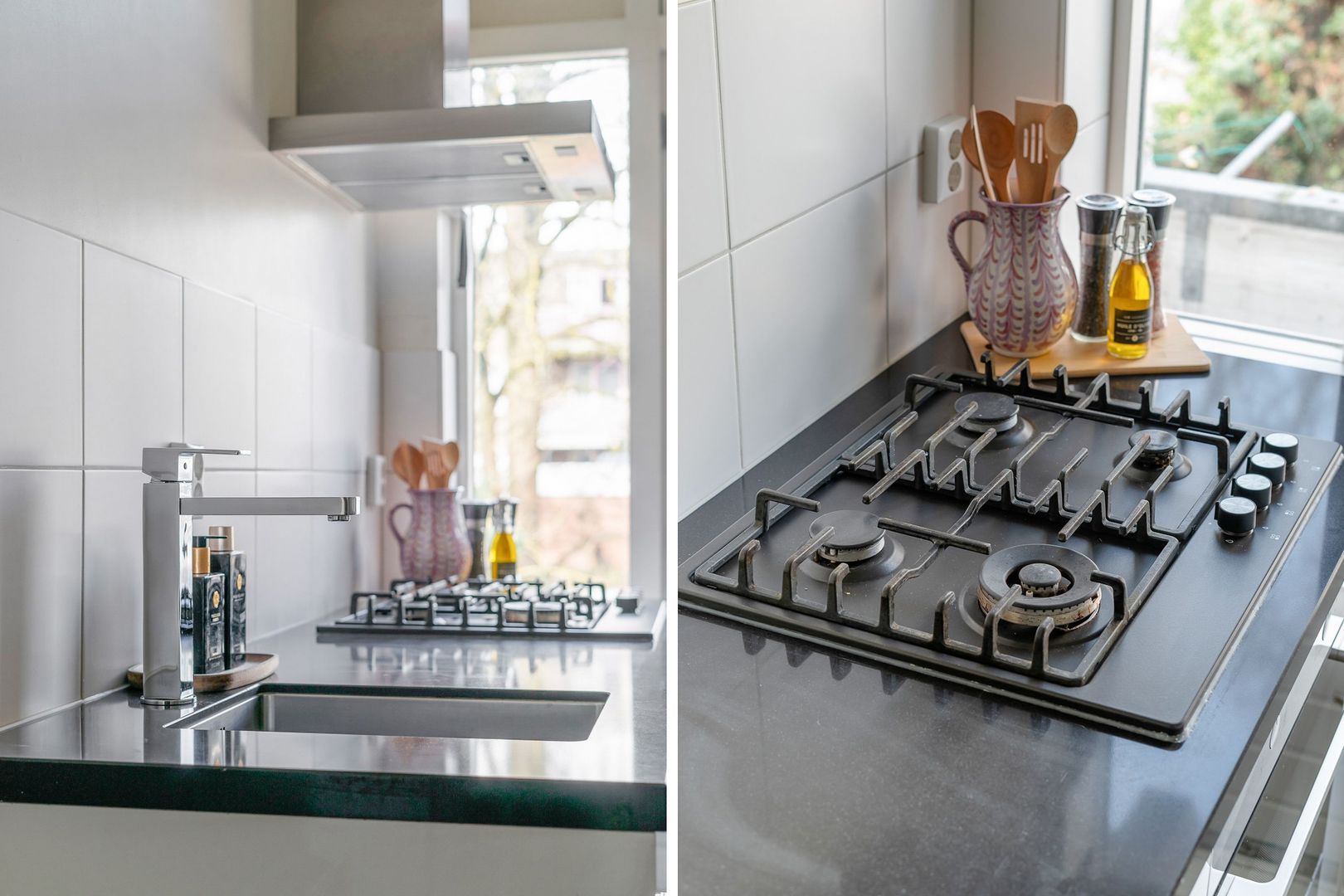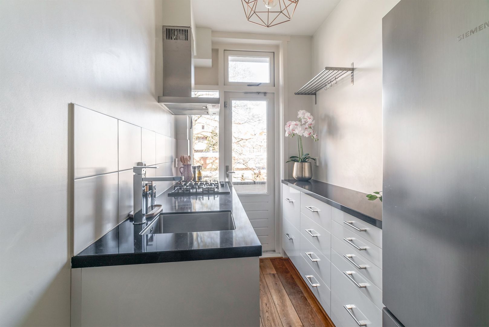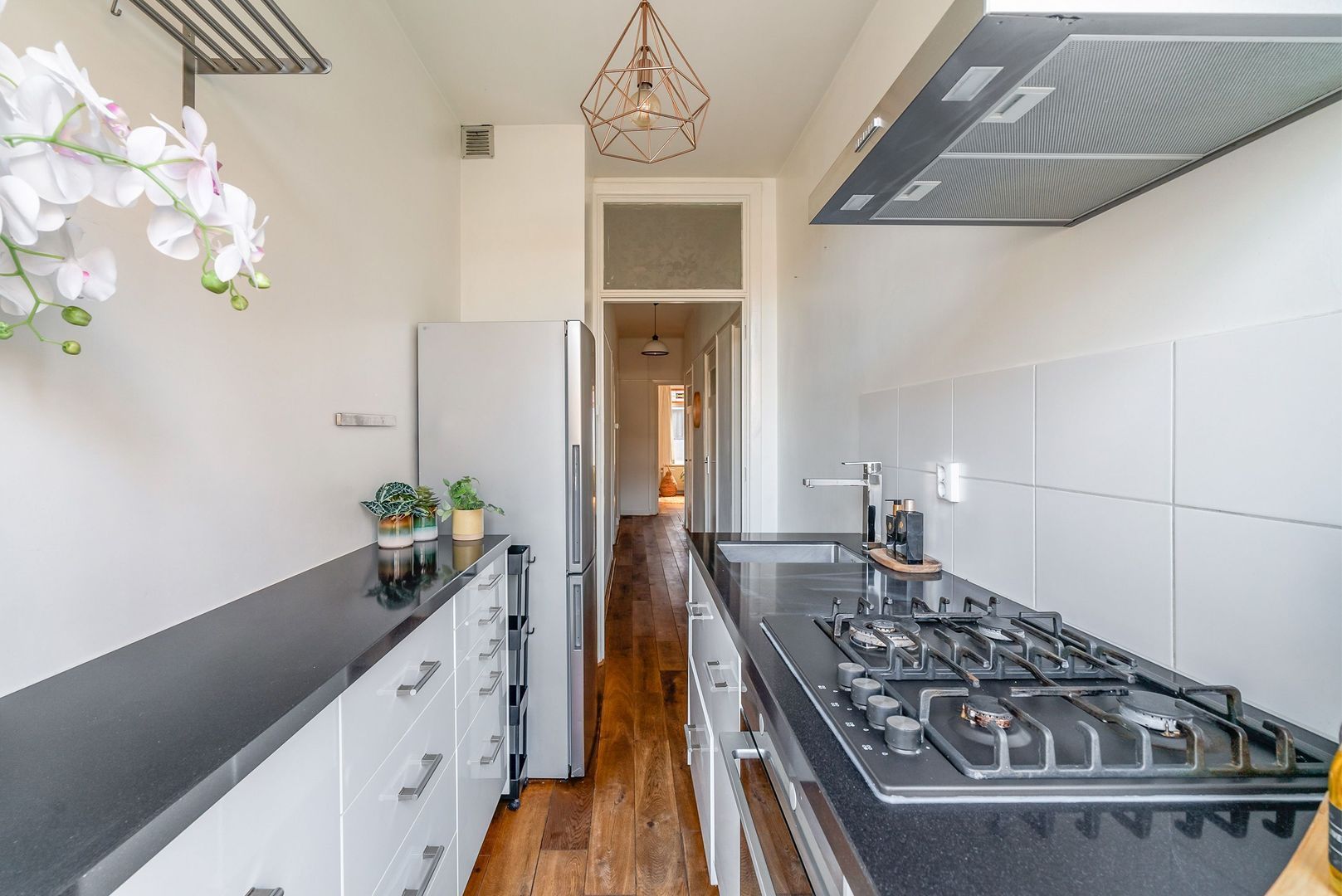 Gesloten portiek met trap naar 1e etage; woningentree; hal; gang met meterkast; vaste kast met cv-ketel en wasmachine aansluiting; modern toilet (wandcloset) met fontein; grote bergkast; moderne keuken met een fraai natuurstenen aanrechtblad, gaskookplaat, afzuigkap, oven, koelkast, vriezer, vaatwasser en toegang tot het balkon gelegen op de middagzon; ruime woonkamer ensuite met originele schuifseparatie en vaste kasten, mogelijkheid om een 3e slaapkamer te creëren; 1e slaapkamer aan de voorzijde; 2e slaapkamer aan de achterzijde; moderne badkamer met een inloopdouche, wastafelmeubel en handdoekradiator;