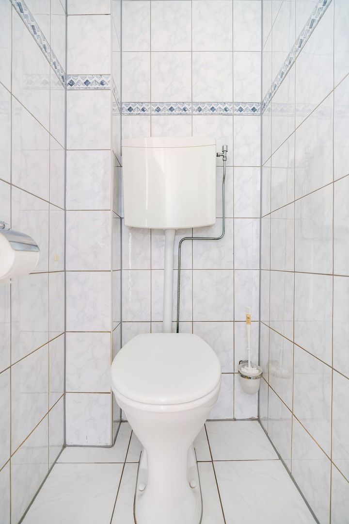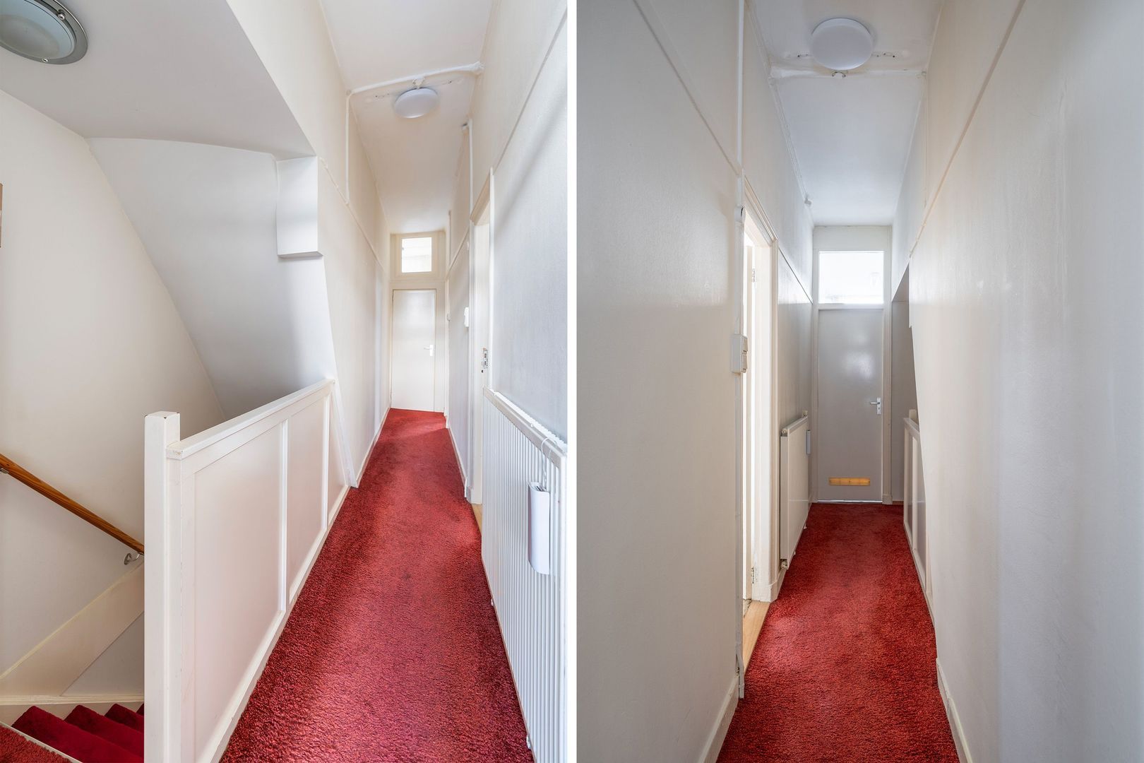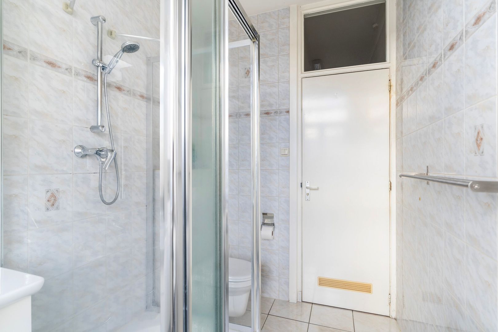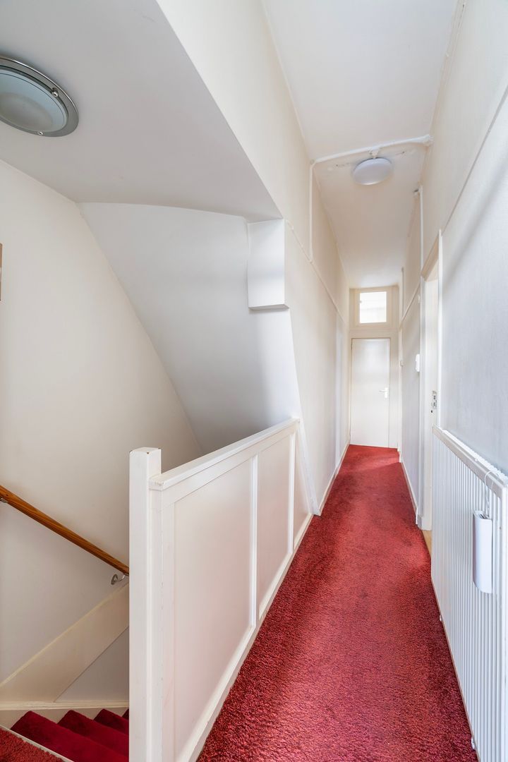 Via de hal trap naar de 1e etage; royale overloop; grote slaapkamer aan de voorzijde; grote slaapkamer aan de achterzijde; voorzijkabinet; badkamer met douche, wastafel, opstelplaat voor wasmachine en 2e toilet.