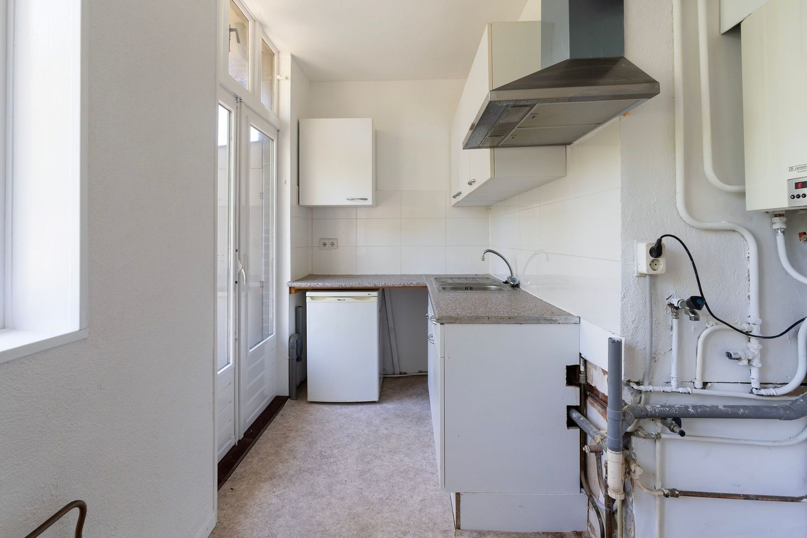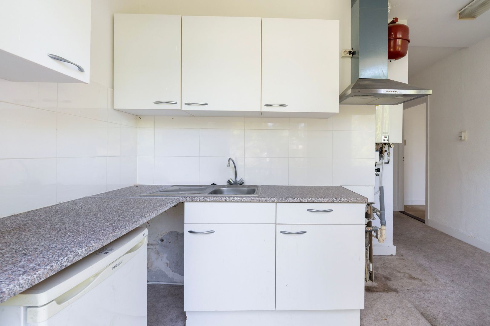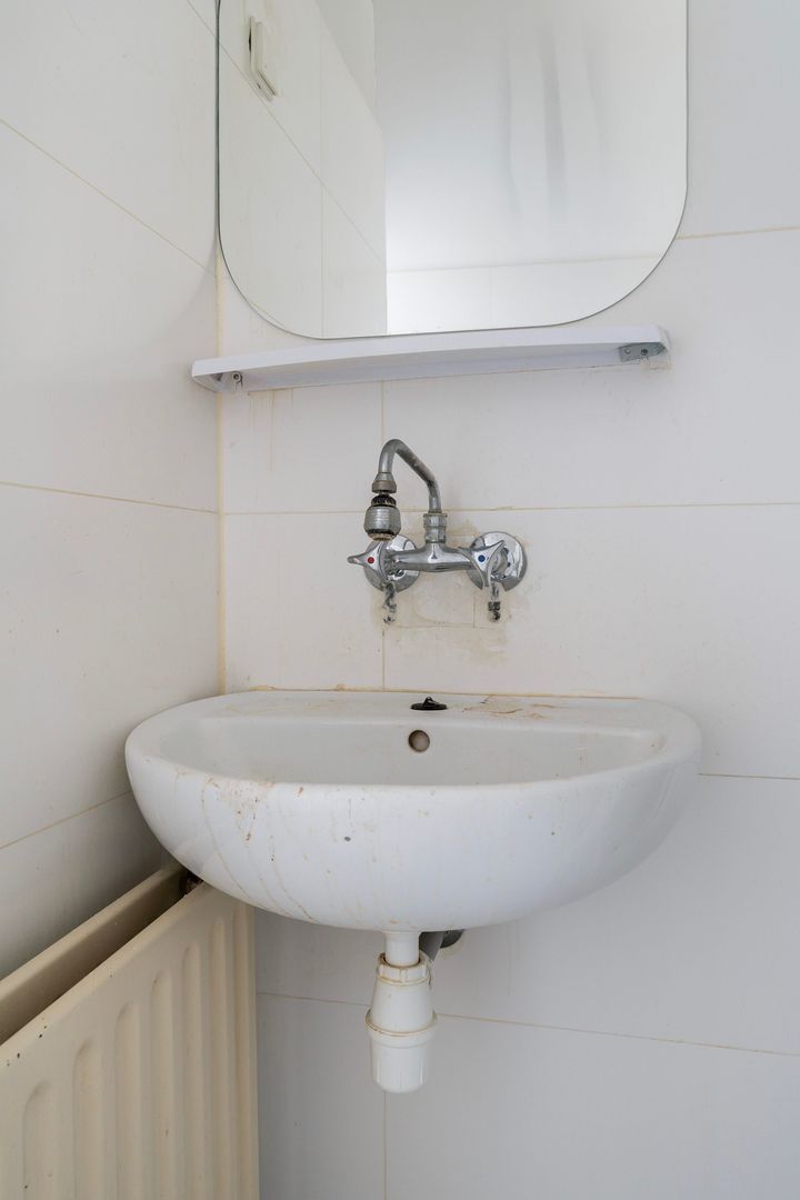 Woningentree op de 1e etage via open portiek; gang met de meterkast en bergkast; ruime woonkamer met een sfeervolle erker; eenvoudige keuken in hoekopstelling met de cv-opstelling, wasmachine aansluiting en openslaande deuren naar het balkon; 1e slaapkamer aan de voorzijde; 2e slaapkamer aan de achterzijde; eenvoudige badkamer met een inloopdouche, wastafel en toilet;