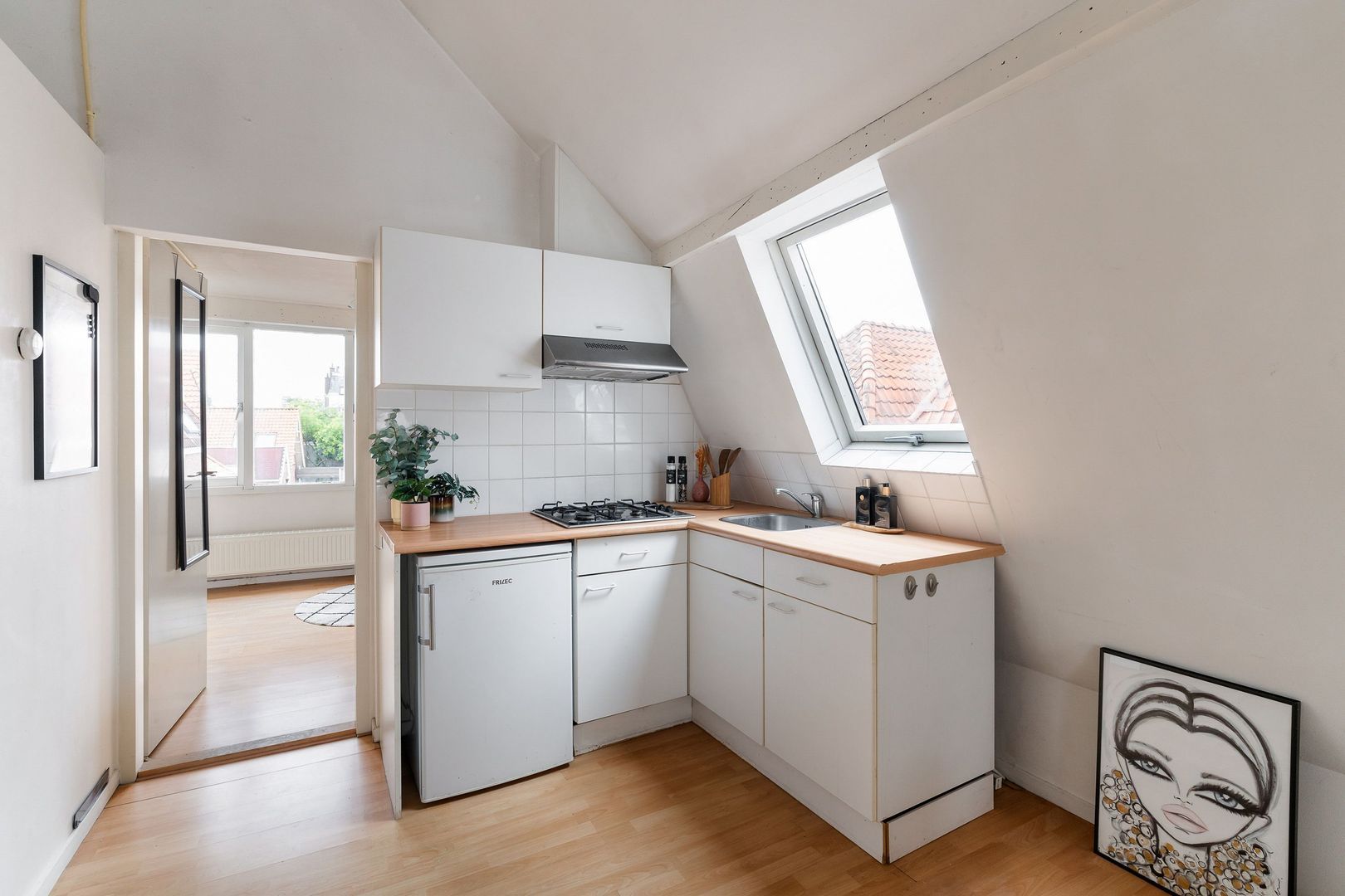 Afgesloten centrale entree; hal met binnentrap naar de woningentree op de 1e etage; trap naar 2e etage; overloop ruime woonkamer met charmante spanten in het zicht ca.4.98x5.78 v.v. nette open keuken voorzien van een gaskookplaat, afzuigkap en veel kastruimte; ruime slaapkamer ca. 3.11x4.98 met dakkapel ; degelijke badkamer ca. 1.95x1.71met een douchecabine, wastafel en toilet;