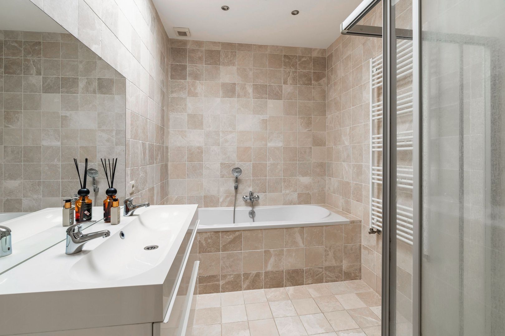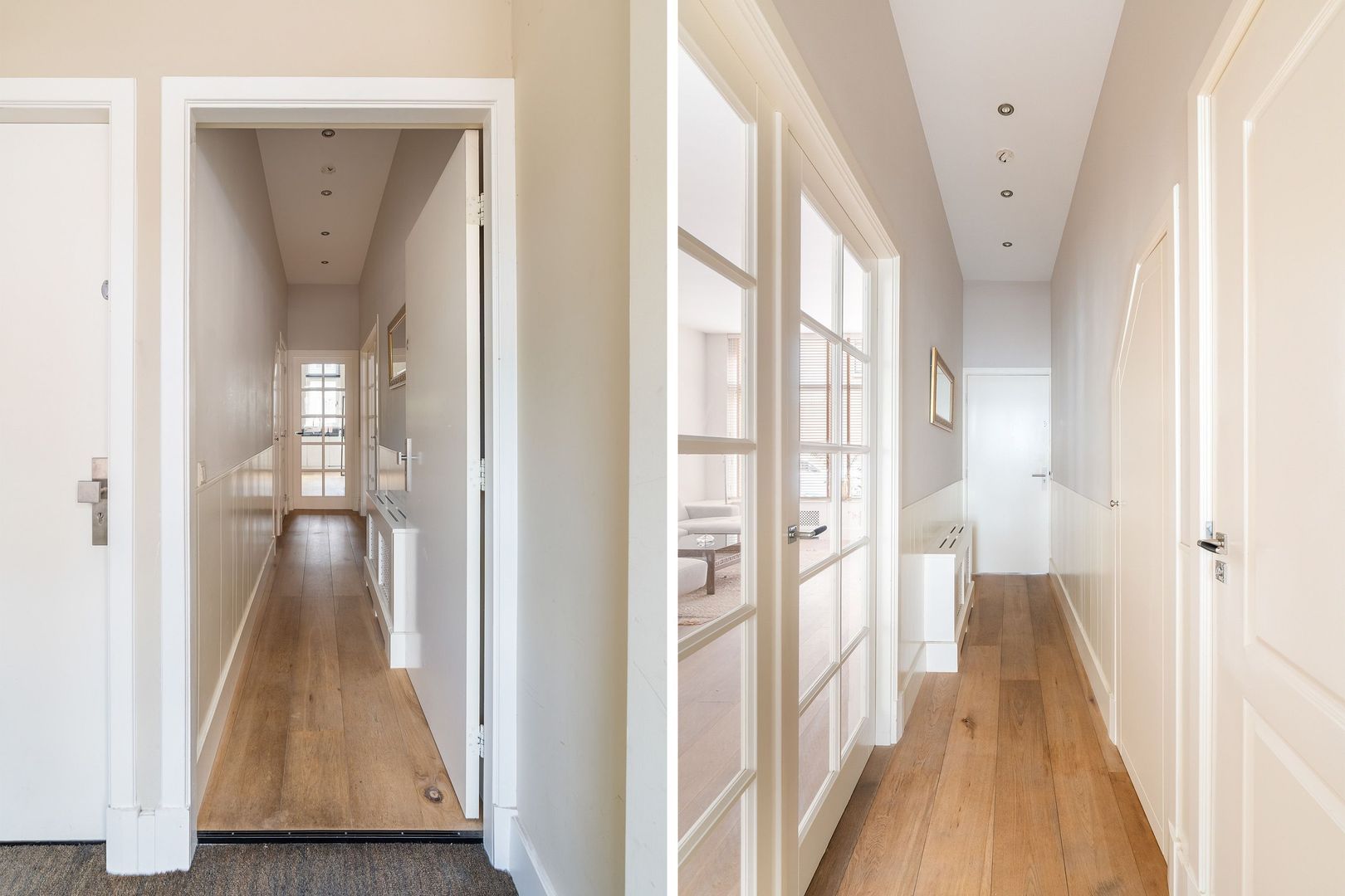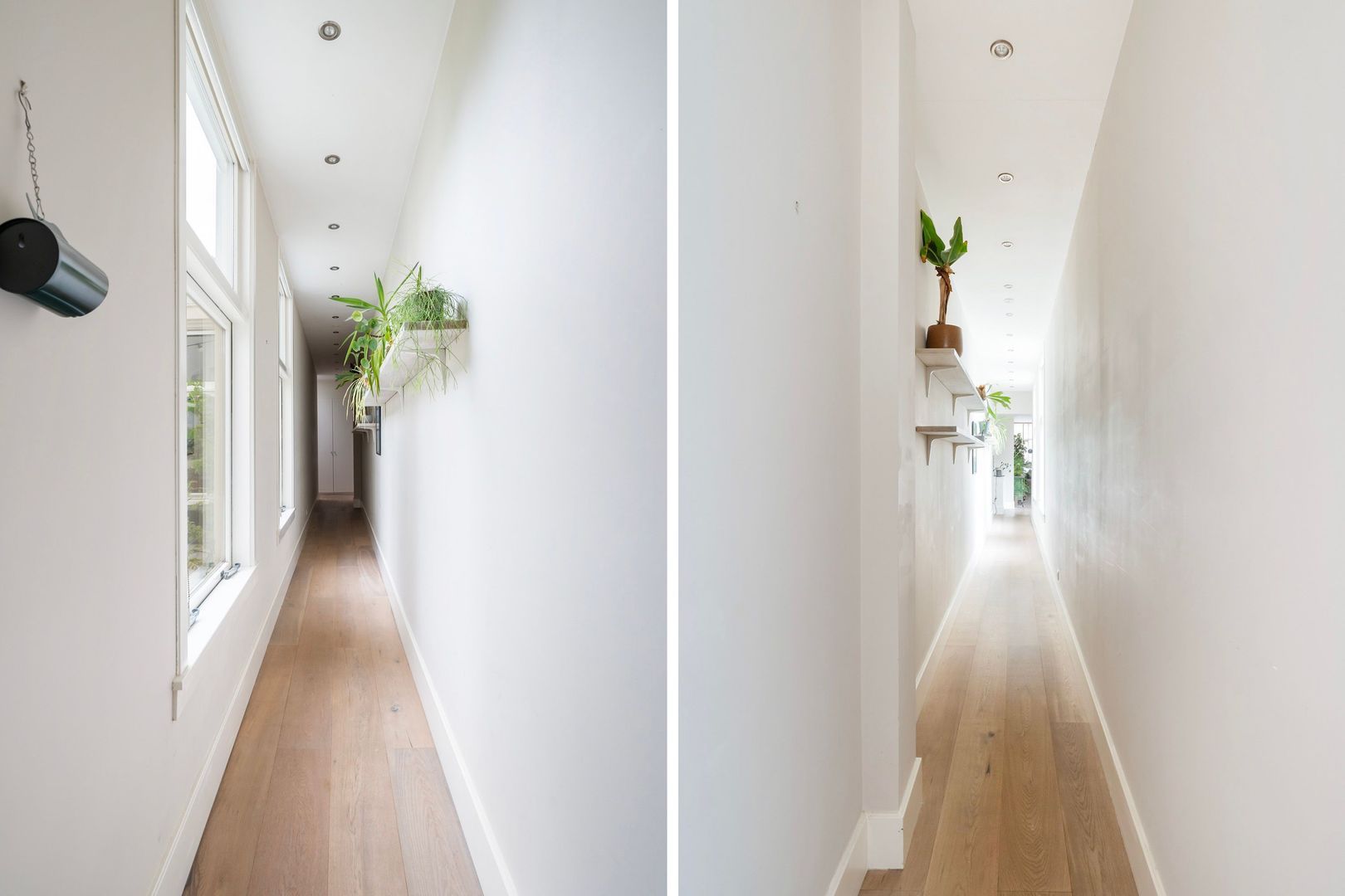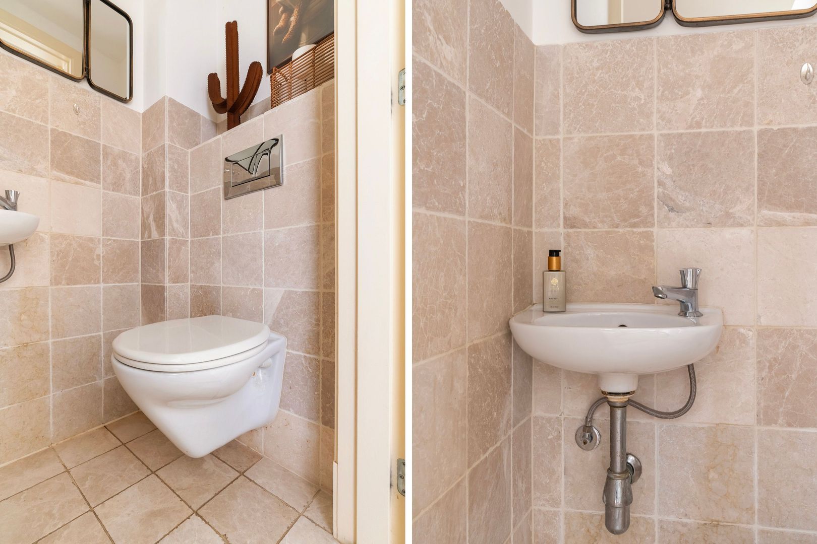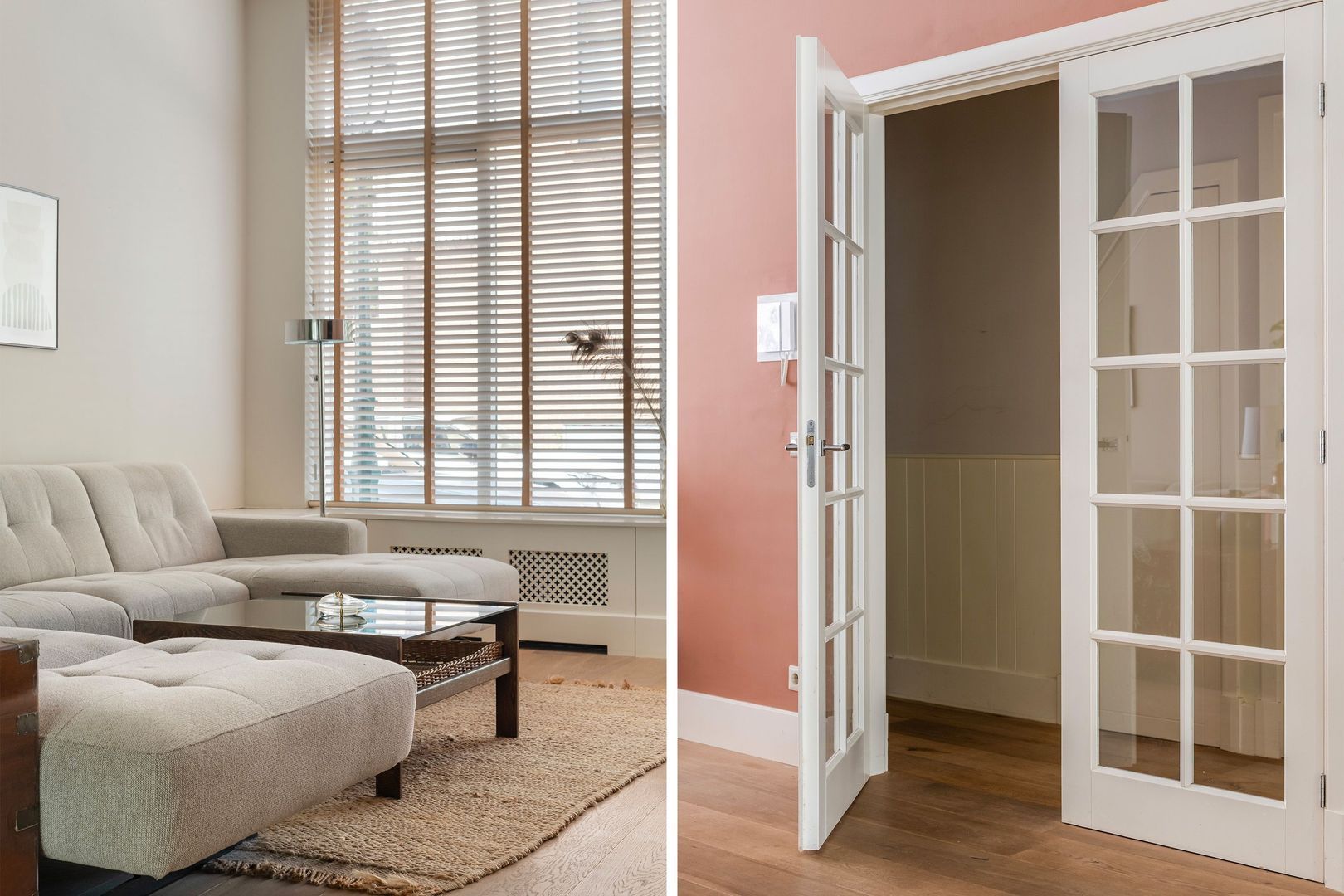 Gemeenschappelijke entree met eigen voordeur; entreehal; toilet met fonteintje; trapkast; ruime doorgebroken woonkamer met openslaande deuren naar de tuin; moderne en royale semi-open keuken met hardstenen aanrecht en Boretti-gasfornuis; gang naar achterbouw met kastenwand; grote slaapkamer met openslaande deuren naar de tuin; tweede slaapkamer met zicht op de tuin; badkamer met ligbad, inloopdouche en dubbele wastafelmeubel; 2e toilet met fonteintje; zonnige patio/tuin met veel privacy.