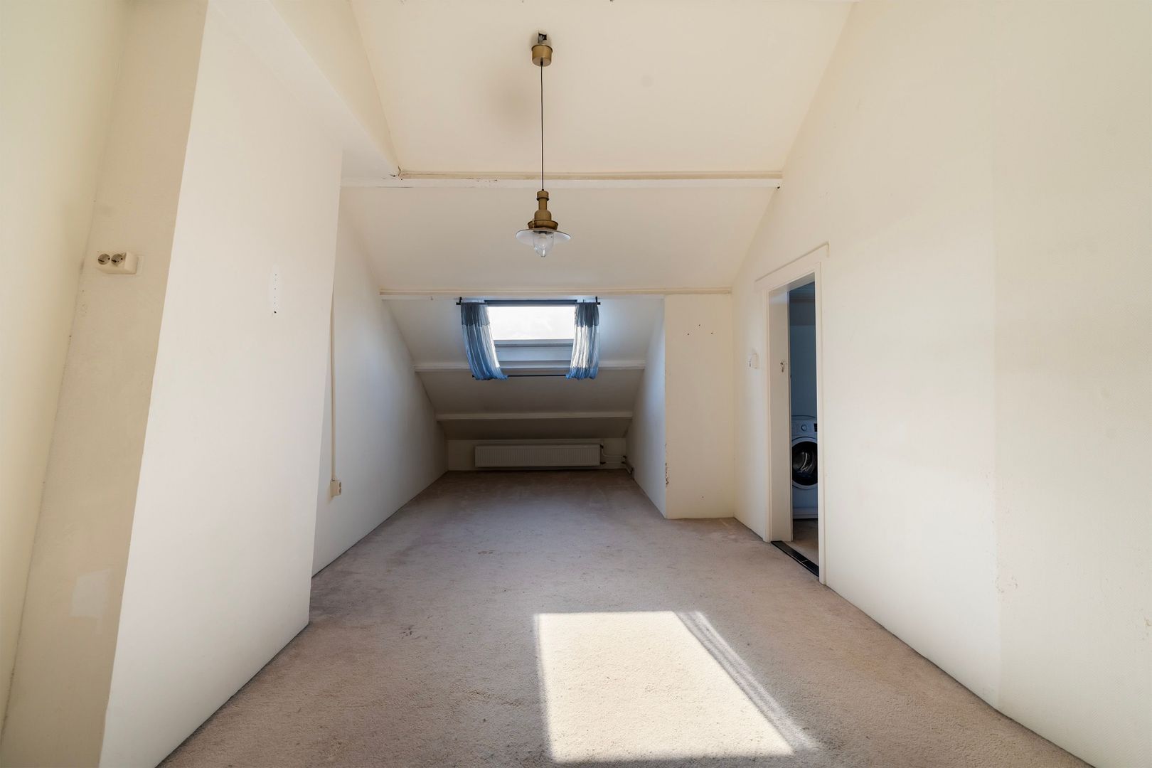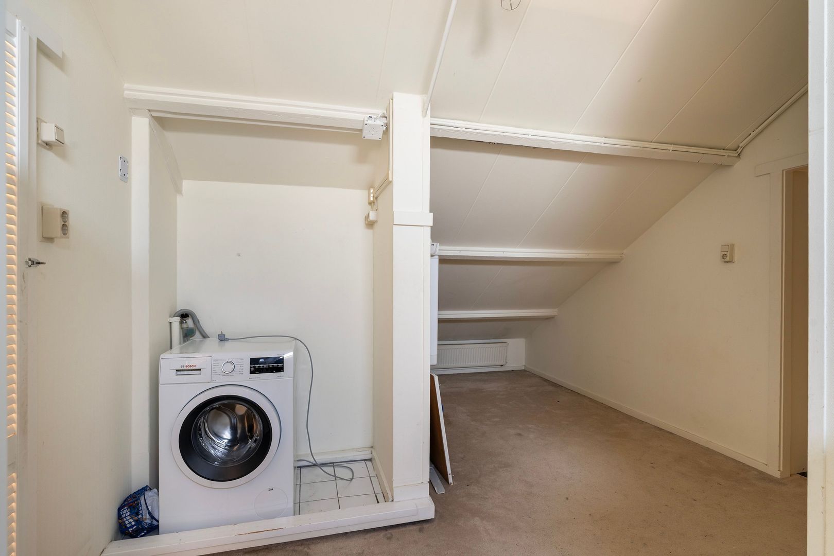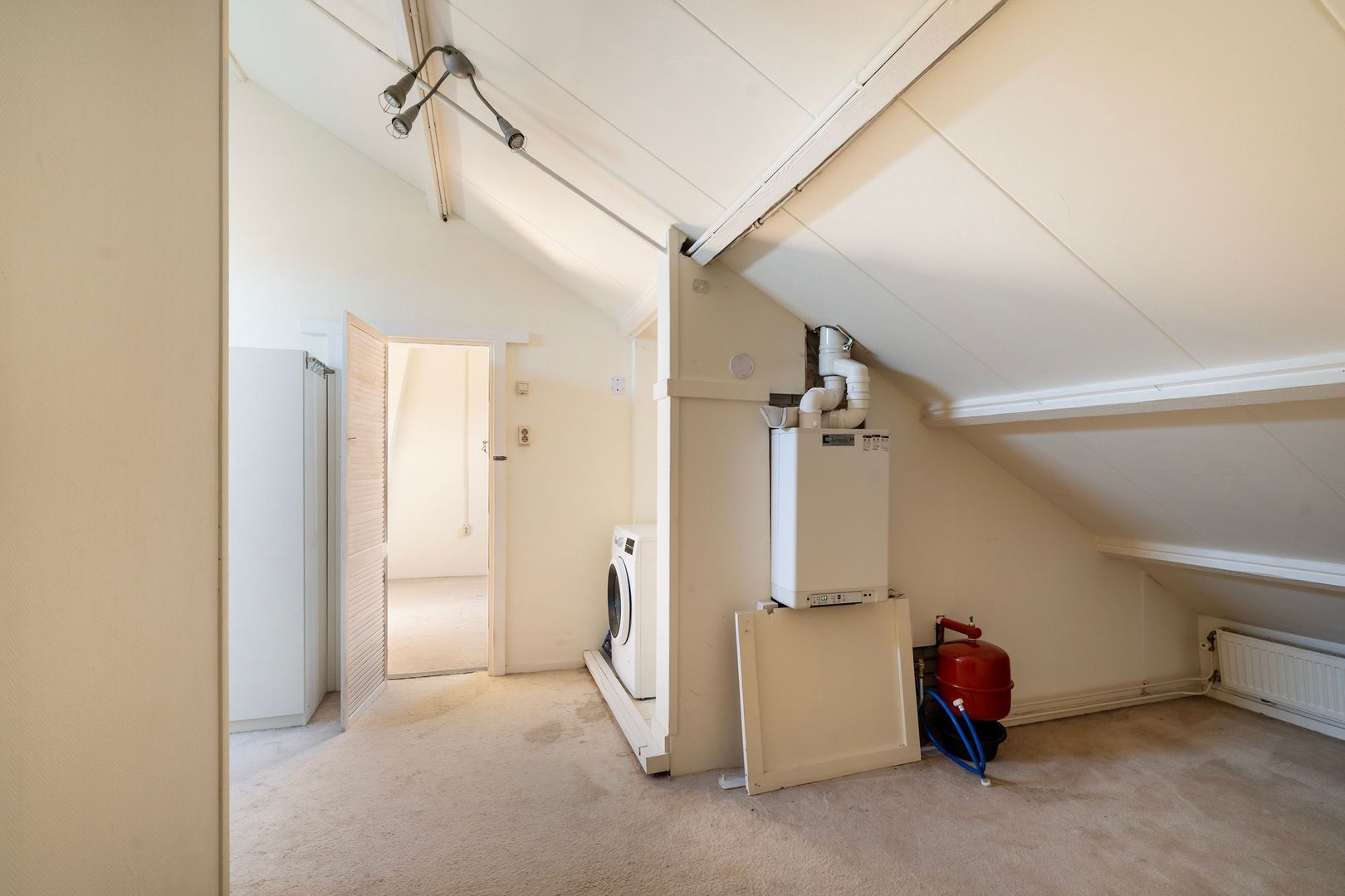 Trap vanuit de gang naar de overloop op de kapverdieping; grote overloop met opstelplaats cv-ketel en de aansluiting voor de wasmachine, dakraam, bergruimte en de mogelijkheid tot het realiseren van een extra slaapkamer; royale 4e slaapkamer met dakraam.