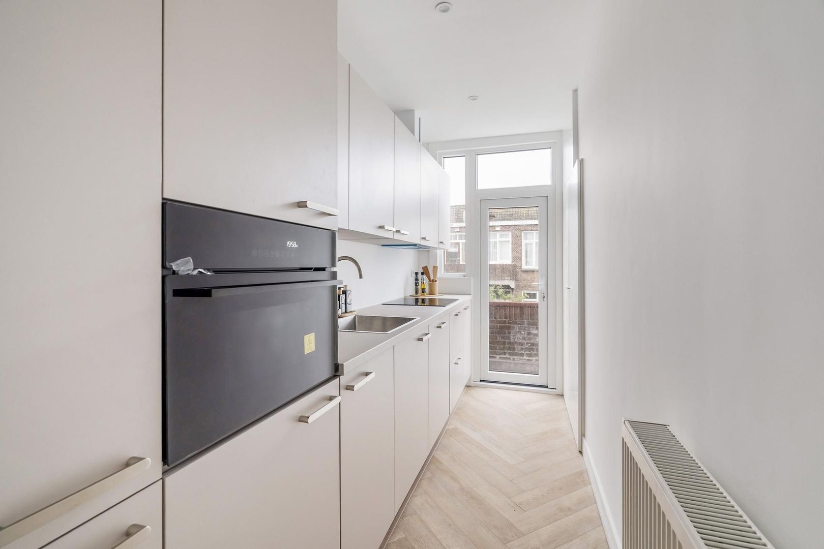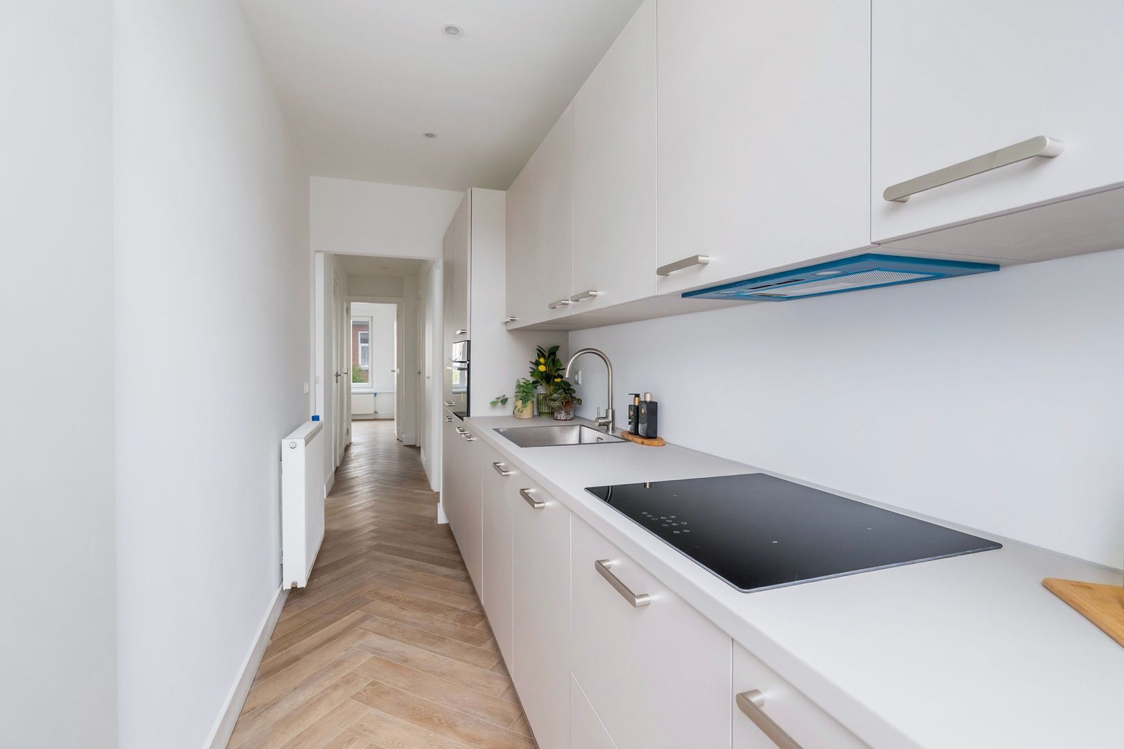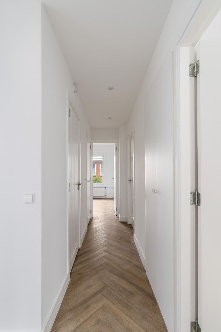 Woningentree via open portiek; hal met meterkast en binnentrap naar de overloop op de 2e etage met vaste kast; ruime woonkamer met vaste kast; moderne keuken welke is voorzien van een inductiekookplaat, afzuigkap, koel-vriescombinatie, combimagnetron/-oven, vaatwasser en toegang tot het balkon; 1e slaapkamer aan de voorzijde; 2e slaapkamer aan de achterzijde; 3e slaapkamer aan de achterzijde; moderne badkamer met inloopdouche en een wastafelmeubel; modern separaat toilet met fonteintje;