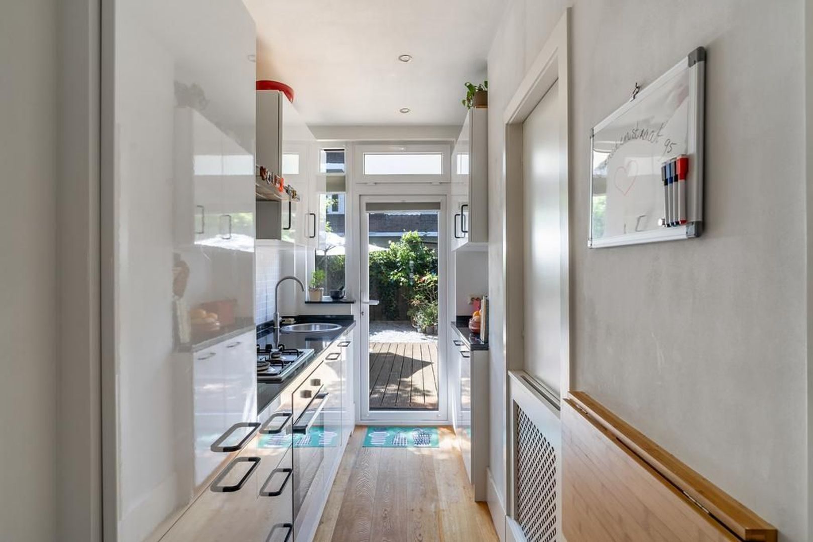 Woningentree vanuit de voortuin; tochtportaal; gang met royale vaste kast met wasmachine aansluiting; modern toilet met fontein; ruime woonkamer; moderne keuken met een natuurstenen aanrechtblad, 4-pits gaskookplaat, afzuigkap, oven, koelkast, vriezer, vaatwasser en toegang tot de achtertuin; 1e slaapkamer aan de voorzijde; 2e slaapkamer aan de achterzijde met vaste kast; 3e slaapkamer aan de achterzijde met openslaande deuren naar de achtertuin; moderne badkamer met een ruime inloopdouche en een wastafelmeubel; achtertuin met ochtend - en middag zon en een houten berging;