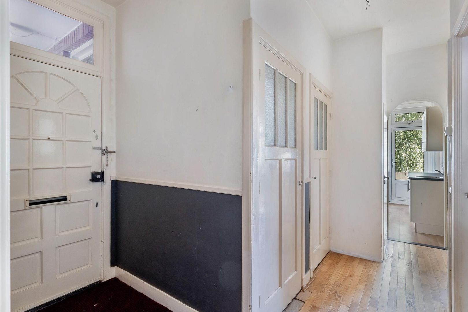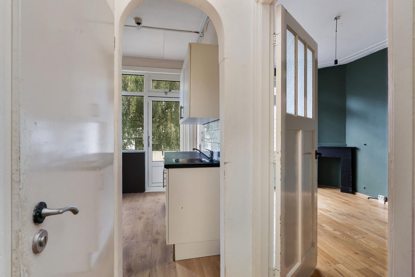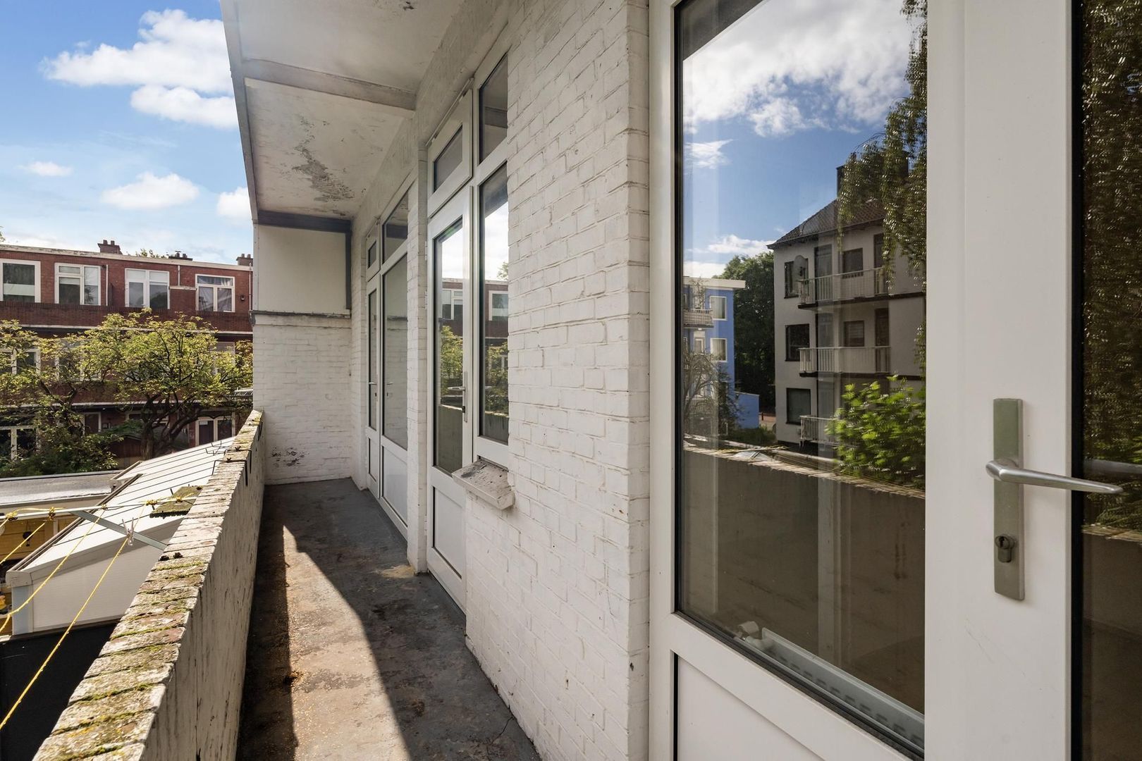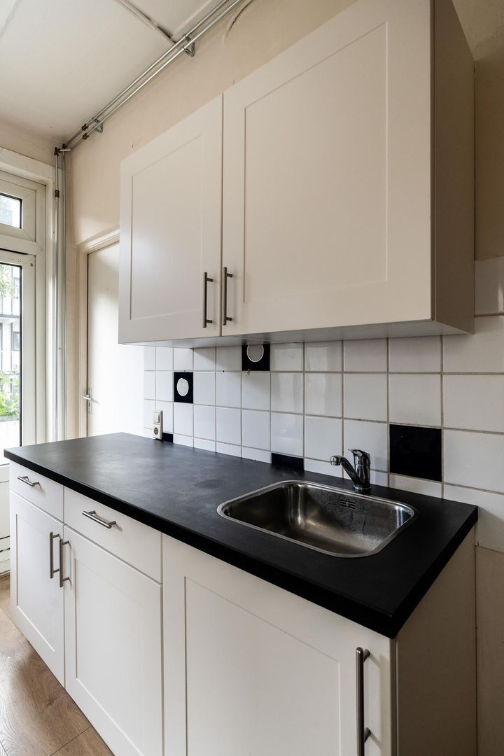 Open portiek; entree woning op de eerste etage; gang; woonkamer met erker; voorzijkamer; royale achterkamer met deur naar het balkon; de 3e slaapkamer is toegankelijk via de keuken en heeft een deur naar het balkon; eenvoudige keuken met deur naar het balkon; nette badkamer met toilet, wastafel en inloopdouche; balkon aan de achterzijde over de hele breedte met balkonkast.